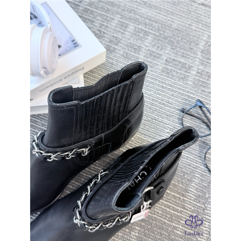 首頁 精品女鞋 CHANEL香奈兒 黑色皮穿鏈雙C 切爾西靴 39.5碼 全新