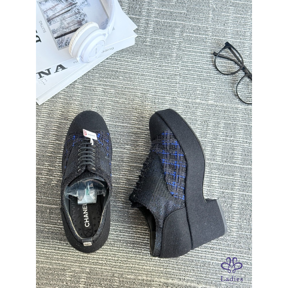 CHANEL香奈兒 黑藍厚底粗花呢坡跟鞋 37碼 成色如圖