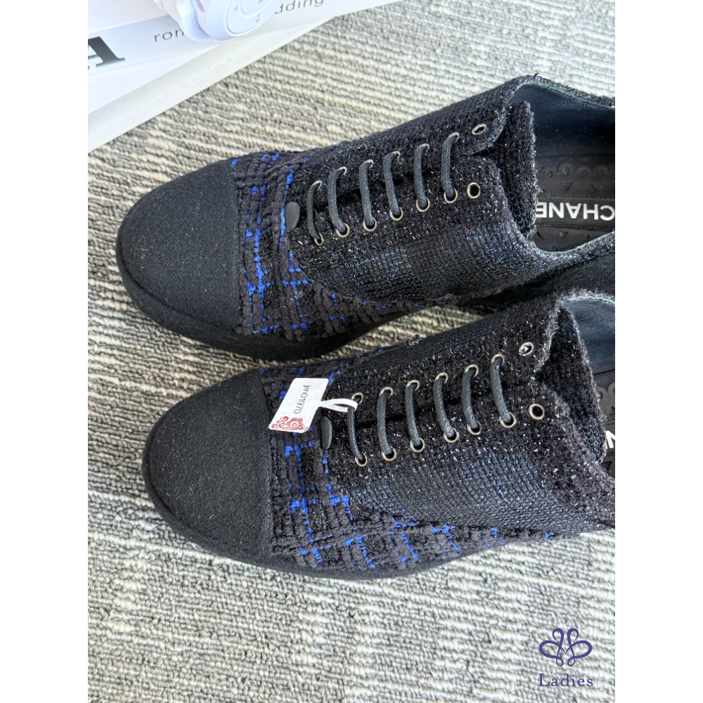 首頁 精品女鞋 CHANEL香奈兒 黑藍厚底粗花呢坡跟鞋 37碼 成色如圖