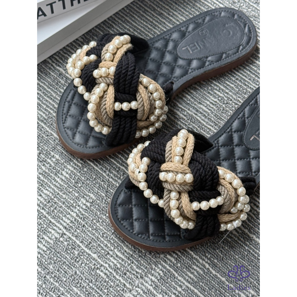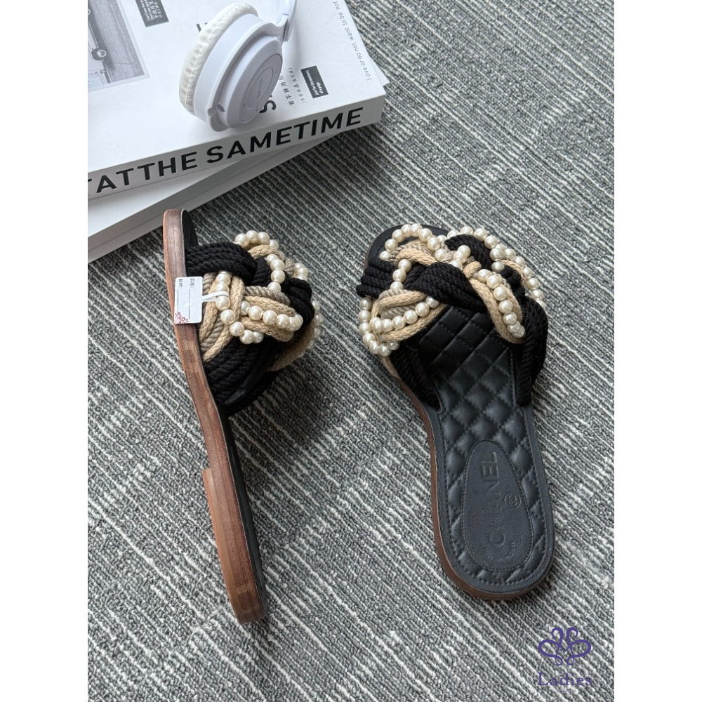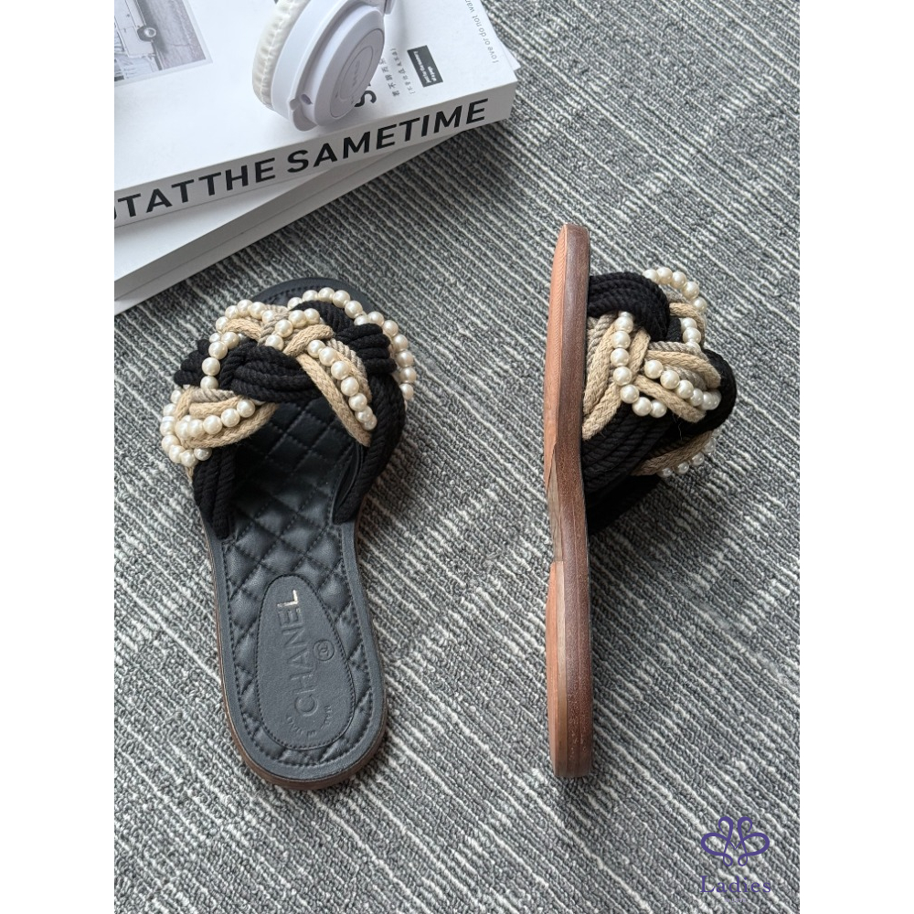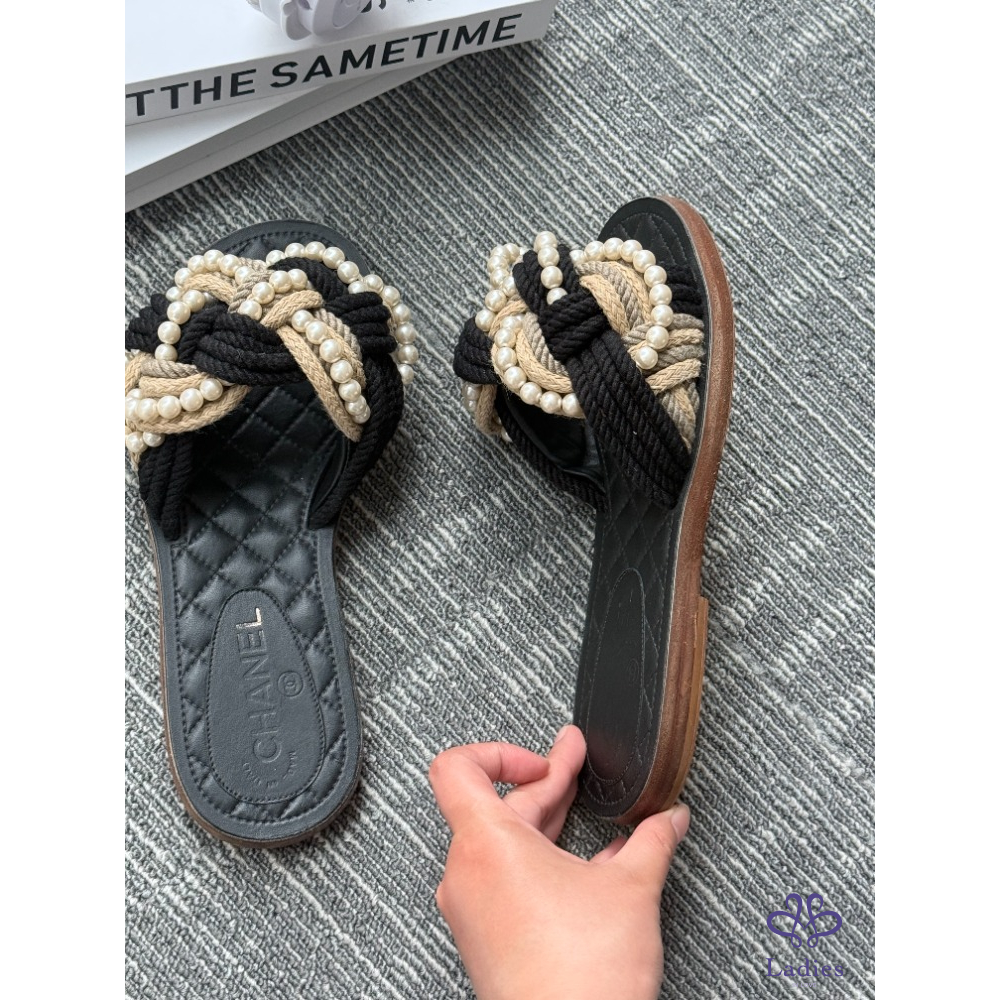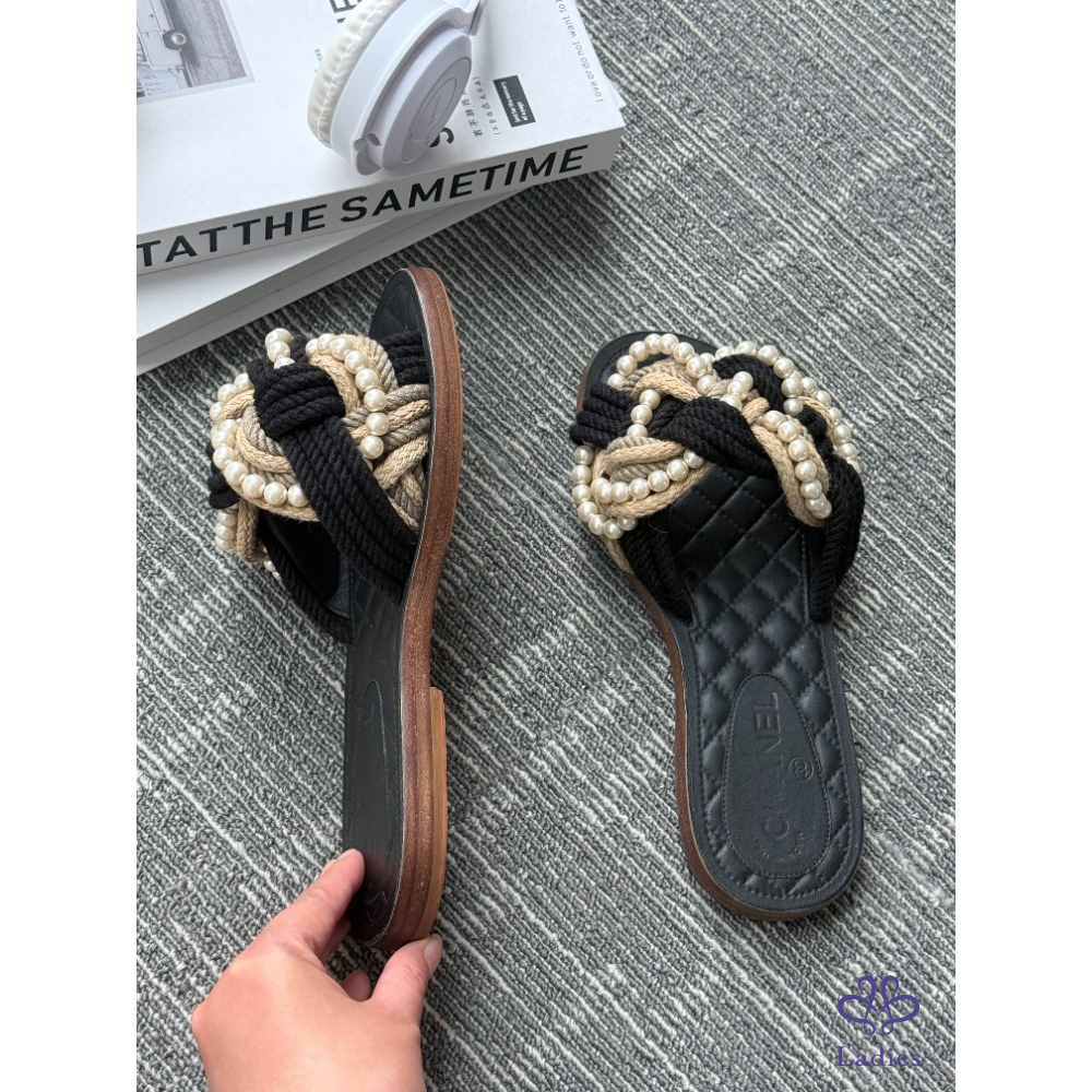 首頁 精品女鞋 CHANEL香奈兒 黑色珍珠牛皮涼拖 36碼 成色如圖