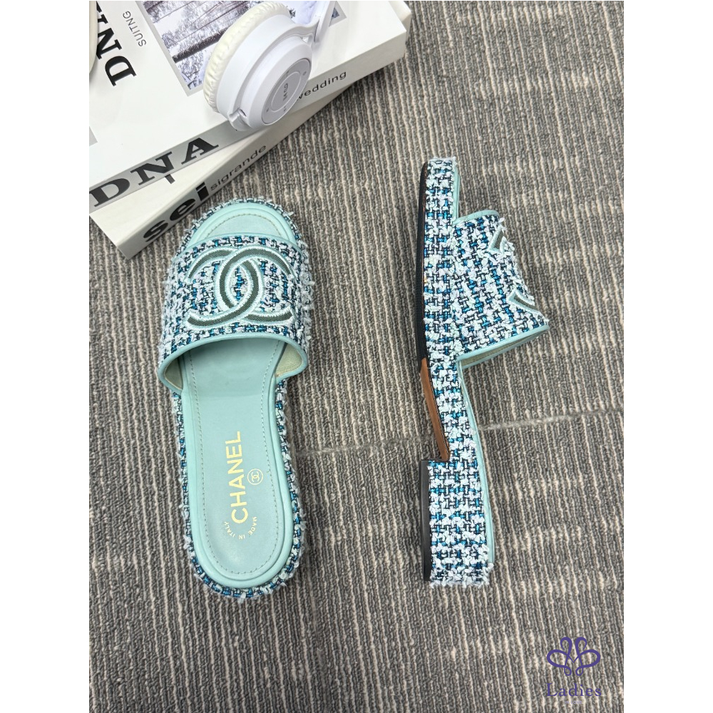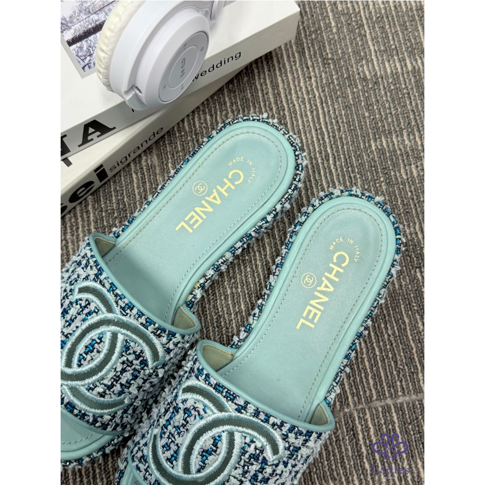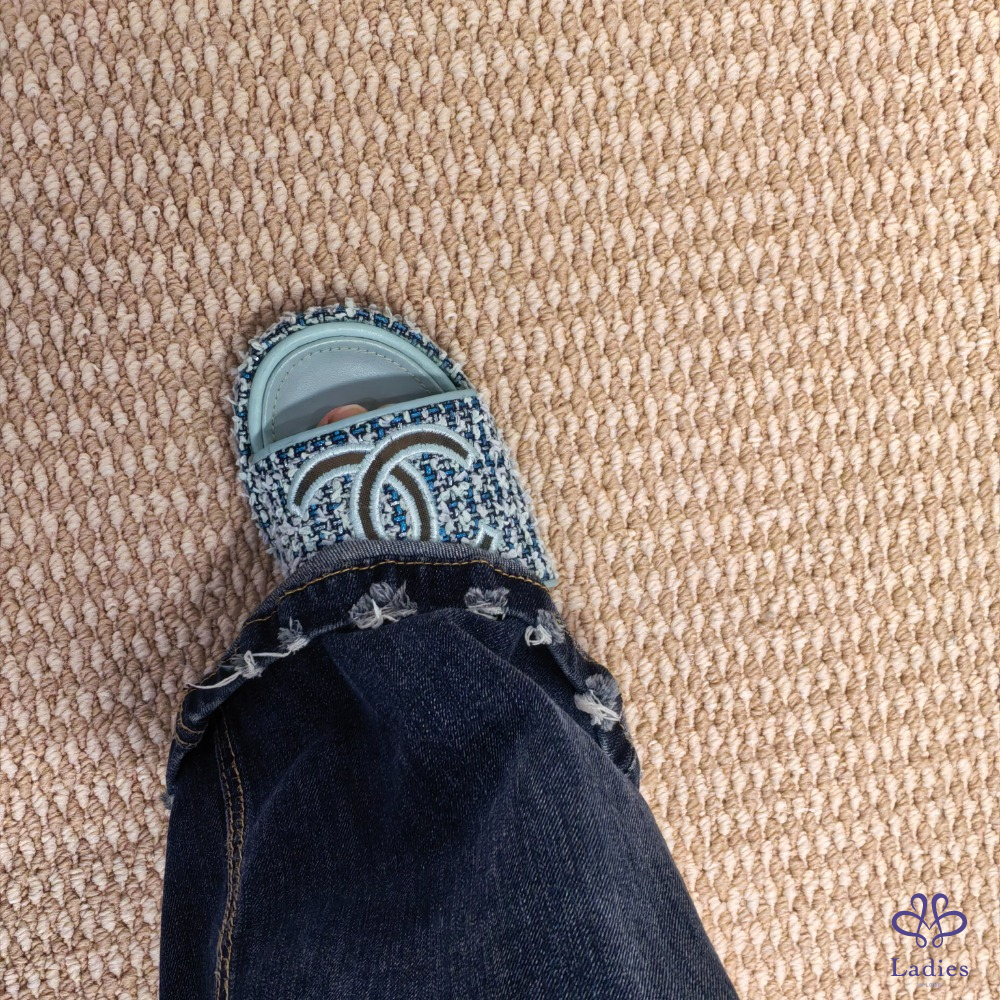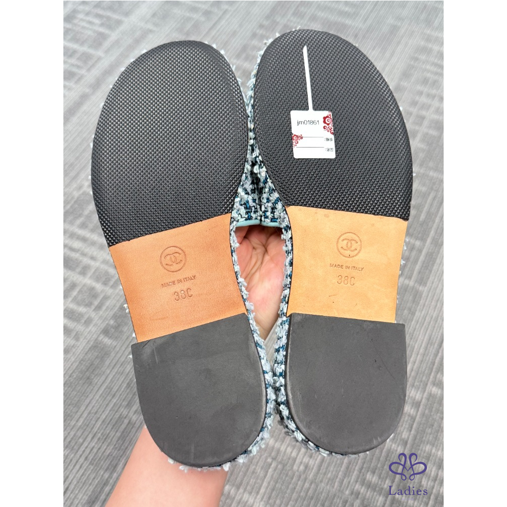 CHANEL香奈兒 藍色粗花呢 雙C拖鞋 38碼 成色如圖