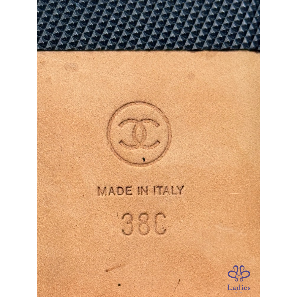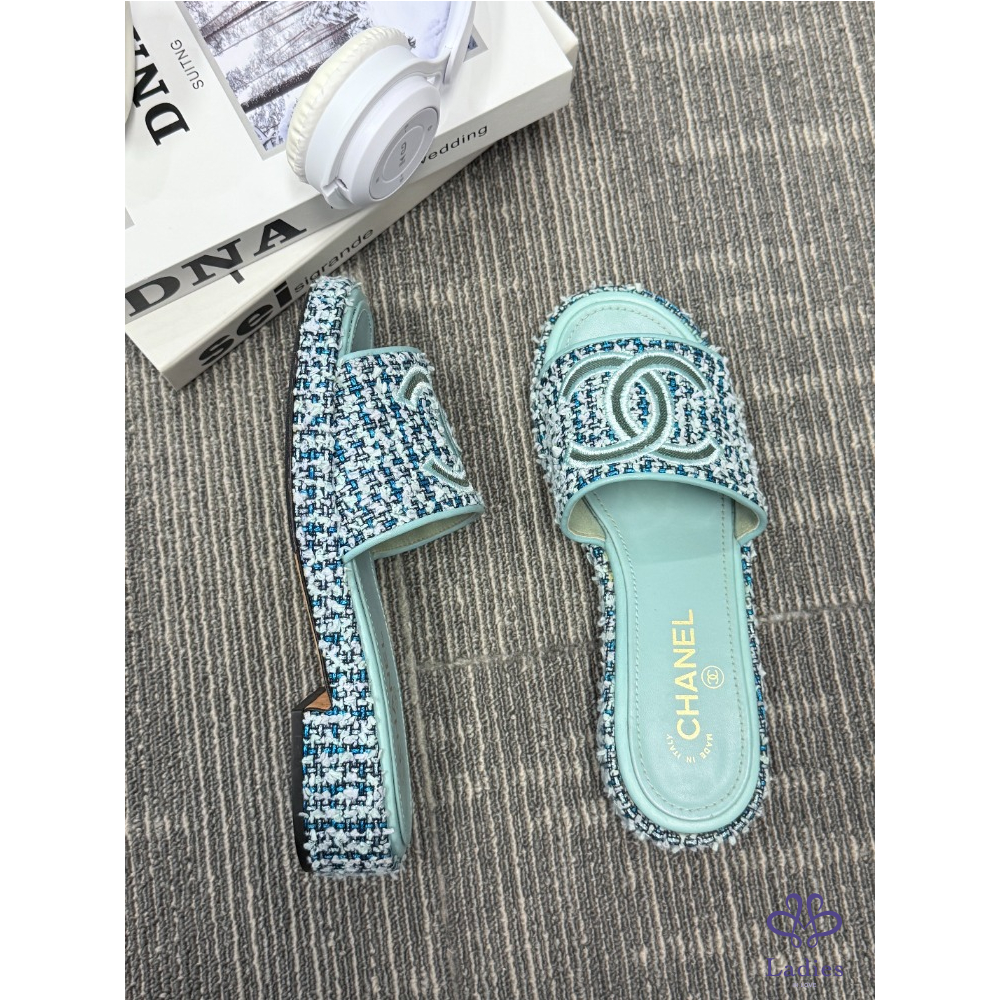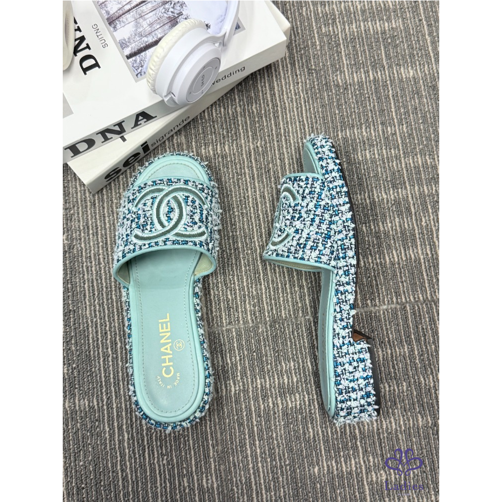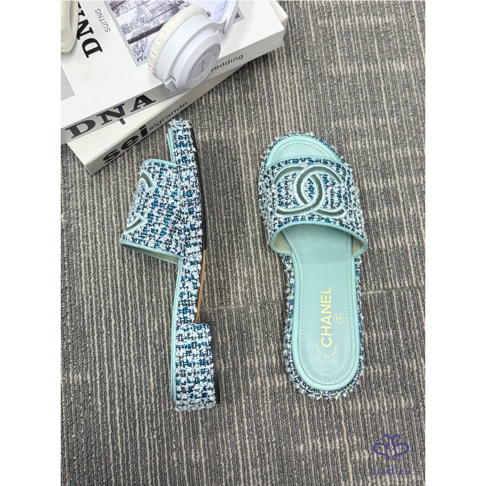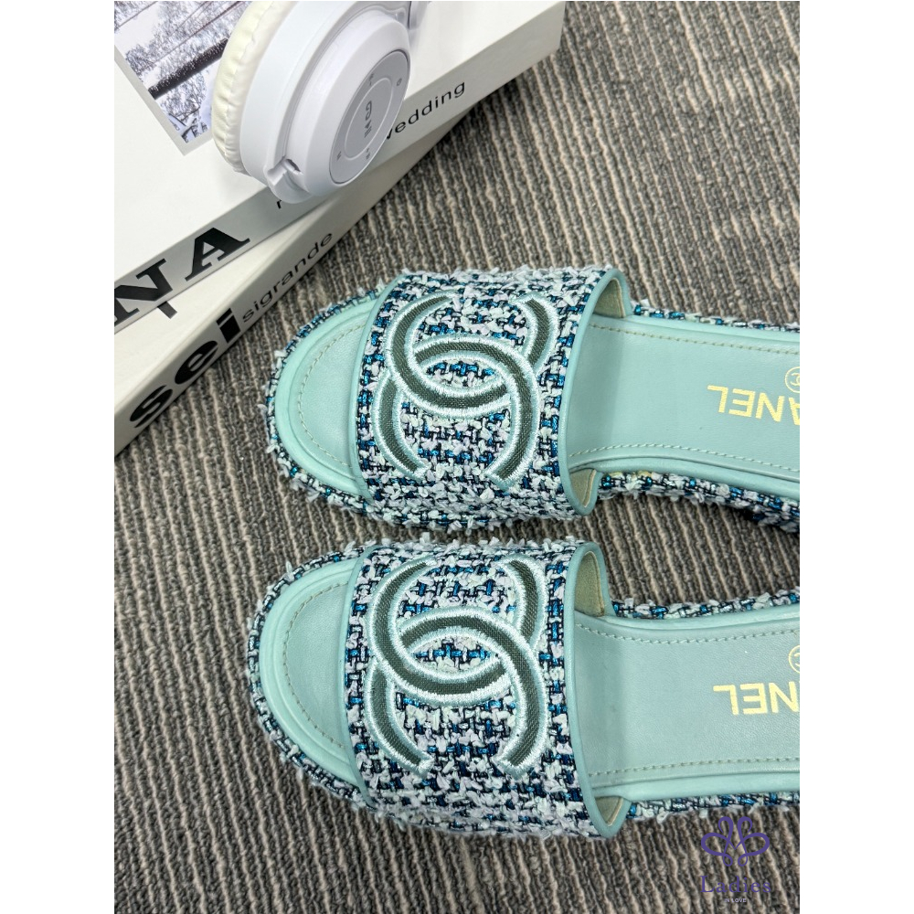 CHANEL香奈兒 藍色粗花呢 雙C拖鞋 38碼 成色如圖