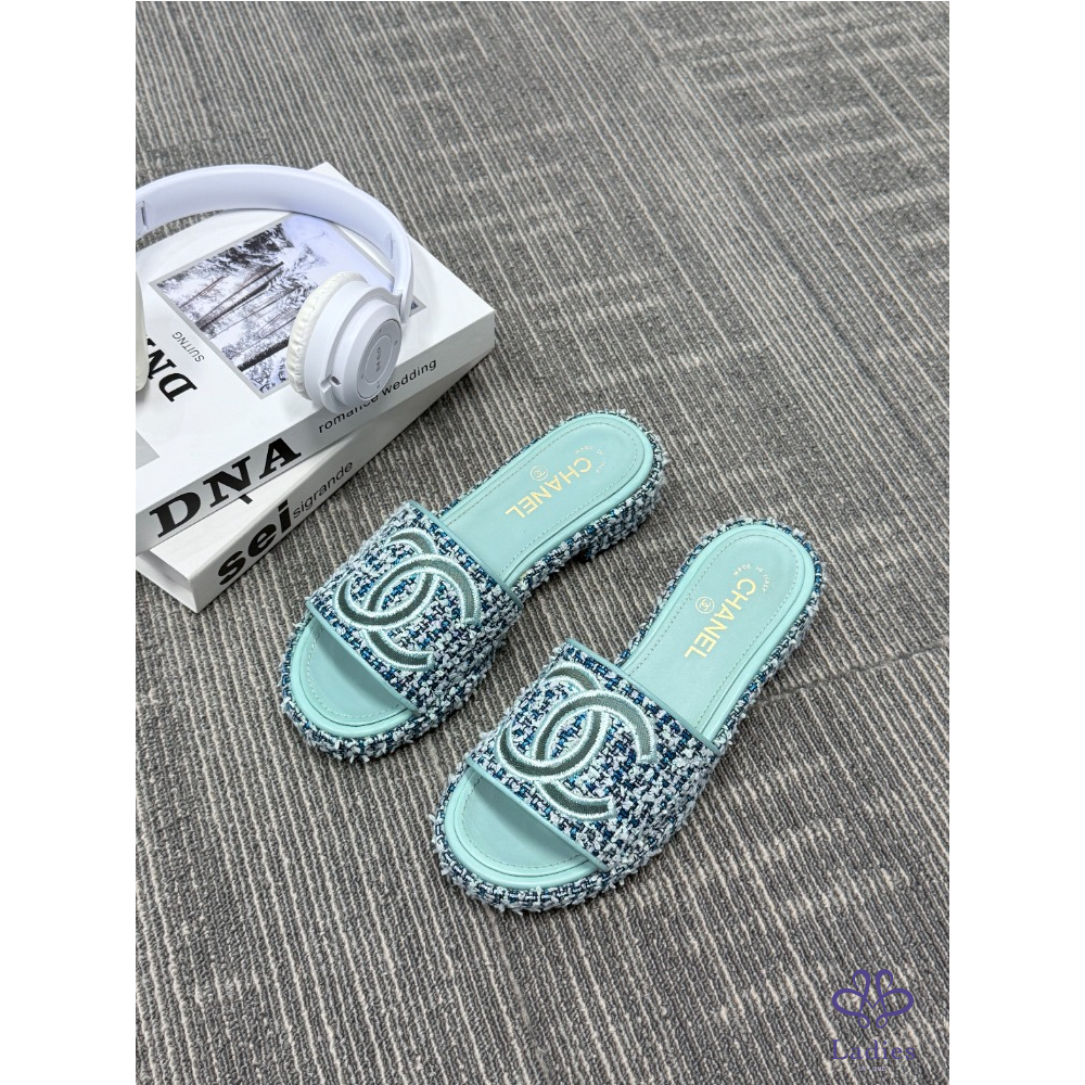 首頁 精品女鞋 CHANEL香奈兒 藍色粗花呢 雙C拖鞋 38碼 成色如圖
