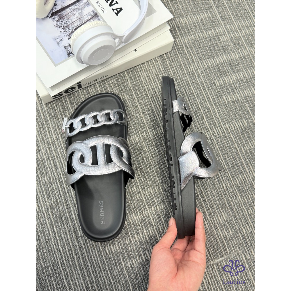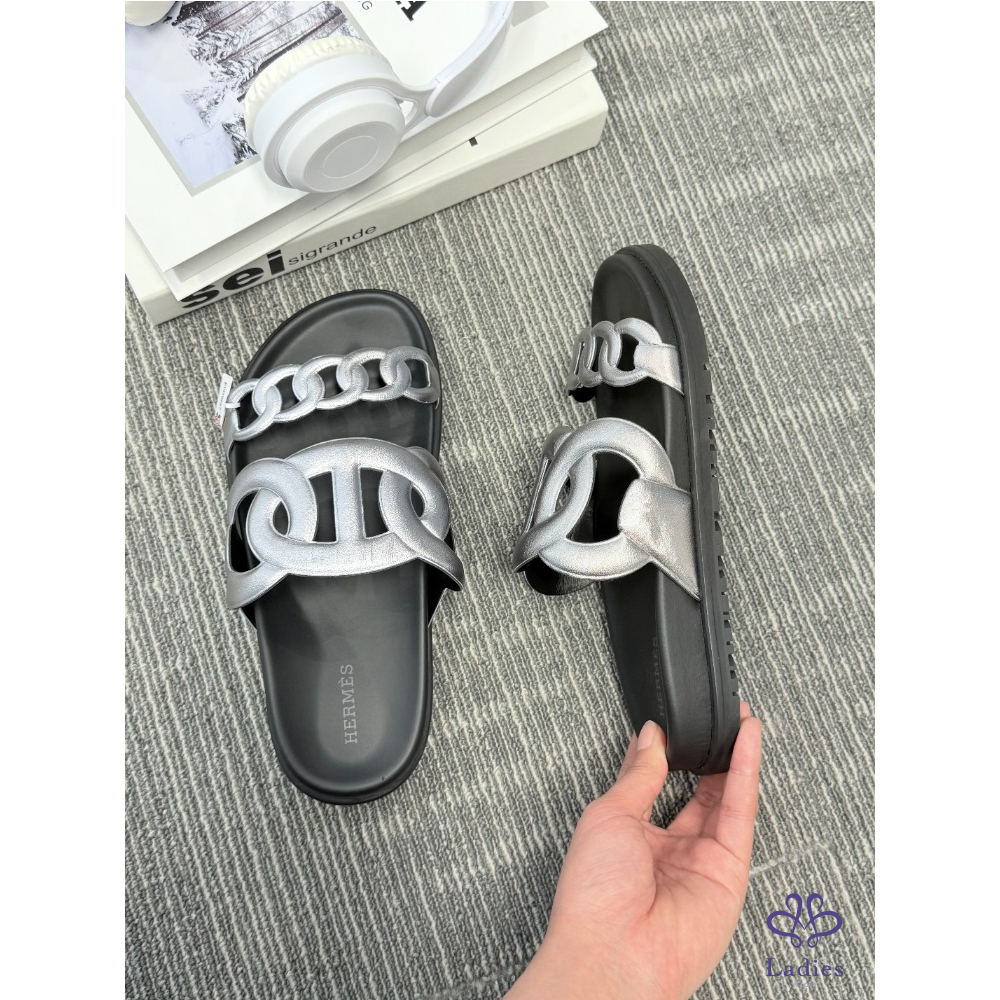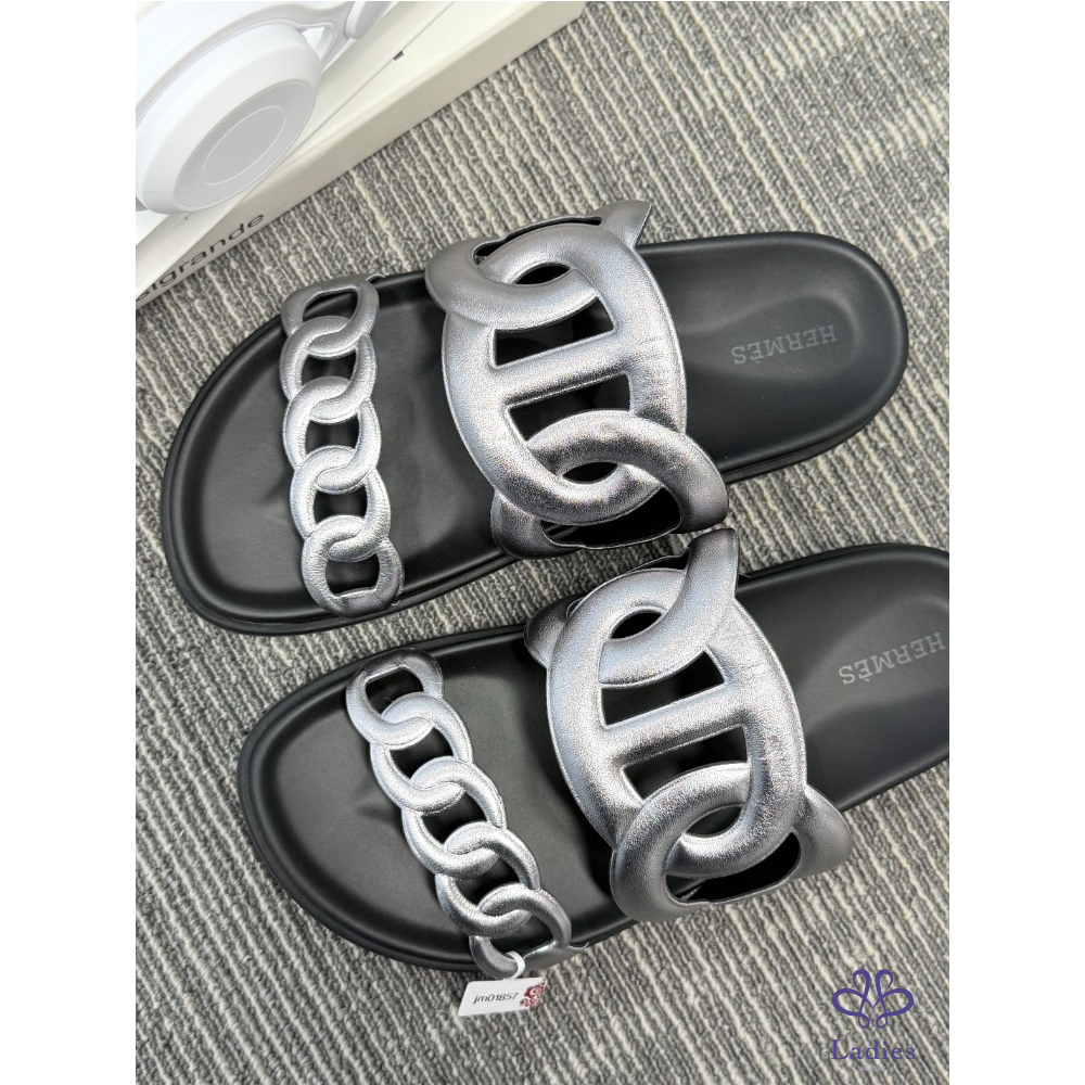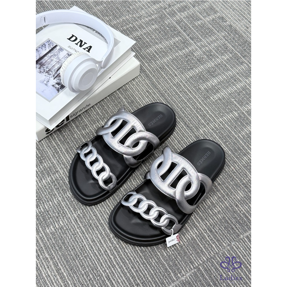 首頁 精品女鞋 HERMES愛馬仕 黑銀豬鼻子 二舅拖 37碼 成色如圖