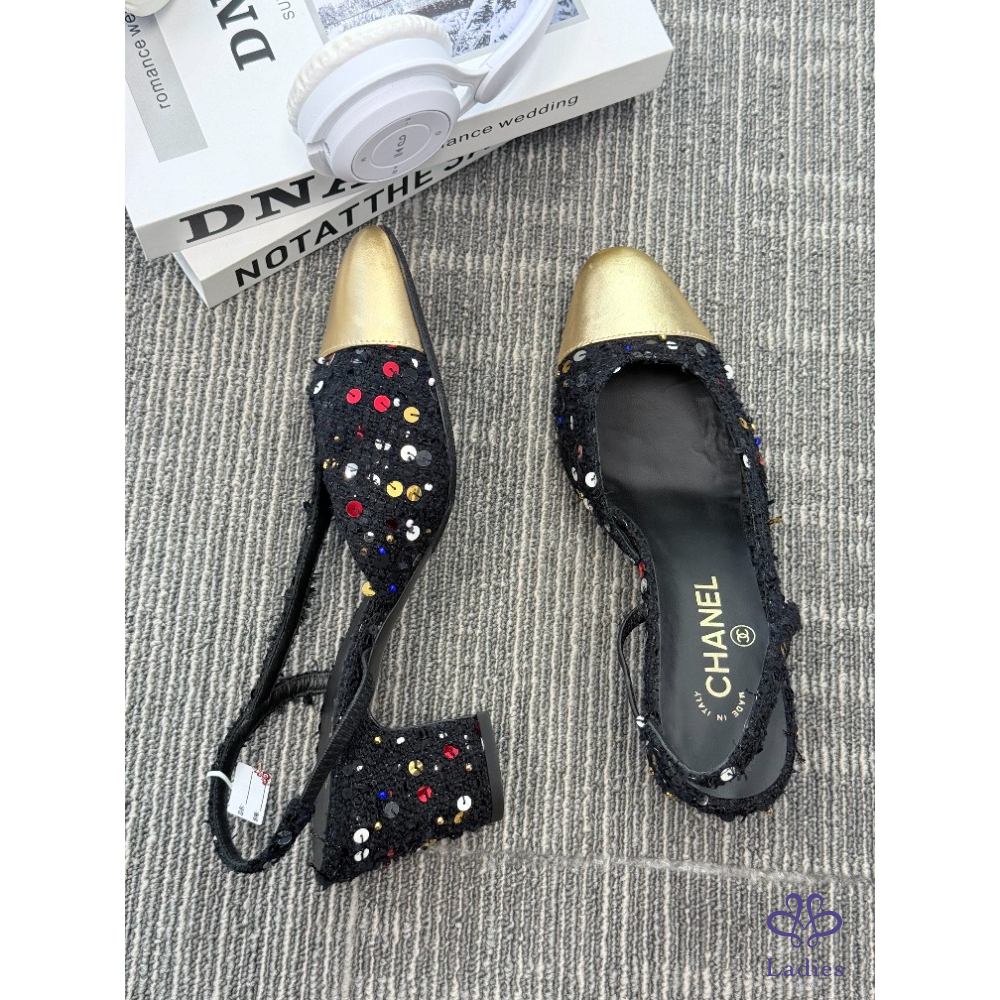 CHANEL香奈兒 黑金閃片 粗花呢 slingblack高跟鞋 39碼 成色如圖