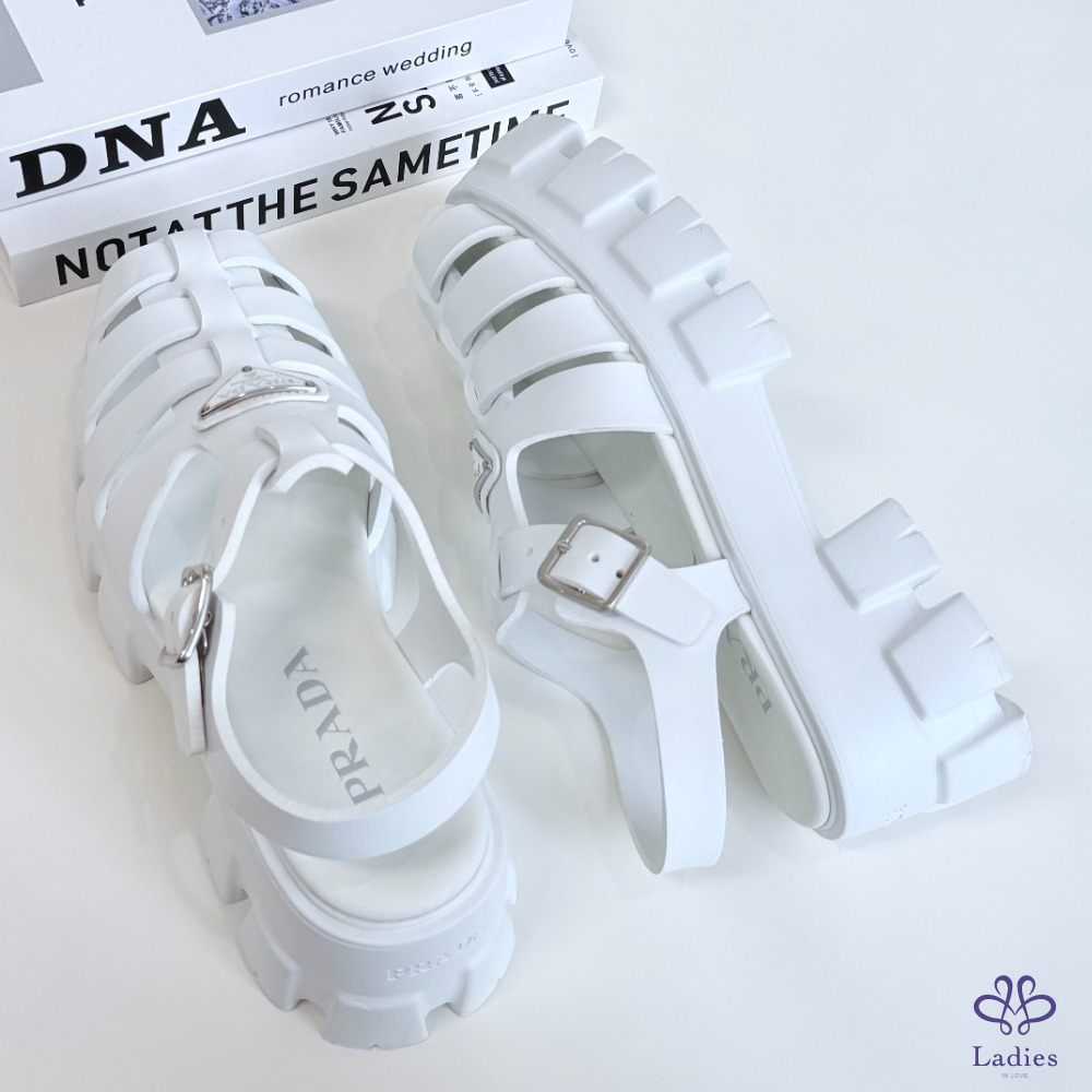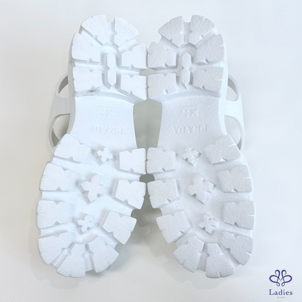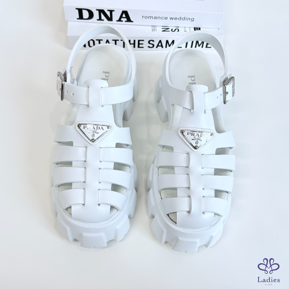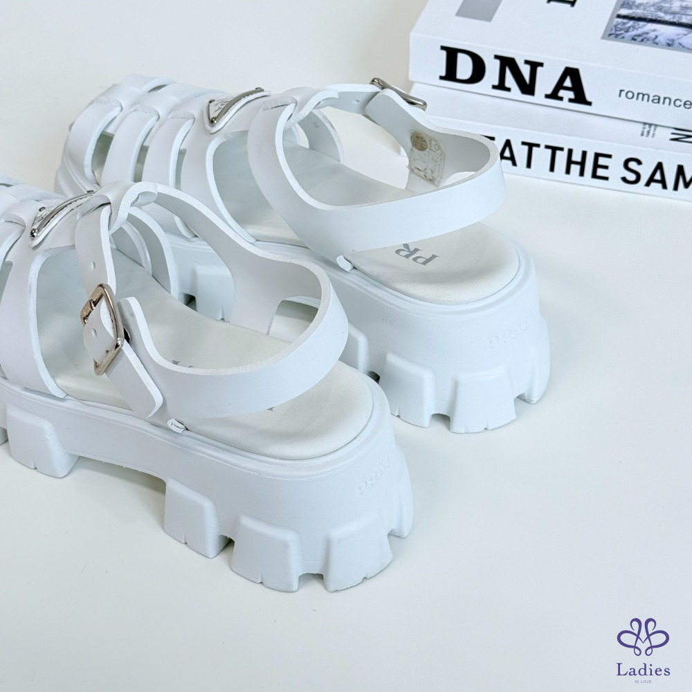 首頁 精品女鞋 PRADA 普拉達白色三角標厚底羅馬涼鞋 38碼 如圖描述