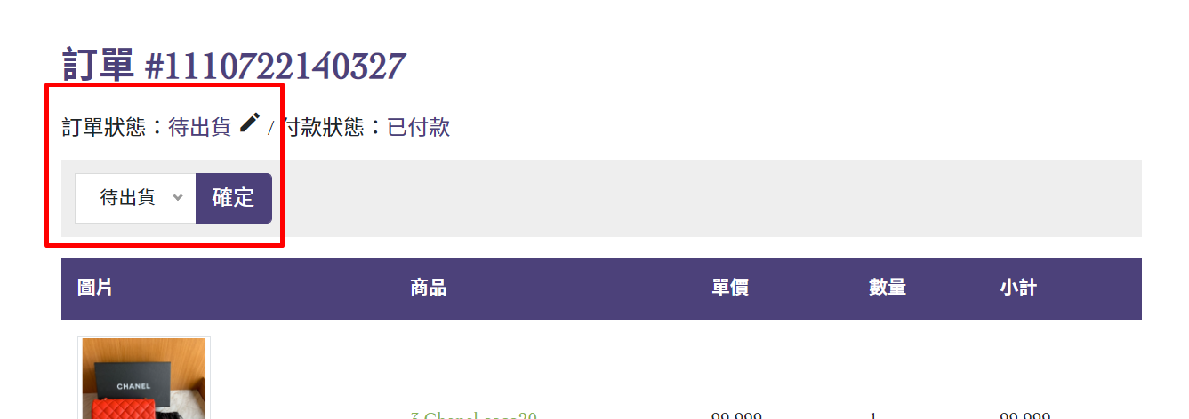 2. 訂單頁面最上方會有很大的紫色標示訂單編號,接著下方會有訂單狀態,待出貨改成已出貨,並填上日期以及物流單即就完成了