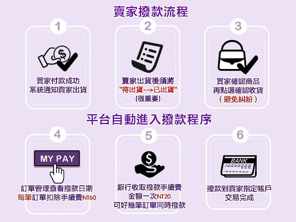 建議賣家在申請My pay特店後,再進行商品刊登與交易,因為有My pay特店賣家可以如期地接受My pay系統的撥款入帳,省去等侯人工撥款的時間。