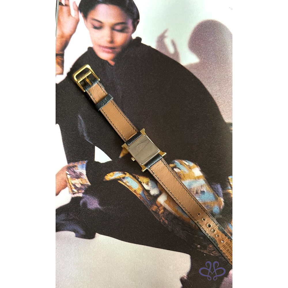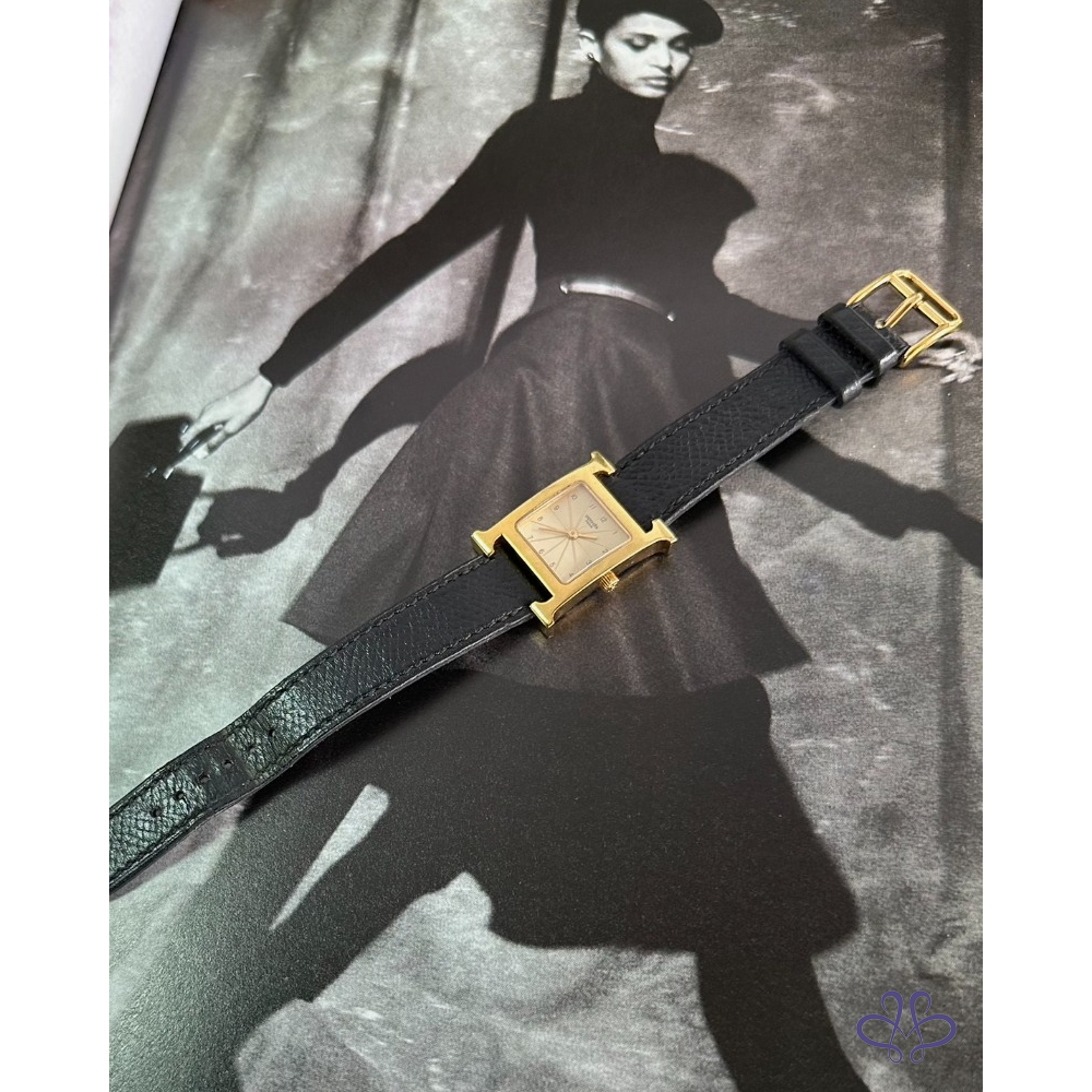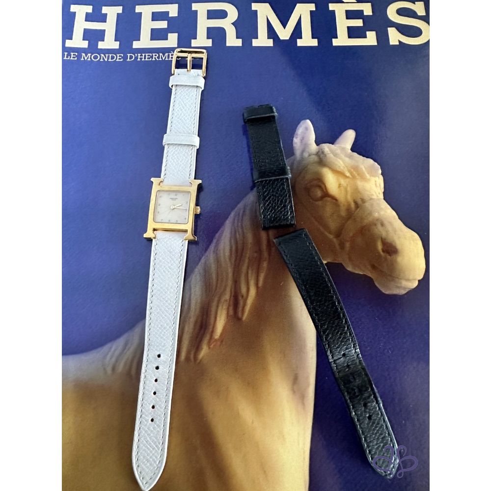 ~HERMES 附原廠盒+二條原廠錶帶 H金框黑色+白色(未使用)錶帶 手錶