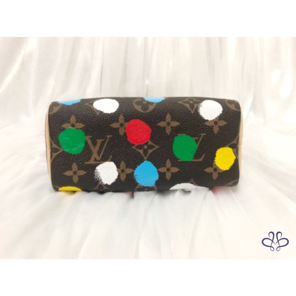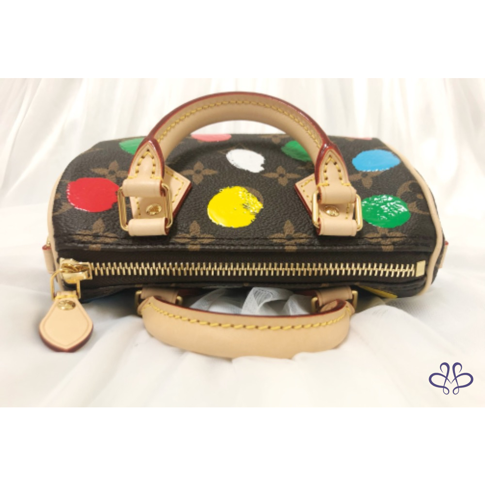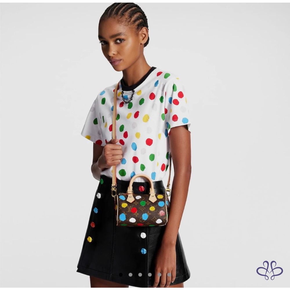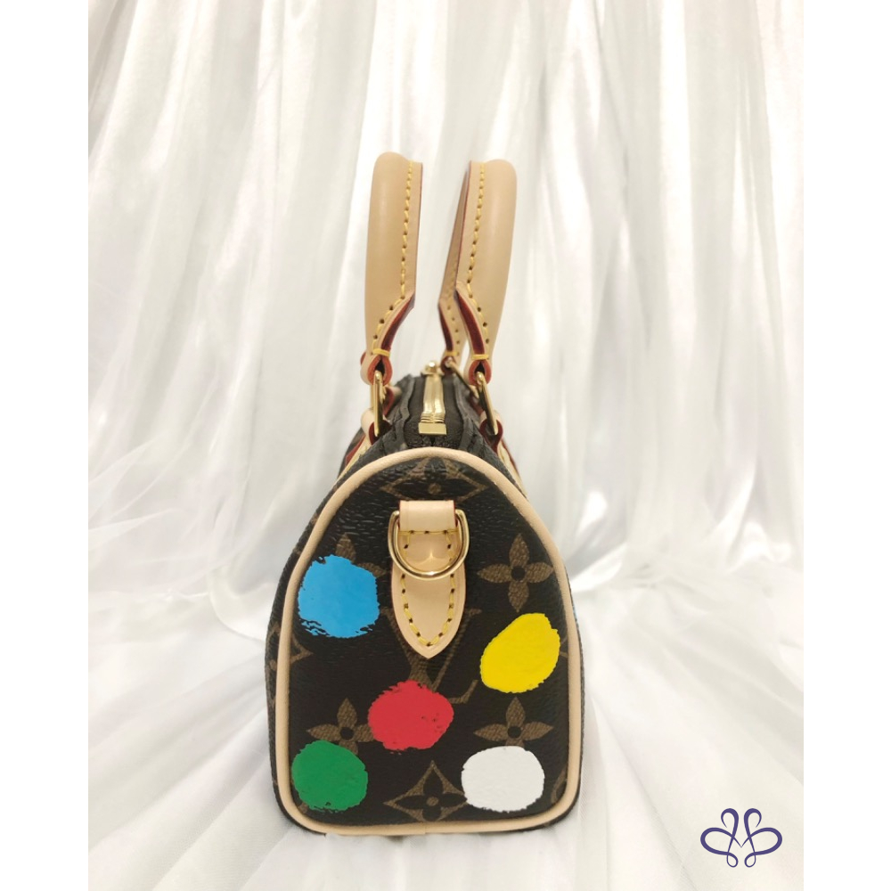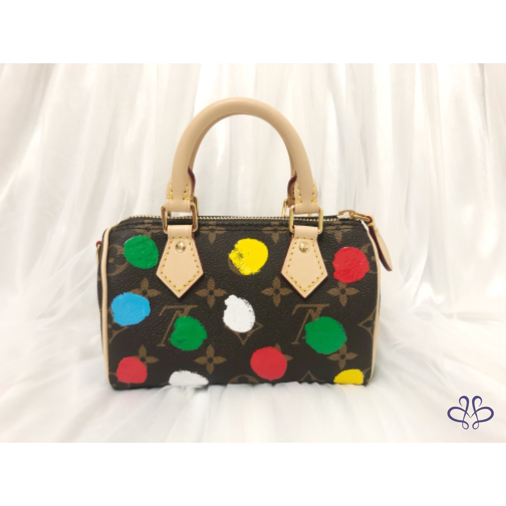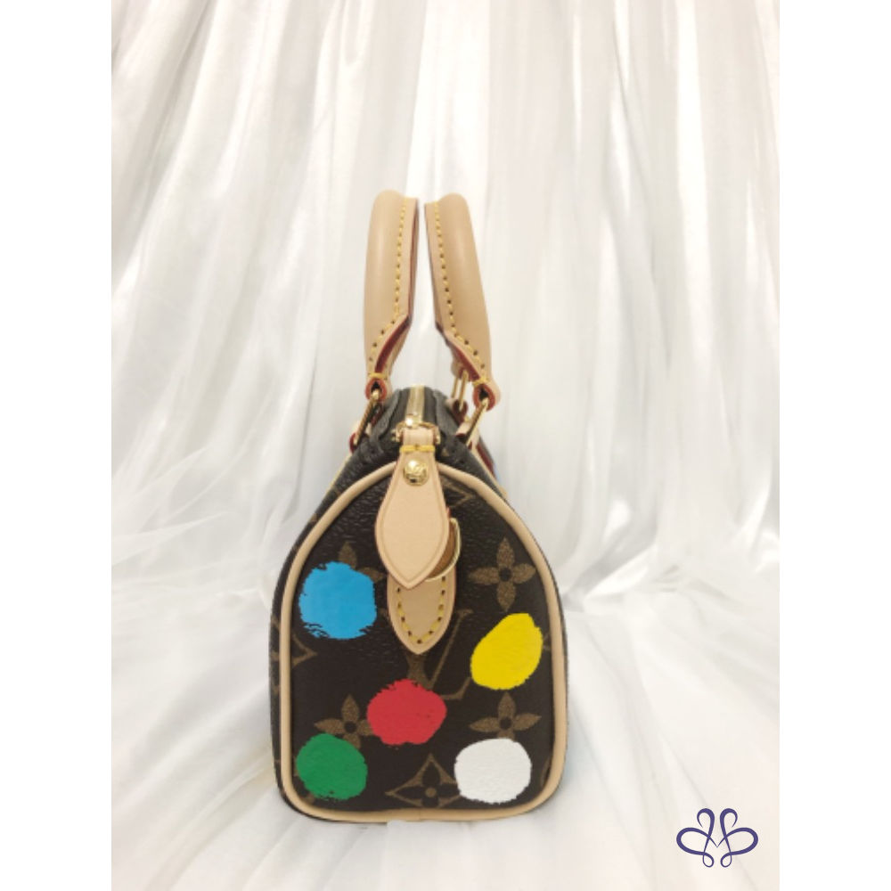 Nano speedy 是櫃上長期缺貨爆款,本款 LV x YK Nano Speedy 手袋出自路易威登 x 草間彌生合作系列,歌頌創意藝術和精湛工藝的矚目融合。波點圖案是日本藝術家草間彌生的視覺名片,此次經由絲印工藝鋪陳 Monogram 帆布,靈動繽紛恰似手工繪制。