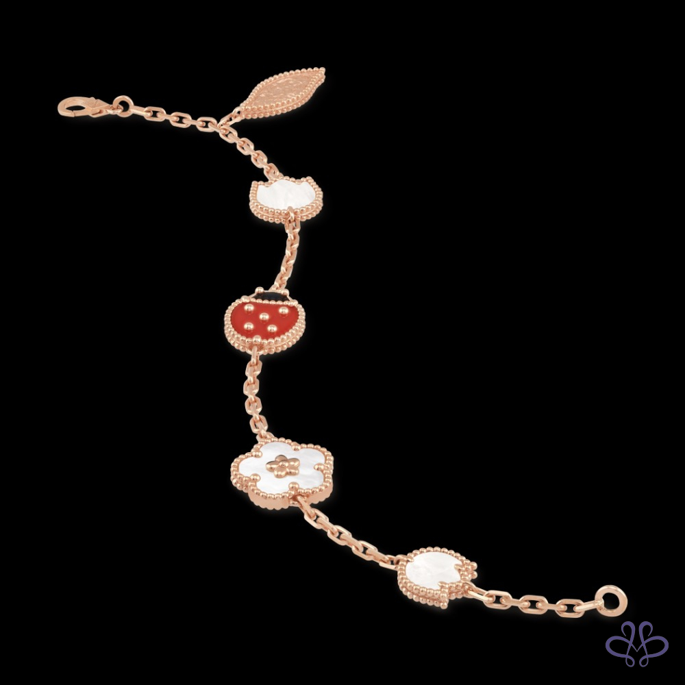 Van Cleef & Arpels梵克雅寶隆重呈獻以小瓢蟲和花卉圖騰為主題的Lucky Spring®系列,頌揚春季萬象更新,向世家珍愛的季節致敬。作品以18K玫瑰金、紅玉髓和縞瑪瑙製成,使世家迷人世界中包容萬物的特質更加鮮明。