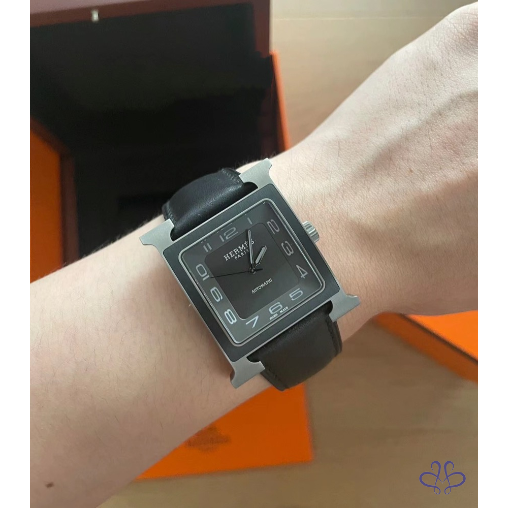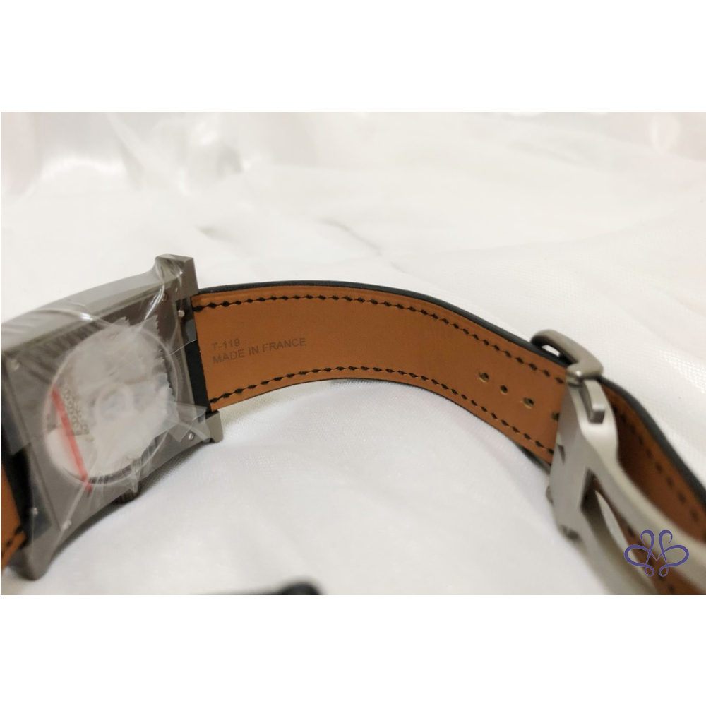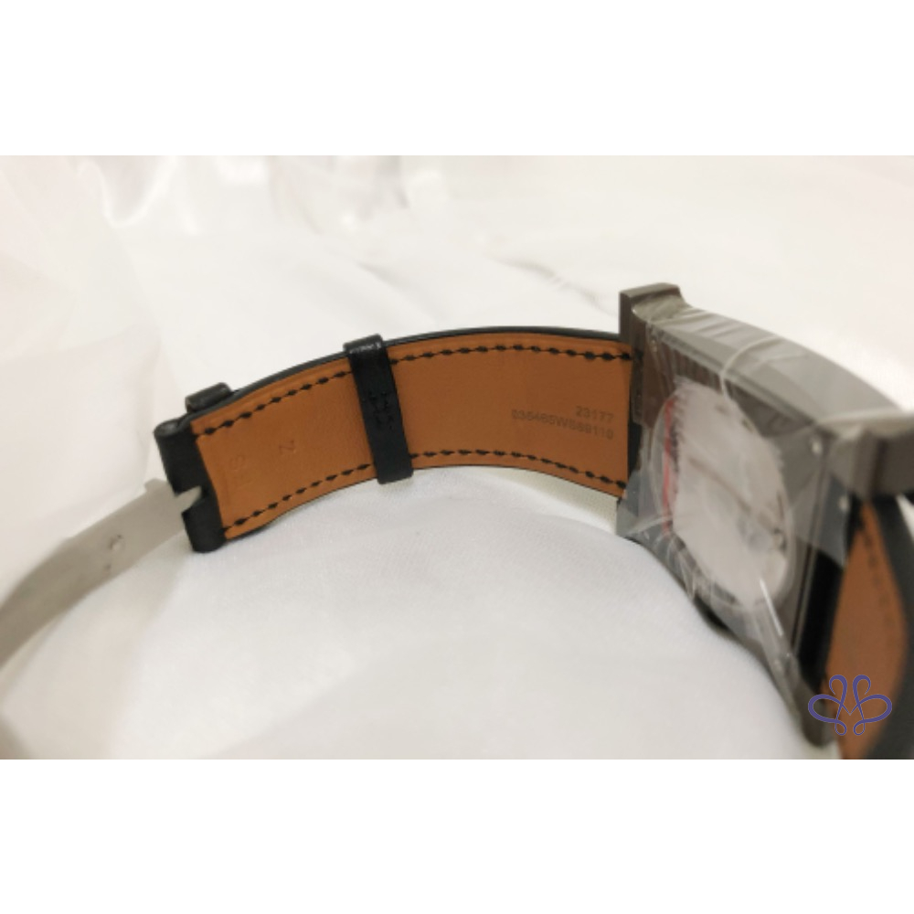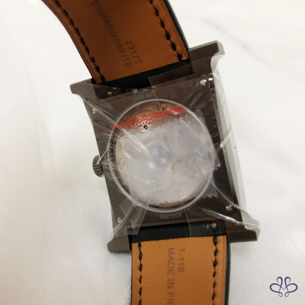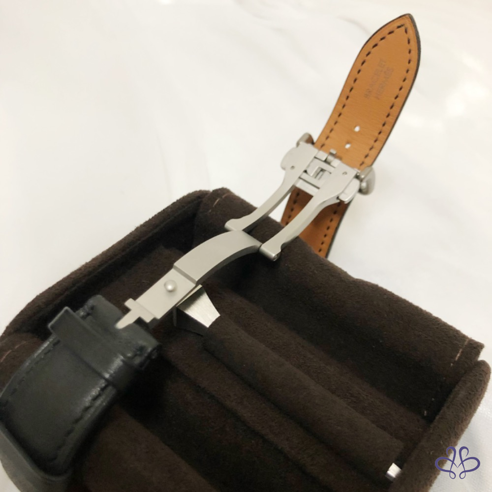 緞面磨砂和微噴砂鈦金屬錶殼,緞面磨砂黑色鈦金屬裝飾,Hermès錶廠自製H1912機芯,黑色錶盤,黑色Barenia小牛皮快拆錶帶。