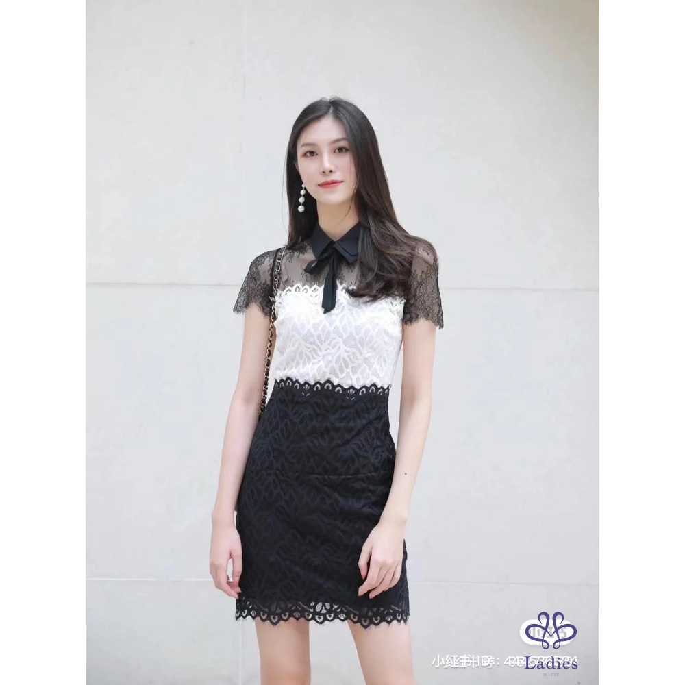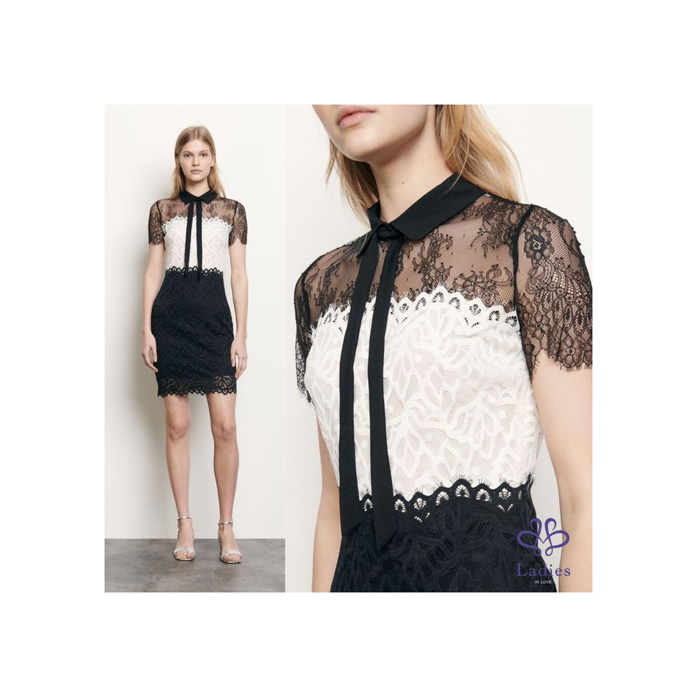法國輕奢品牌Sandro經典領子蝴蝶結黑白蕾絲洋裝