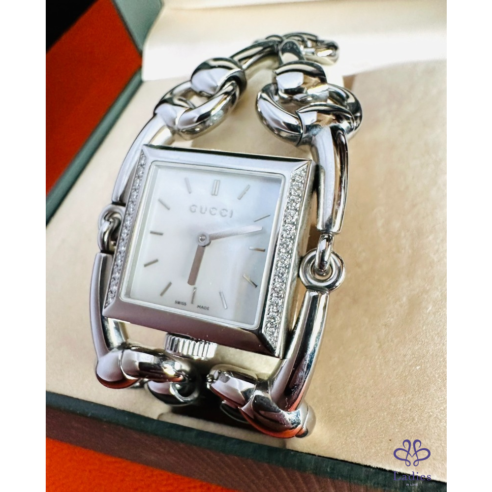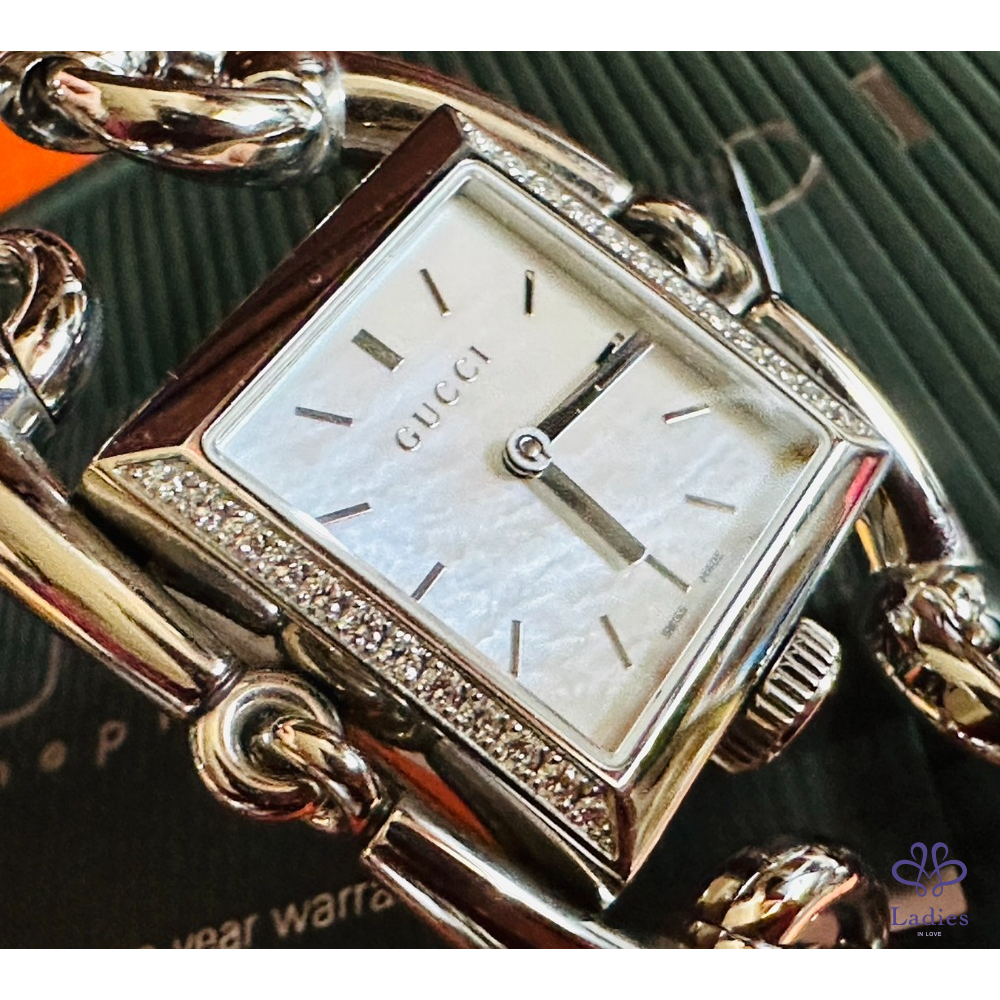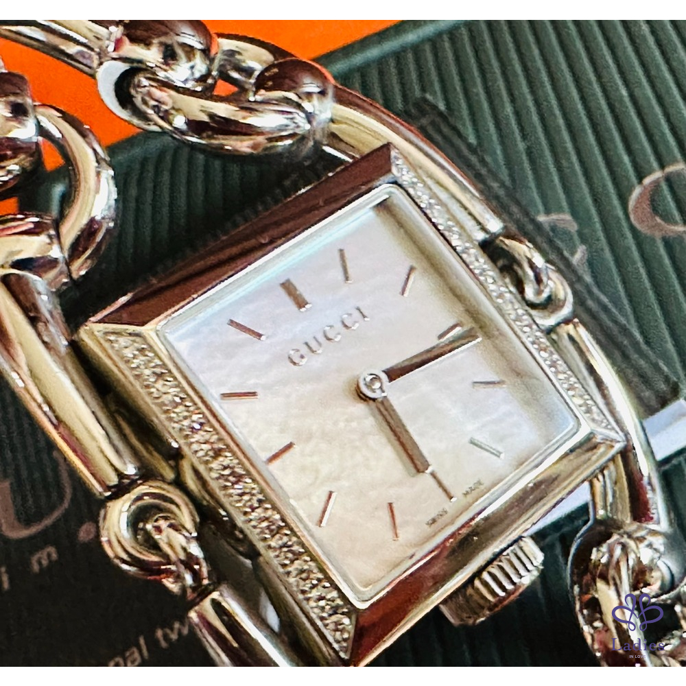 ~Gucci附原廠盒 原鑲雙邊鑽石 珍珠母貝面盤 馬銜鍊女錶