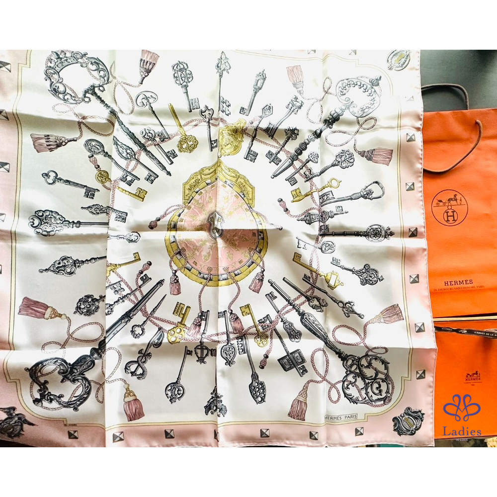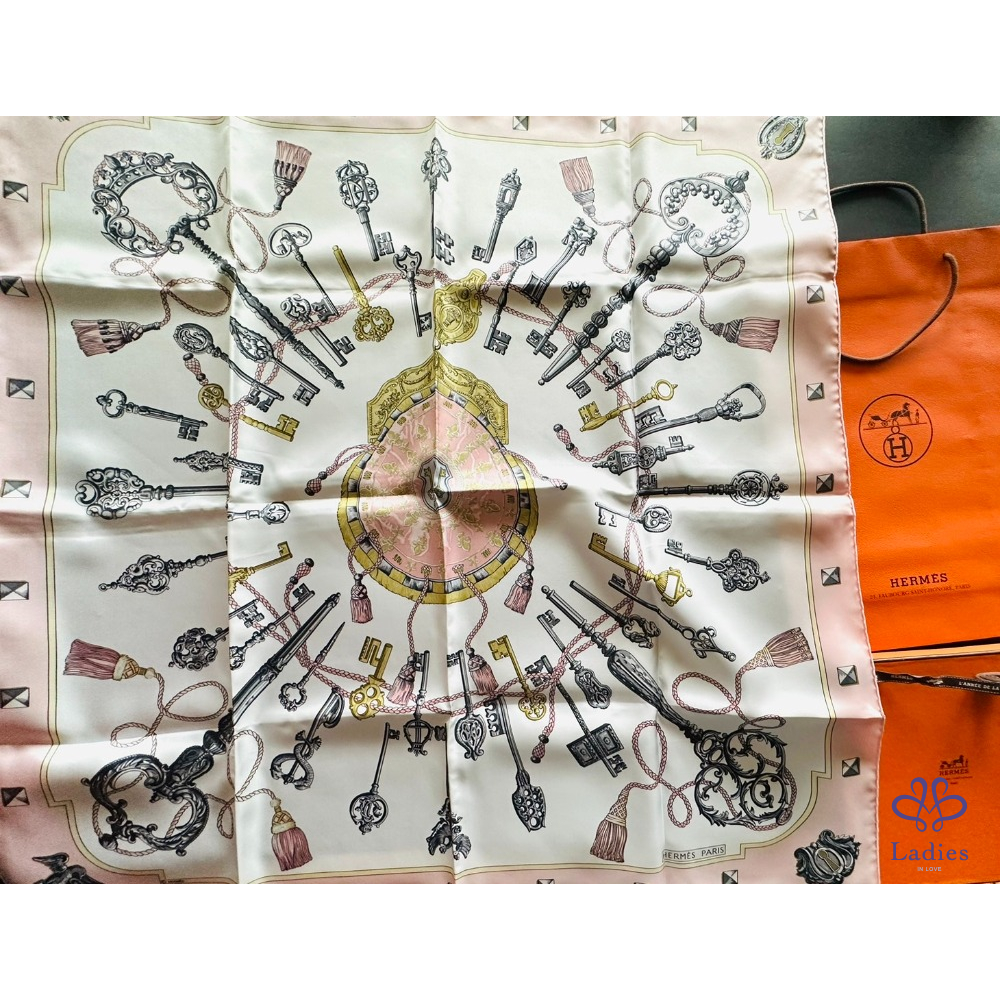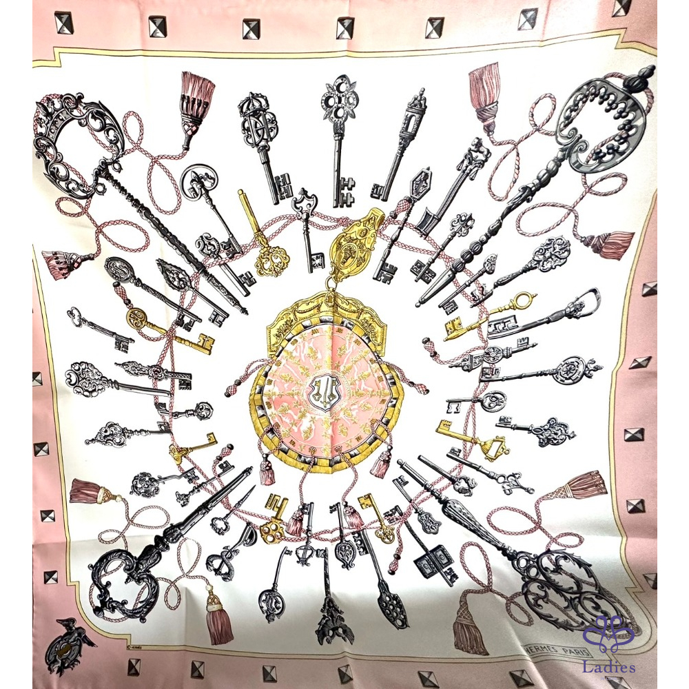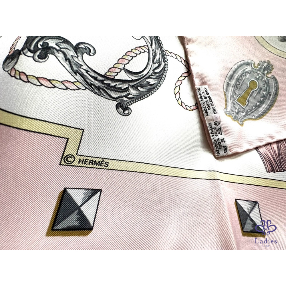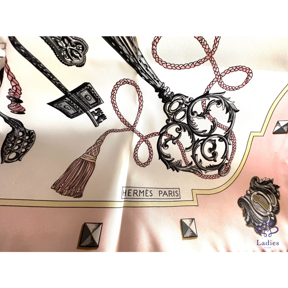 ~HERMES 未使用品 粉色底財富之鑰圖案絲巾