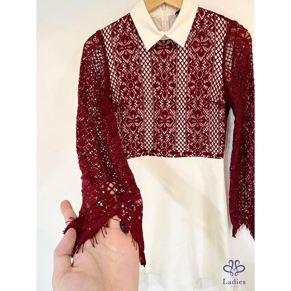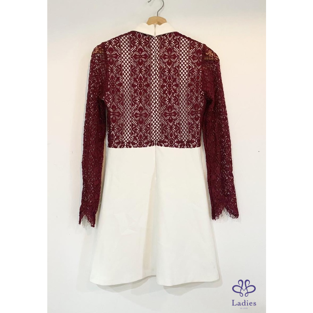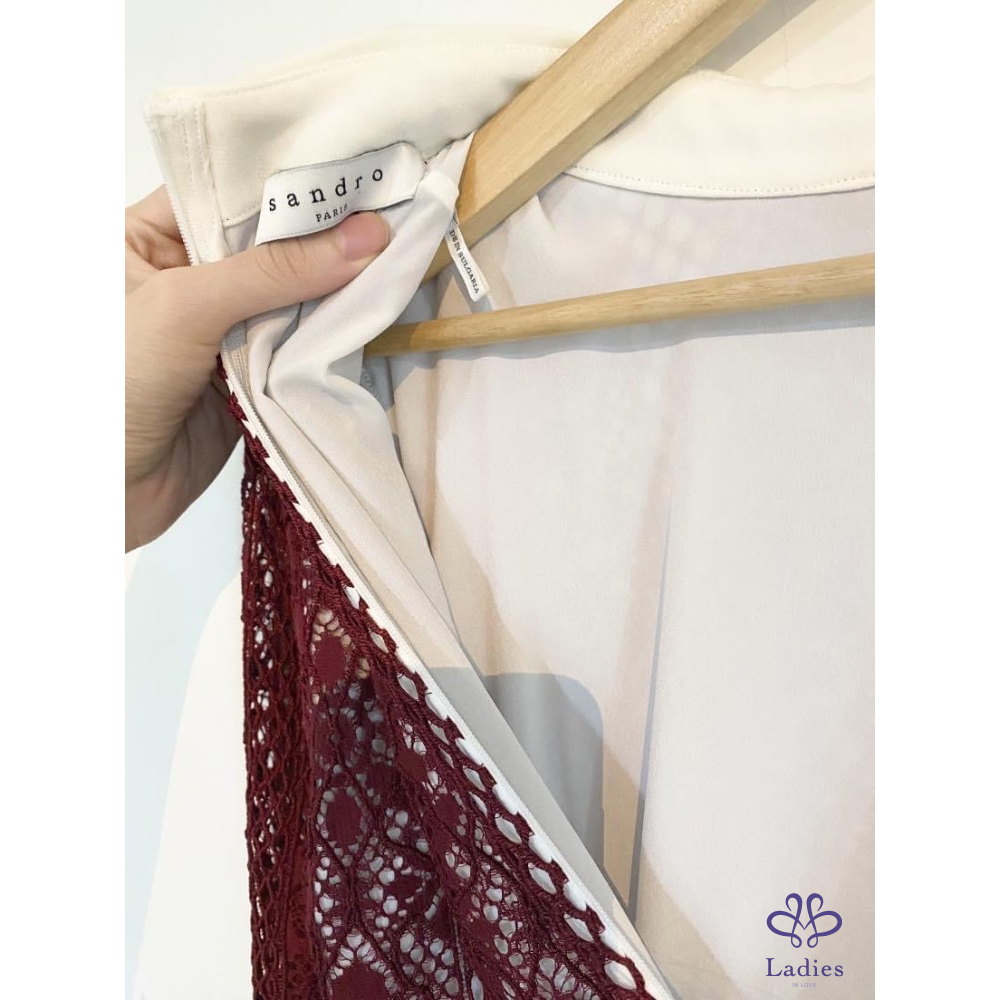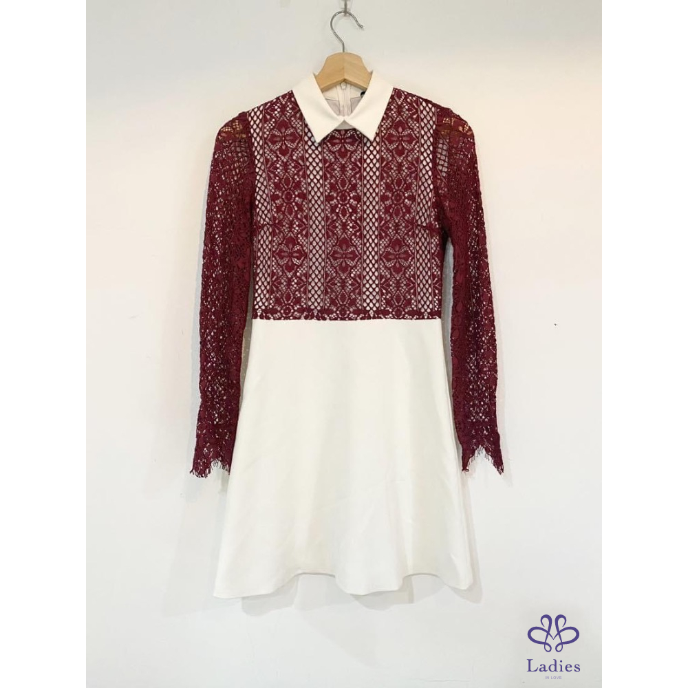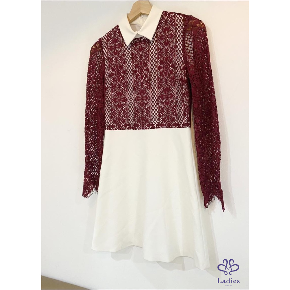 Sandro 小白領子白底酒紅蕾絲洋裝
