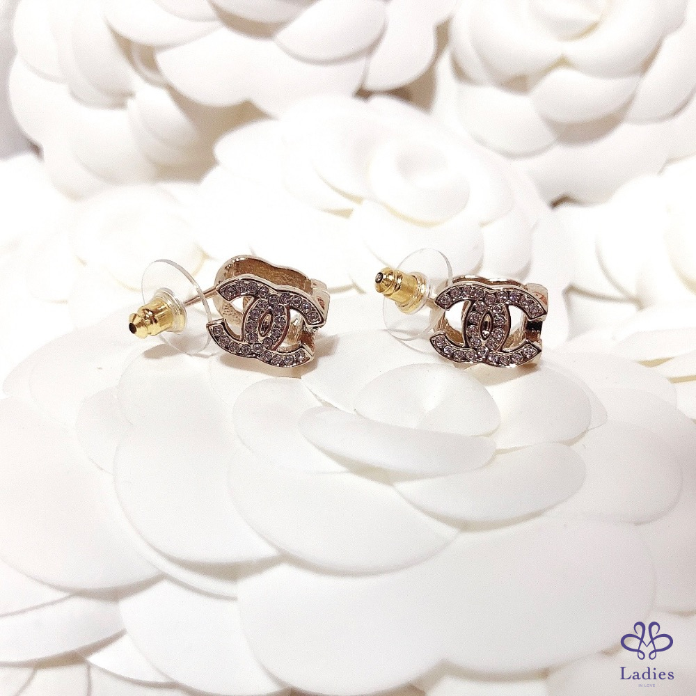 CHANEL 香奈兒 小香 23B 方形 鏤空 淡金 立體水鑽 logo 針式 穿式 耳環 全新✨
