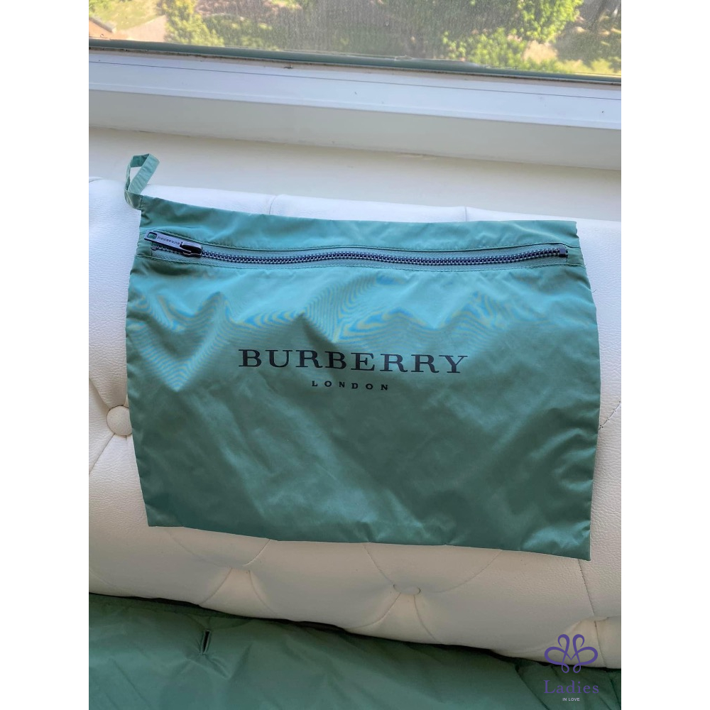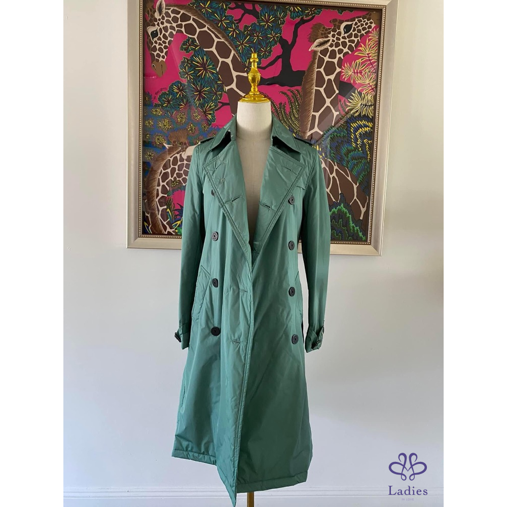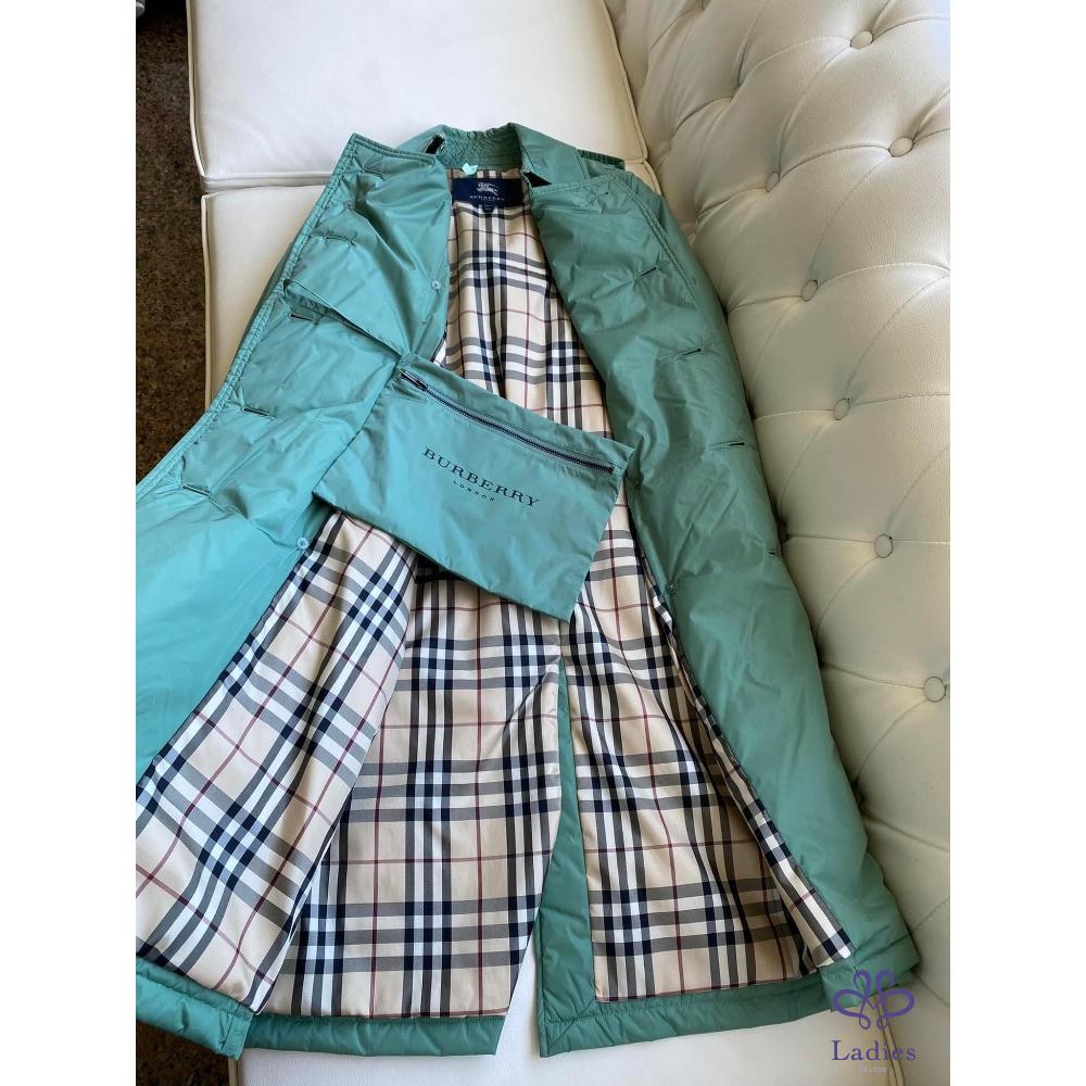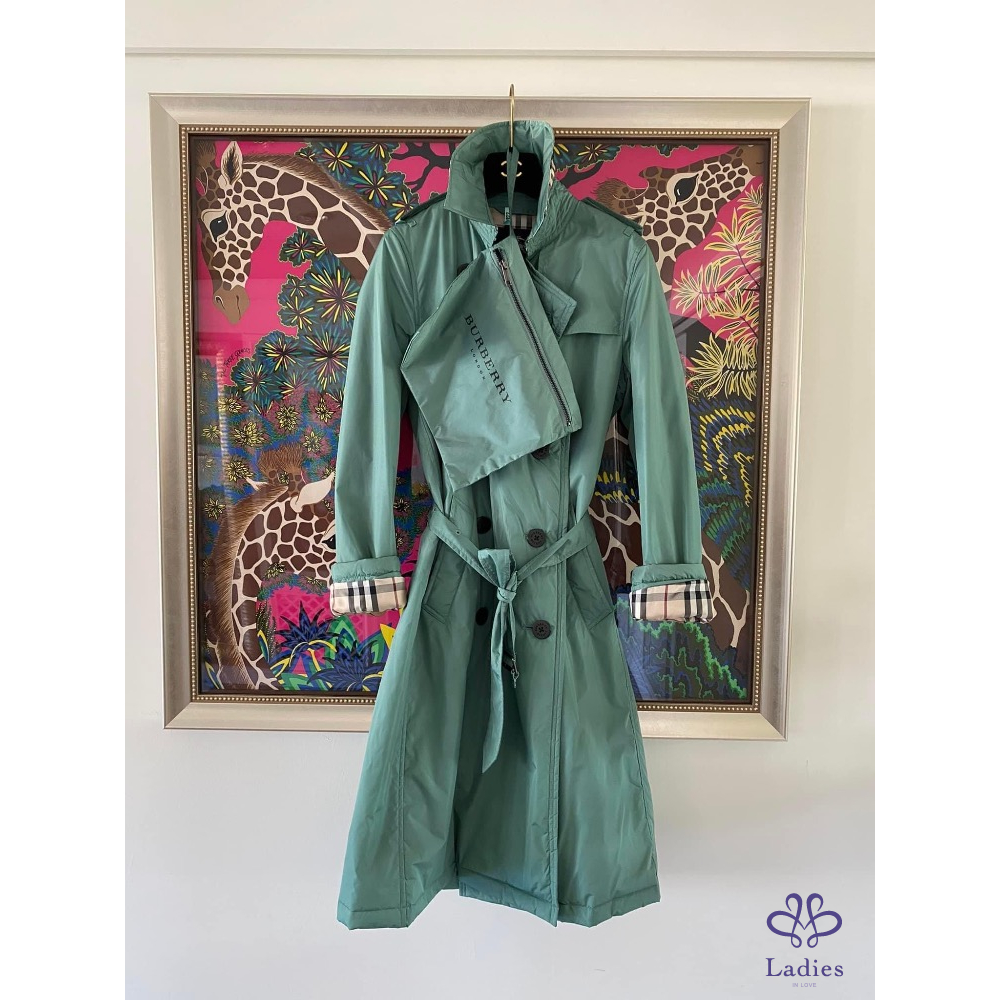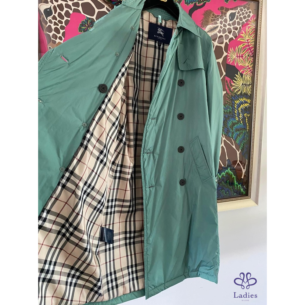 超美的湖水綠色,穿上非常顯瘦,領子有格紋設計,內裡、袖內滿是格紋設計,扣子及金屬上都有burberry的字樣,有附收納袋。