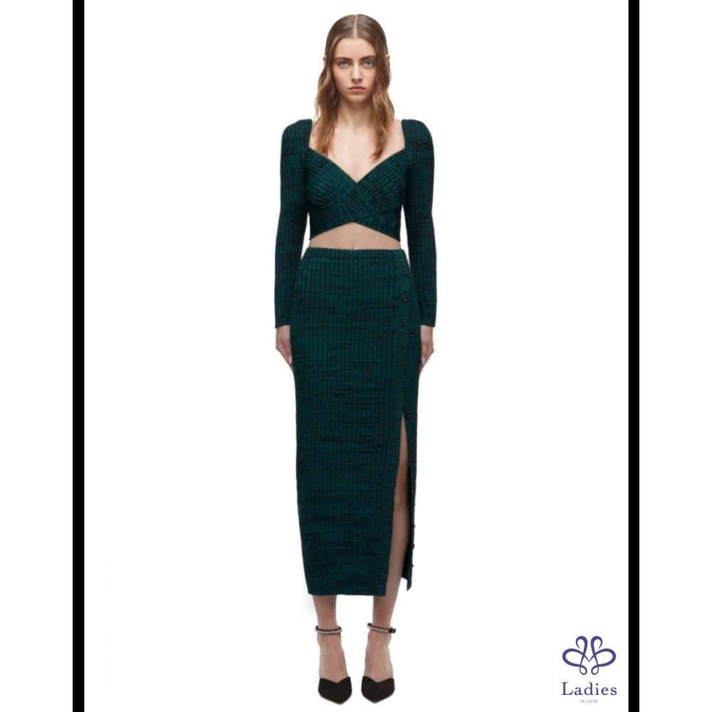 首頁 精品服飾 英國仙女品牌 Self portrait 墨綠混色交叉羅紋針織彈性套裝(上衣+長裙套組)