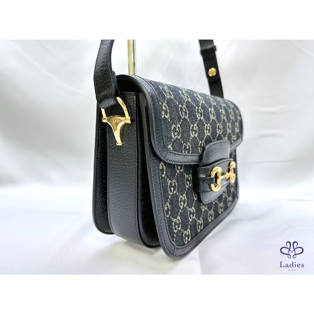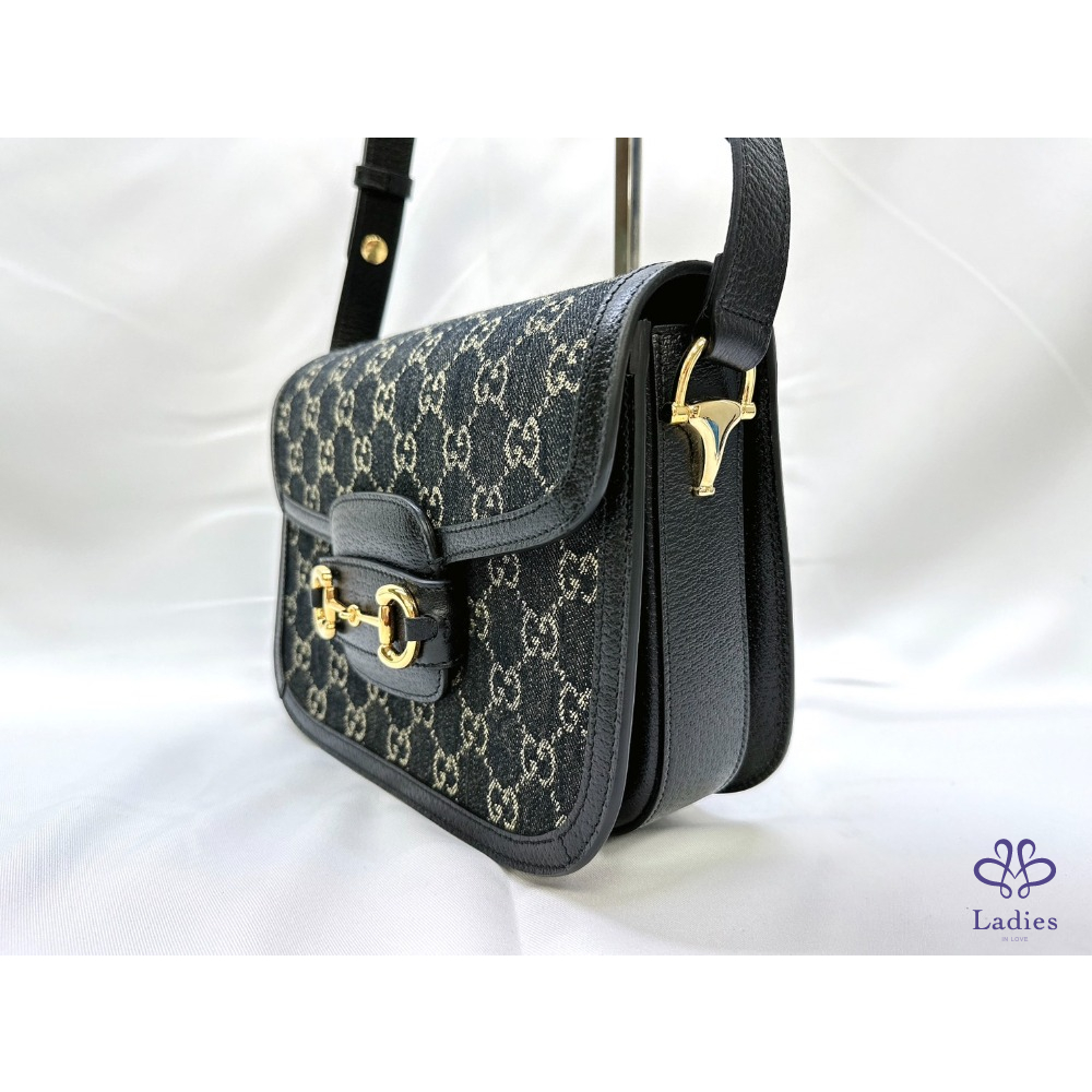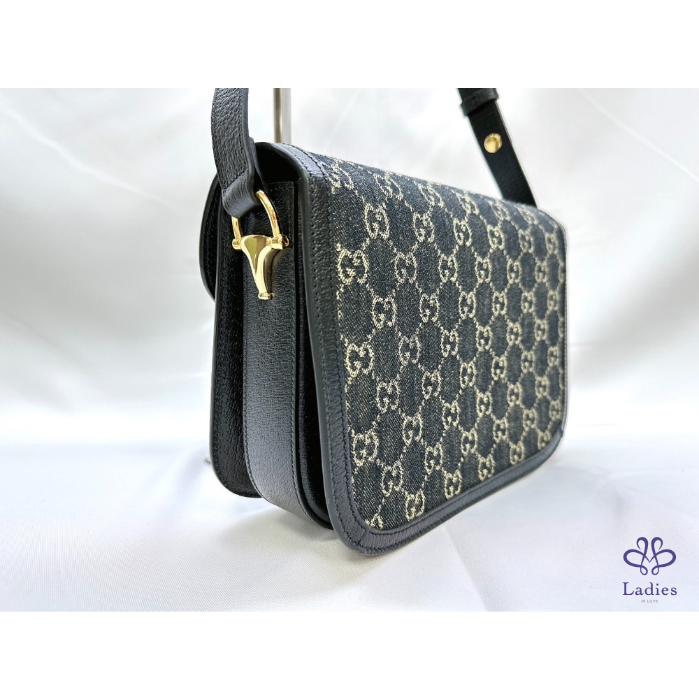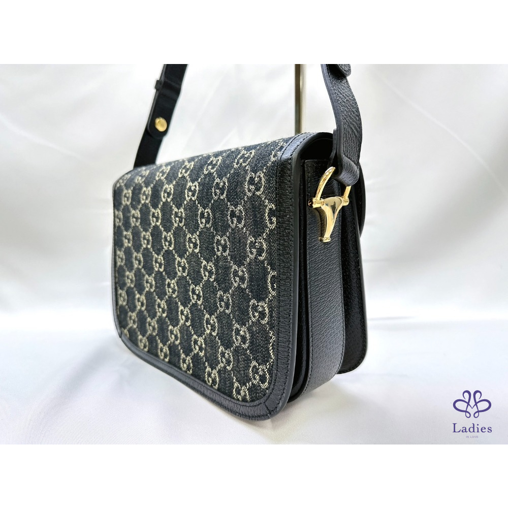 【GUCCI 全新1955 Horsebit單寧黑馬銜扣肩揹包】