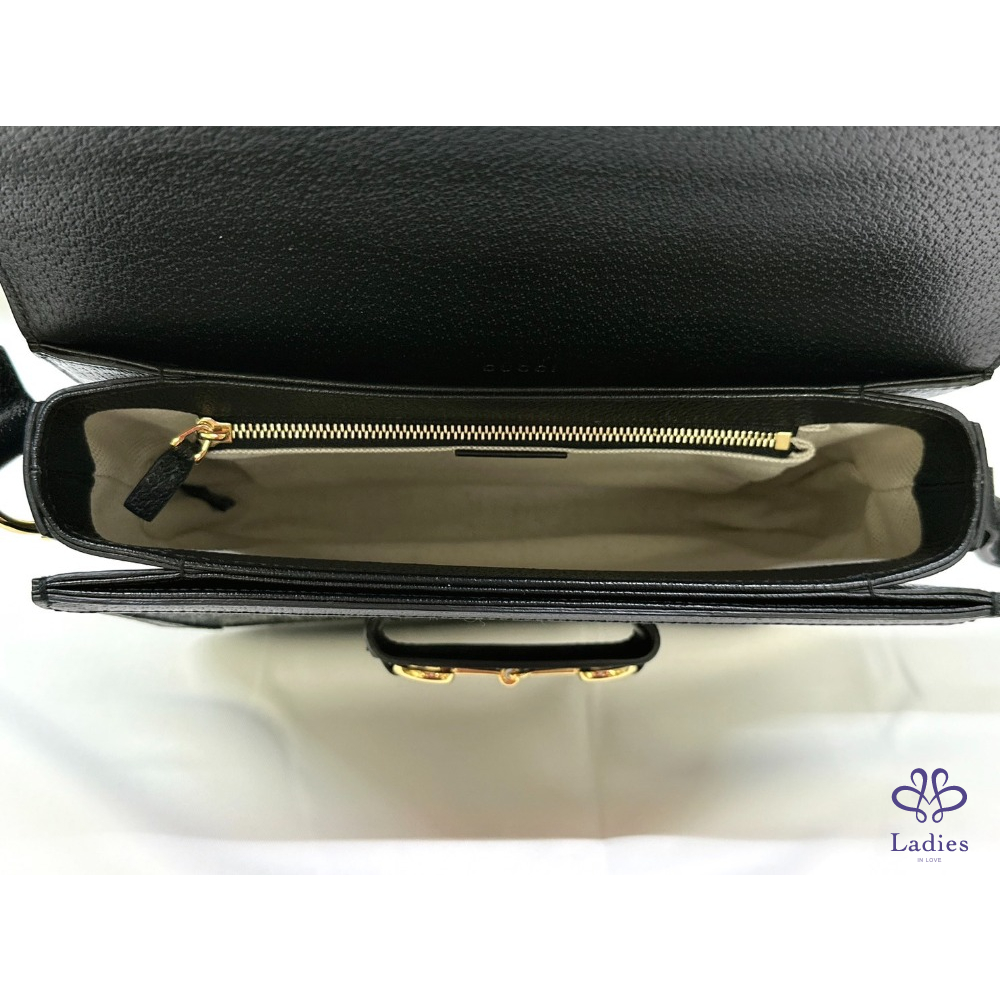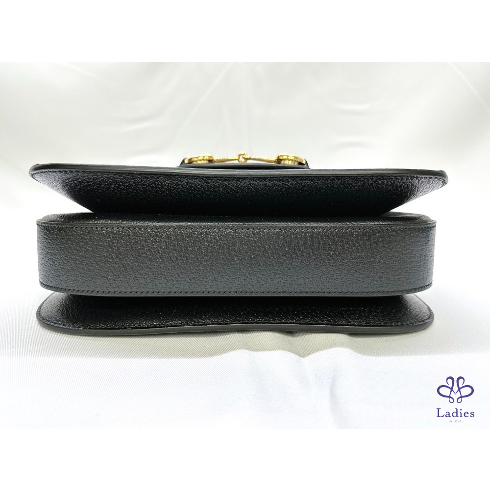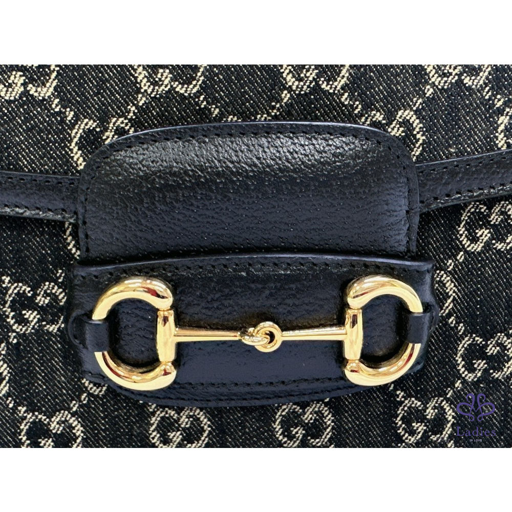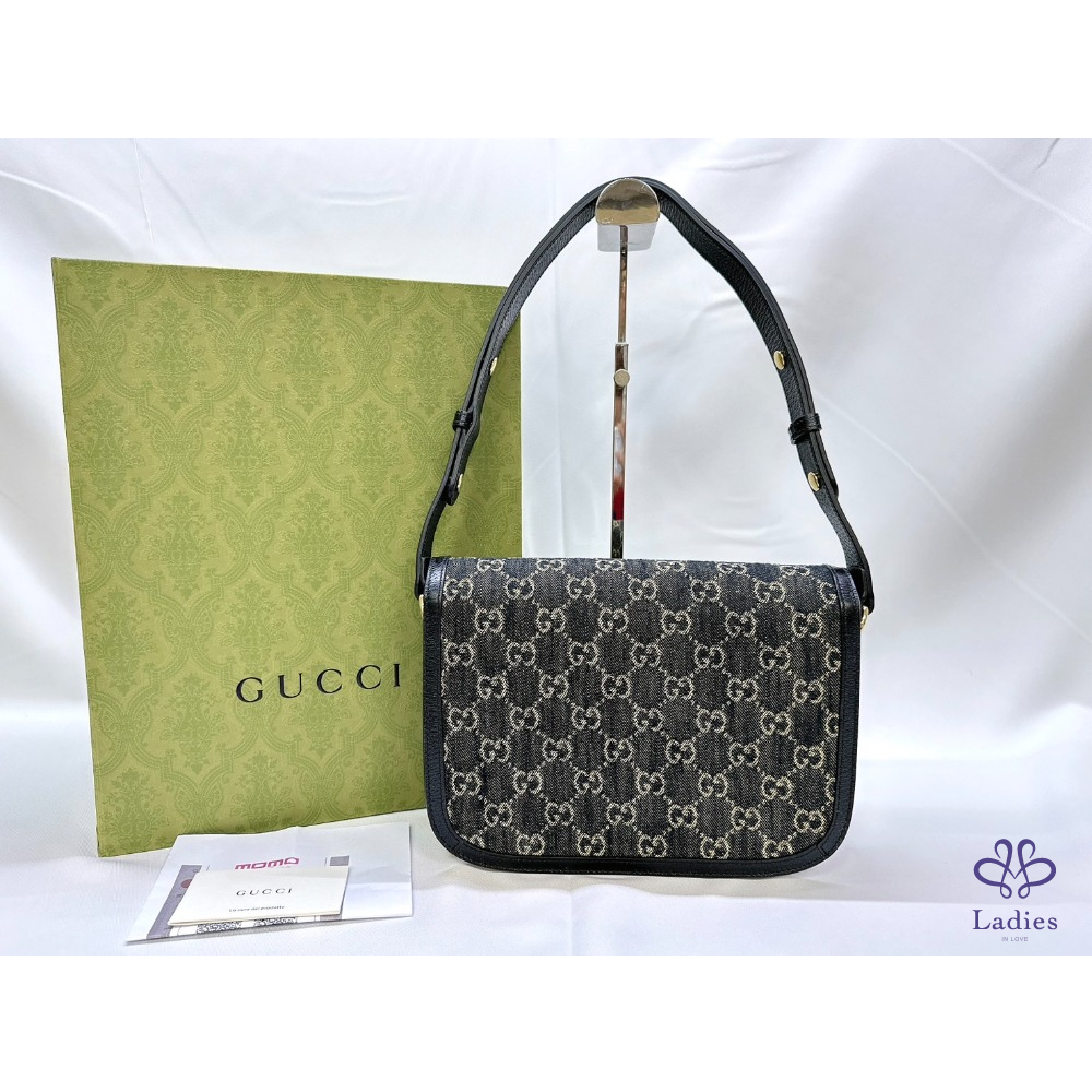 【GUCCI 全新1955 Horsebit單寧黑馬銜扣肩揹包】