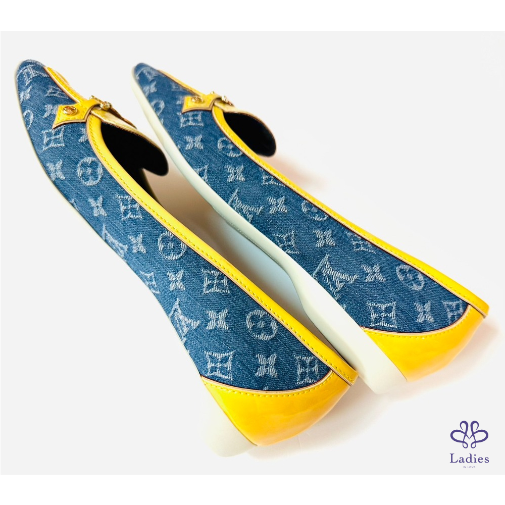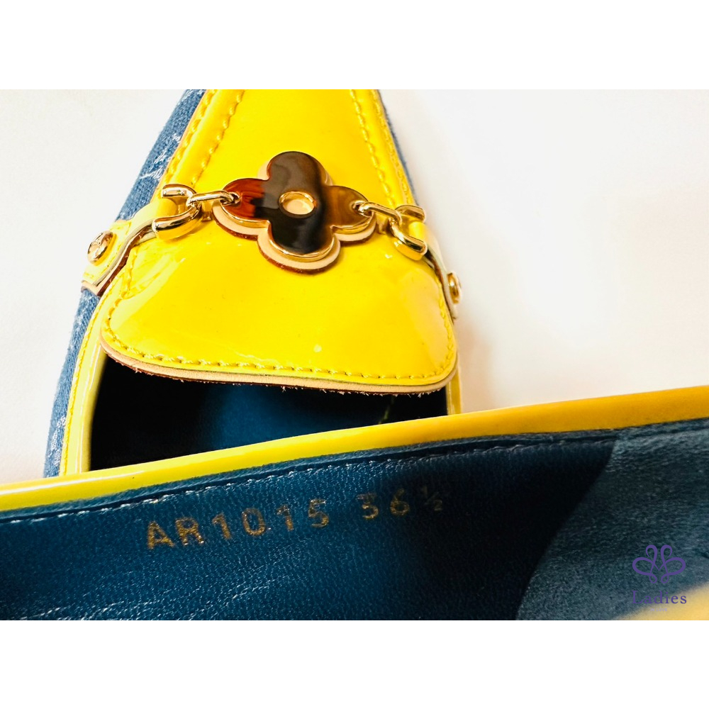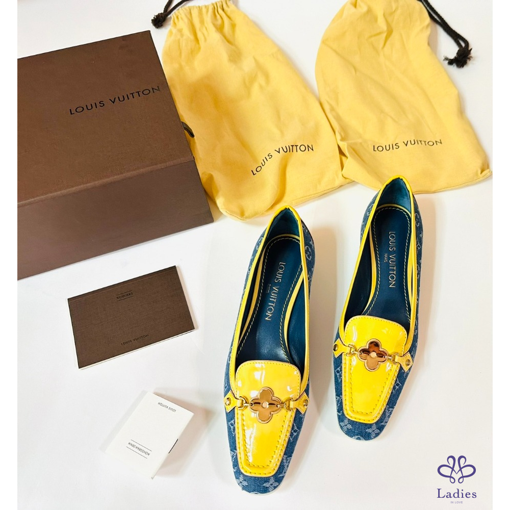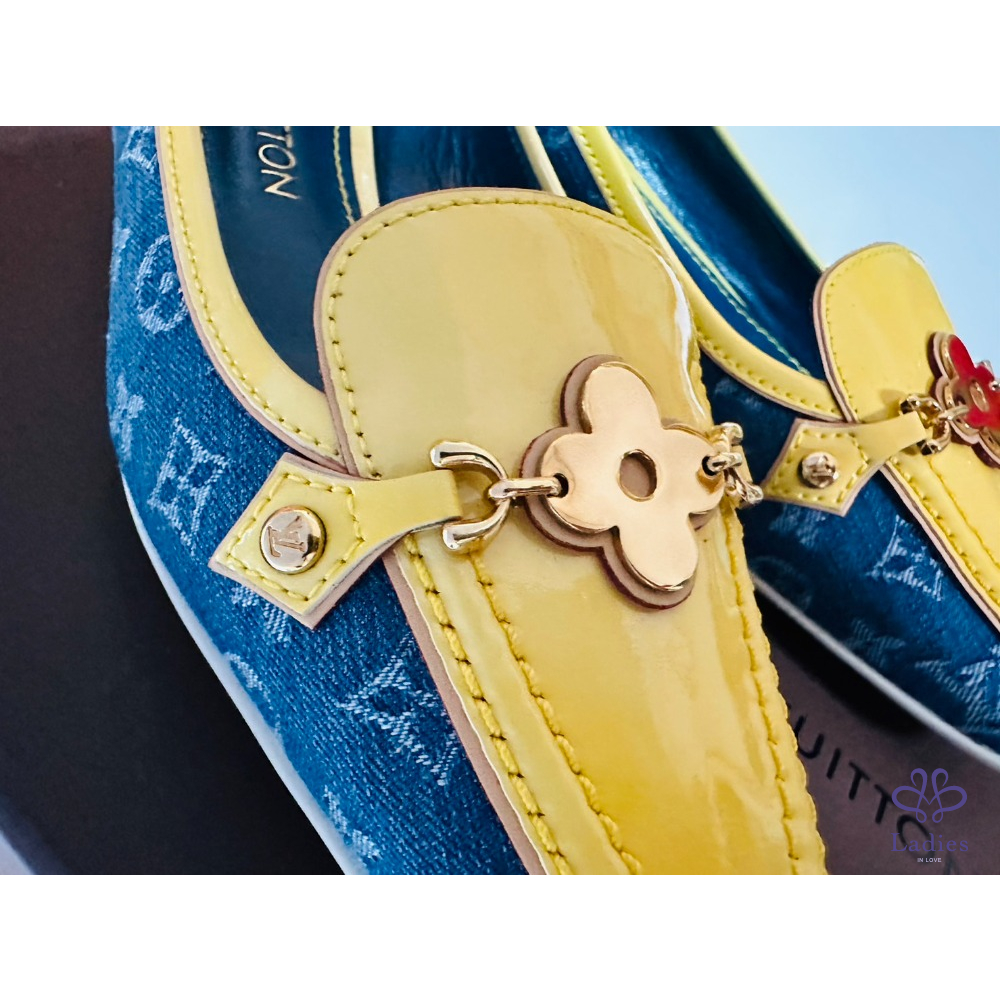 ~LV牛仔布料黃邊金色四葉草36.5鞋頭掛飾平底鞋