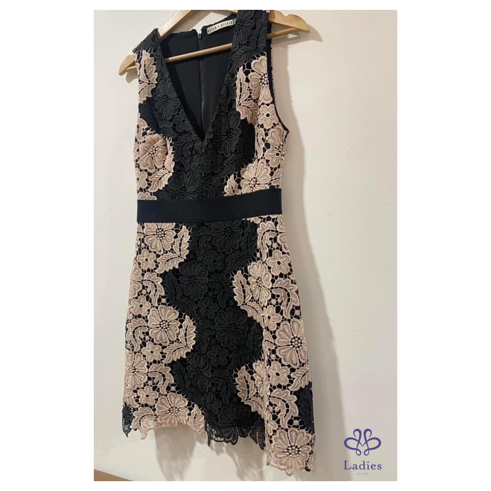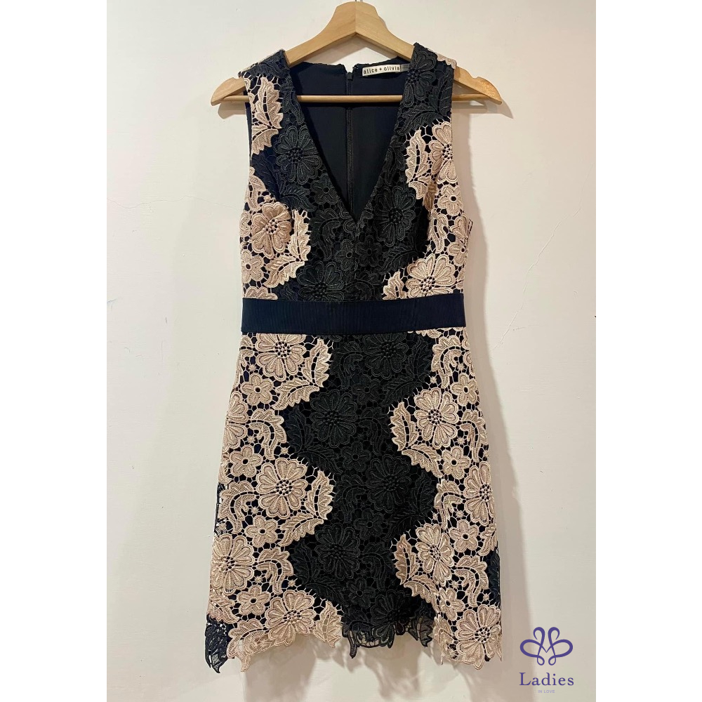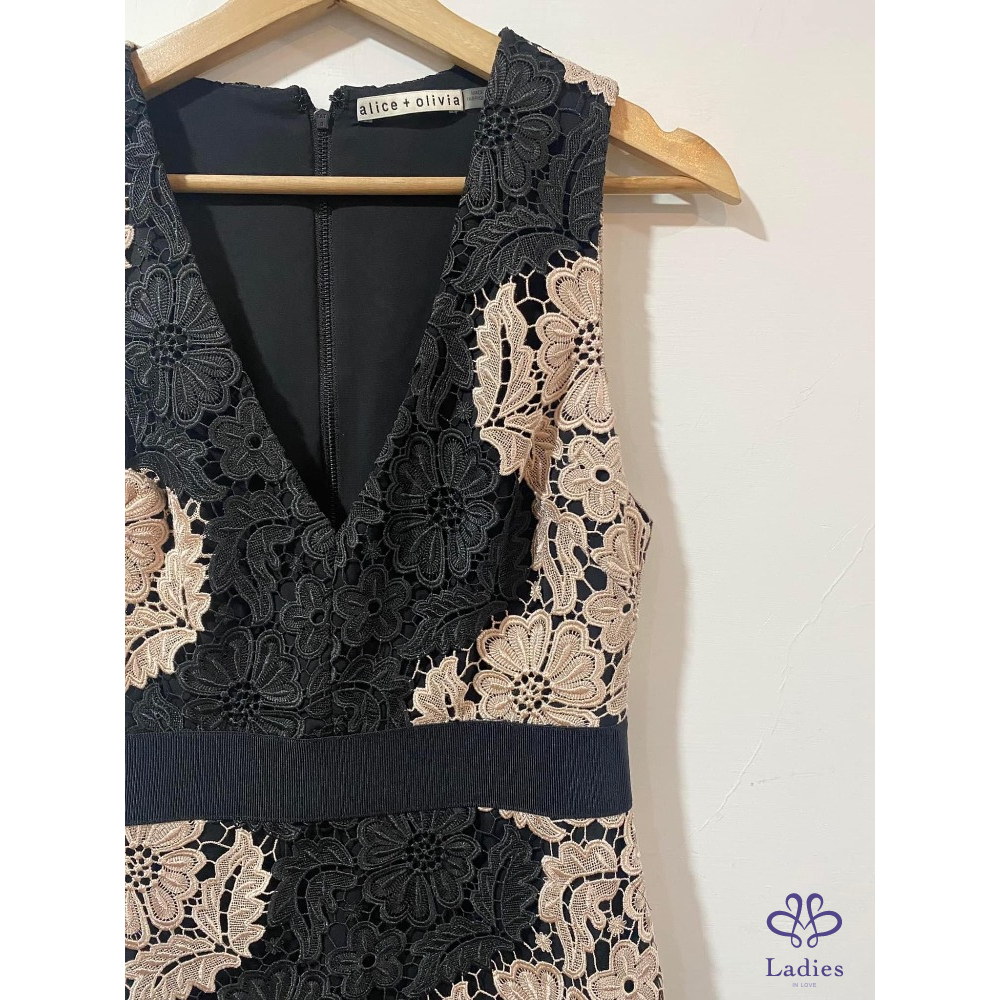 Alice + Olivia 粉黑 V領簍空蕾絲修身洋裝
