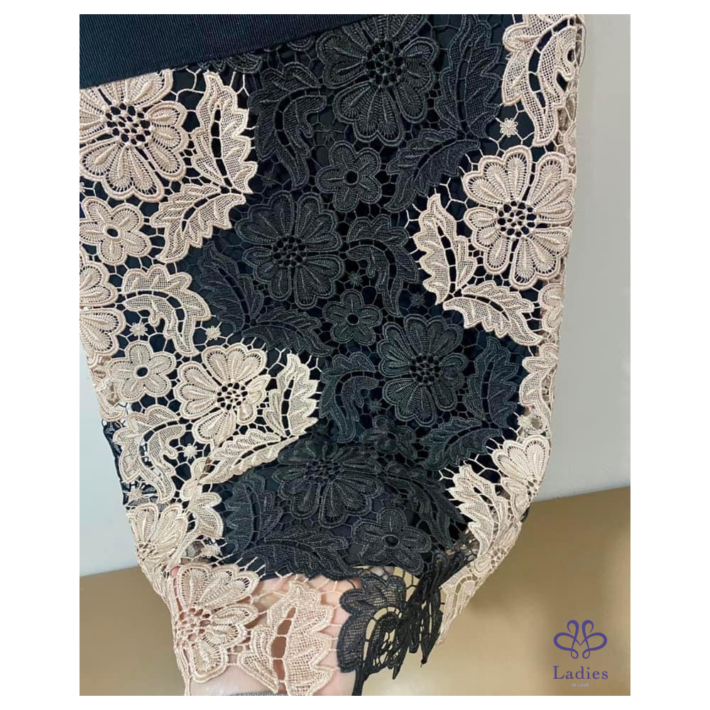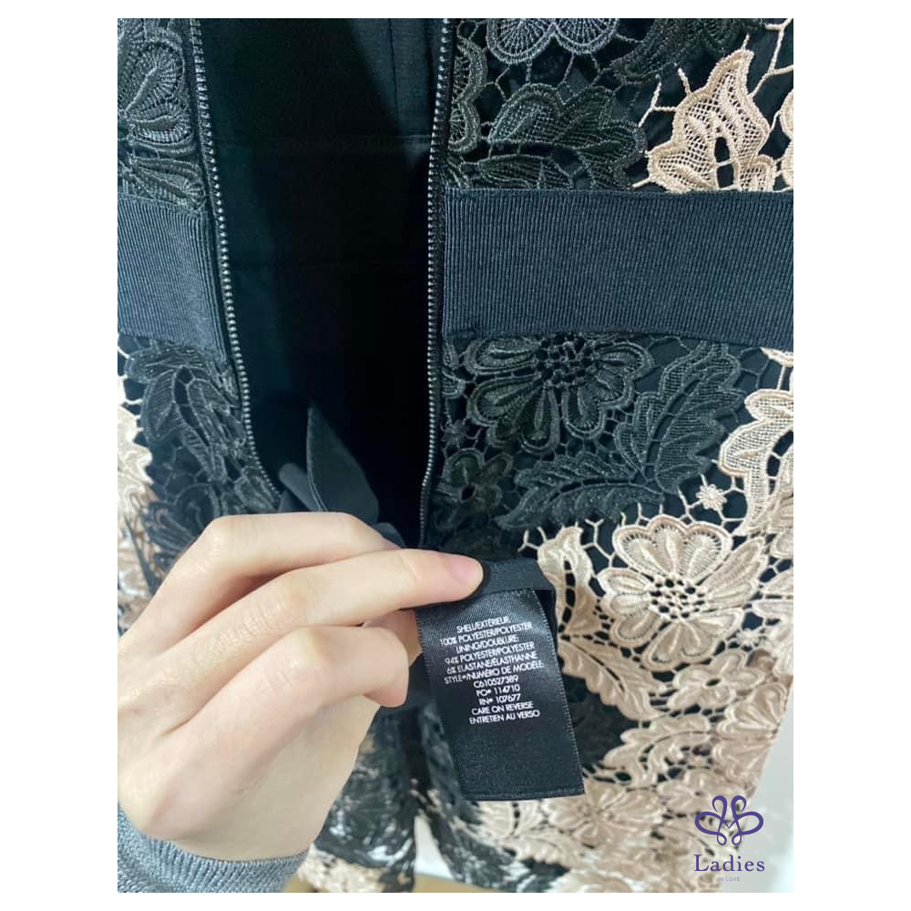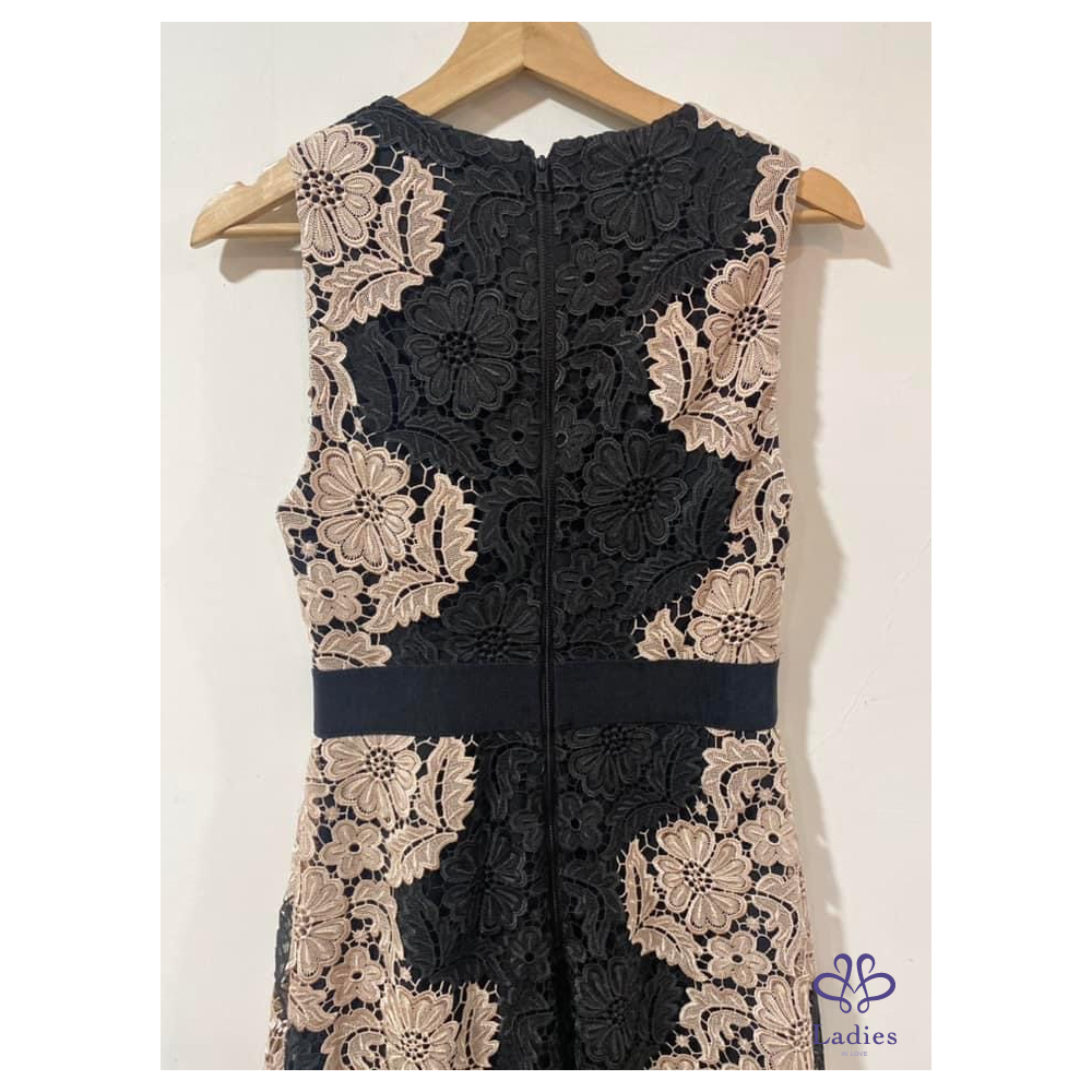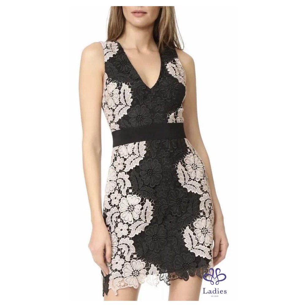 Alice + Olivia 粉黑 V領簍空蕾絲修身洋裝