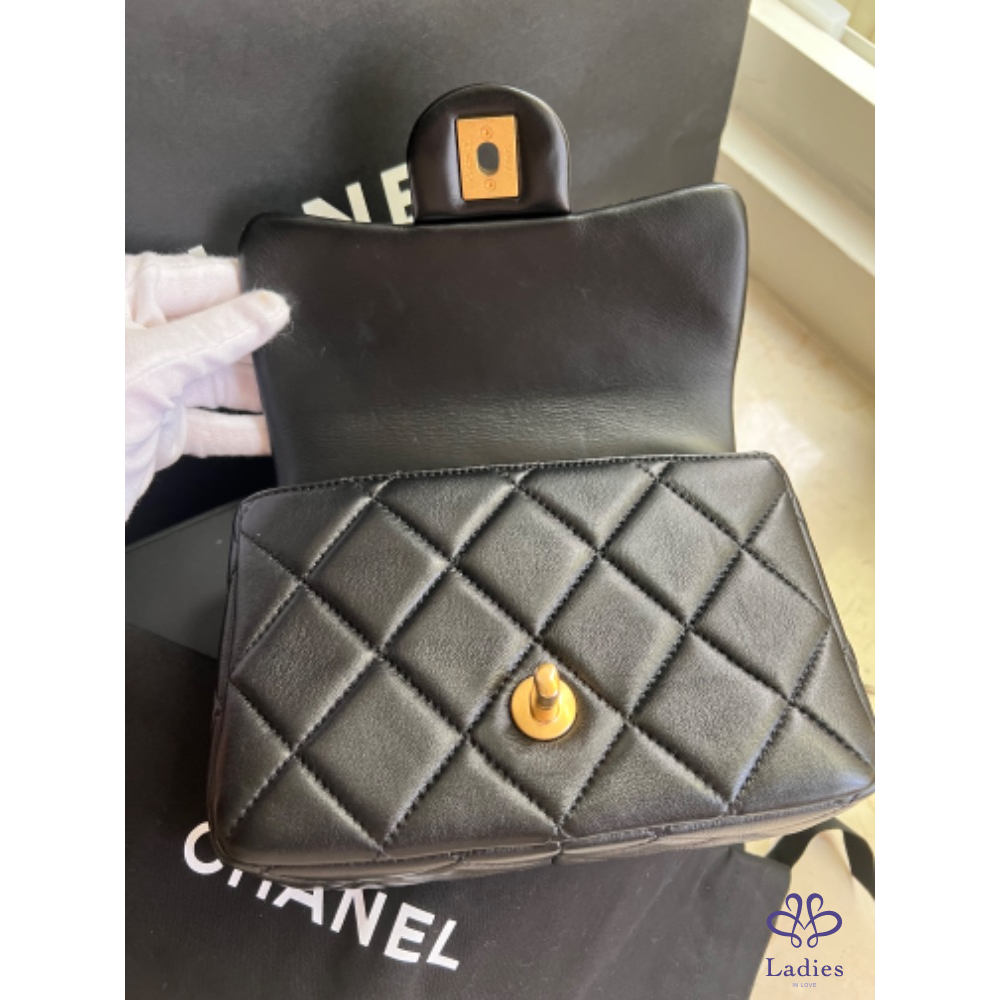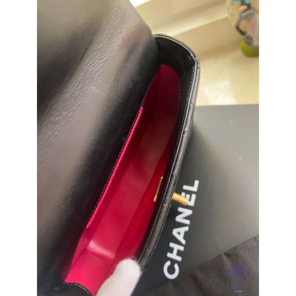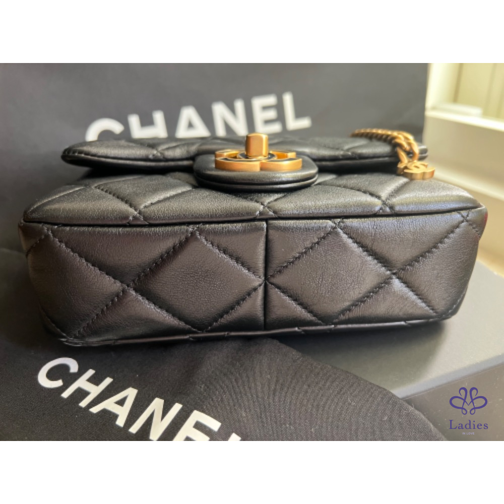 85新CHANEL經典黑金珐瑯轉釦垂吊cc logo方胖羊皮口蓋包