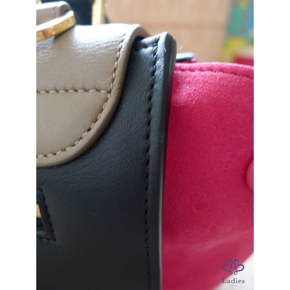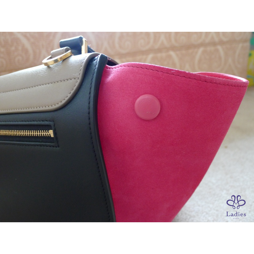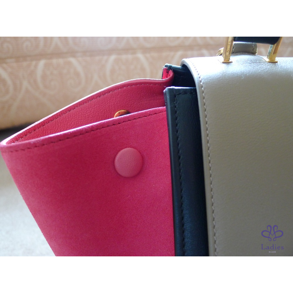 全新法國名牌 CELINE MINI TRAPEZE 真皮拼麂皮材質 手提肩背包 鞦韆包 粉桃紅拼米色