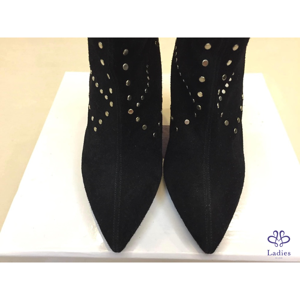 黑色麂皮靴子卯釘墜飾非常帥氣尖頭酒杯跟女人味十足她家的東西雖然貴但是質感品質真的很好靴子穿起來很穩腳底有厚墊也很舒適喔 附件:防塵袋會包妥寄出 出清價$5880含運售出不退感謝辛苦管理員謝謝美女們推喔她團