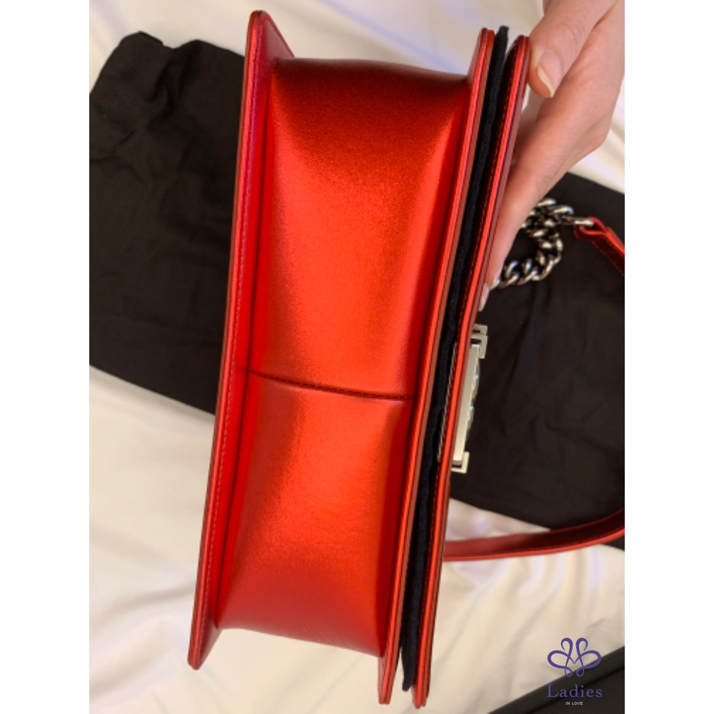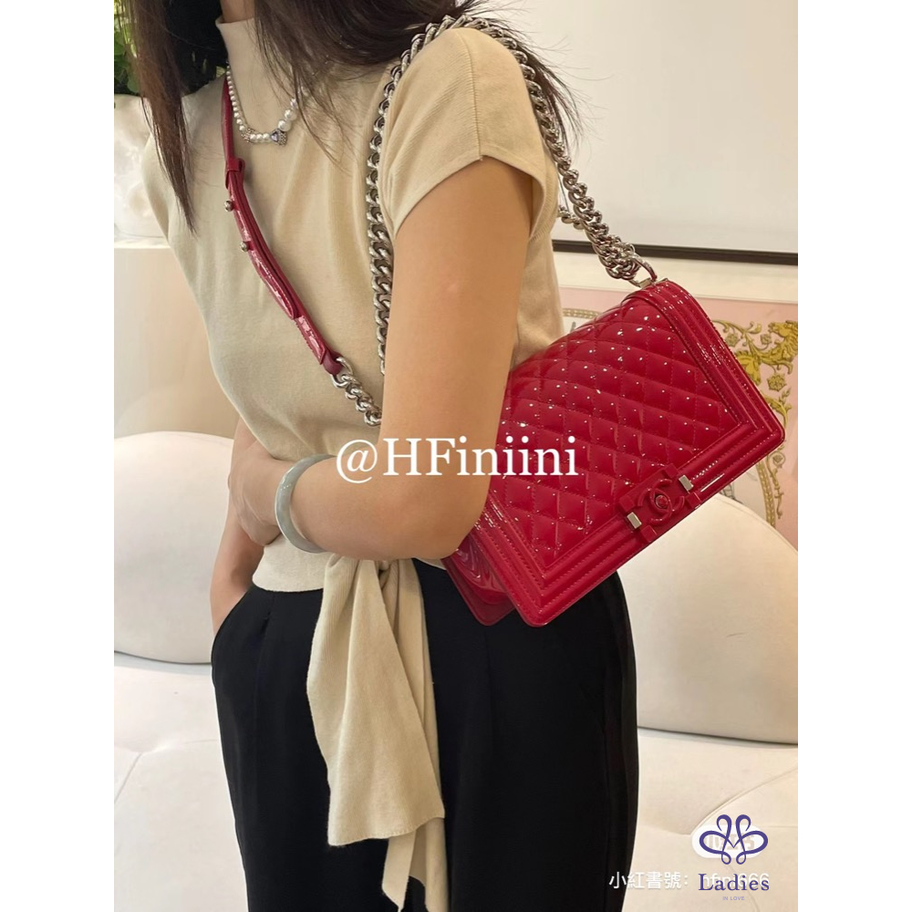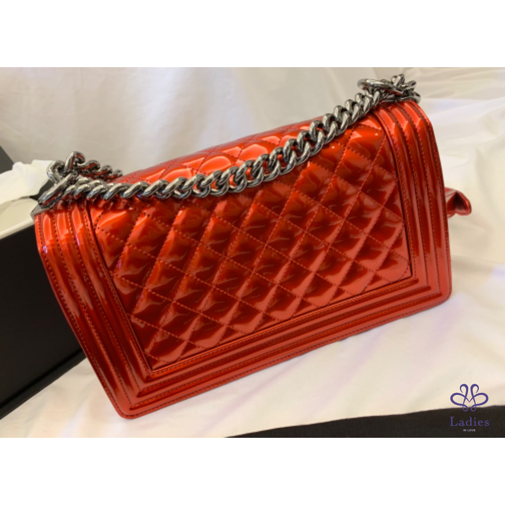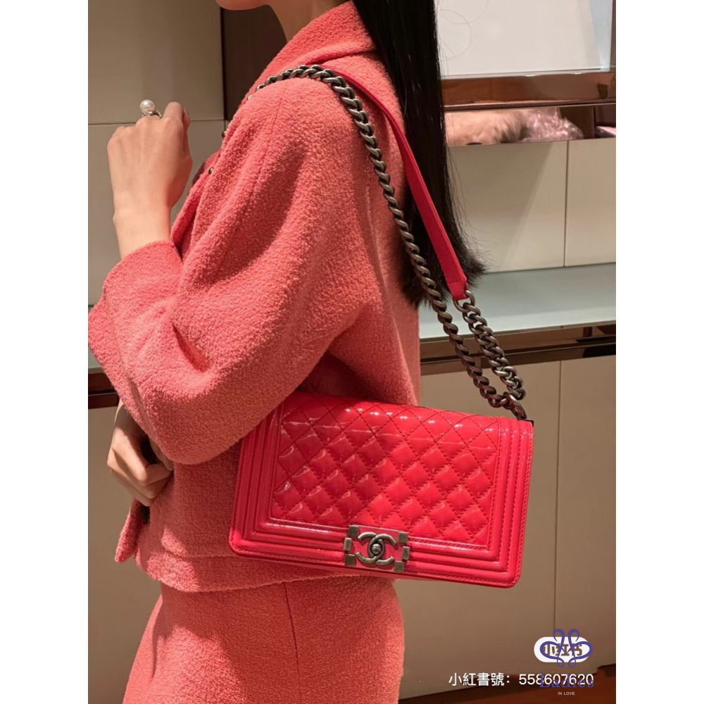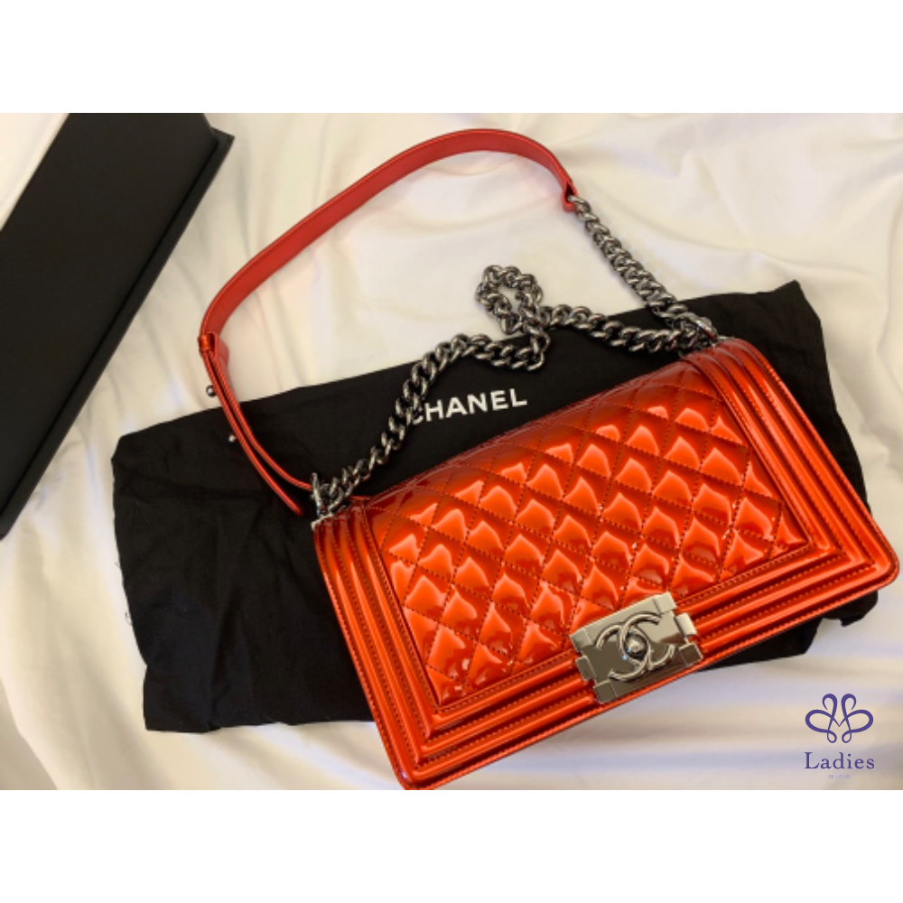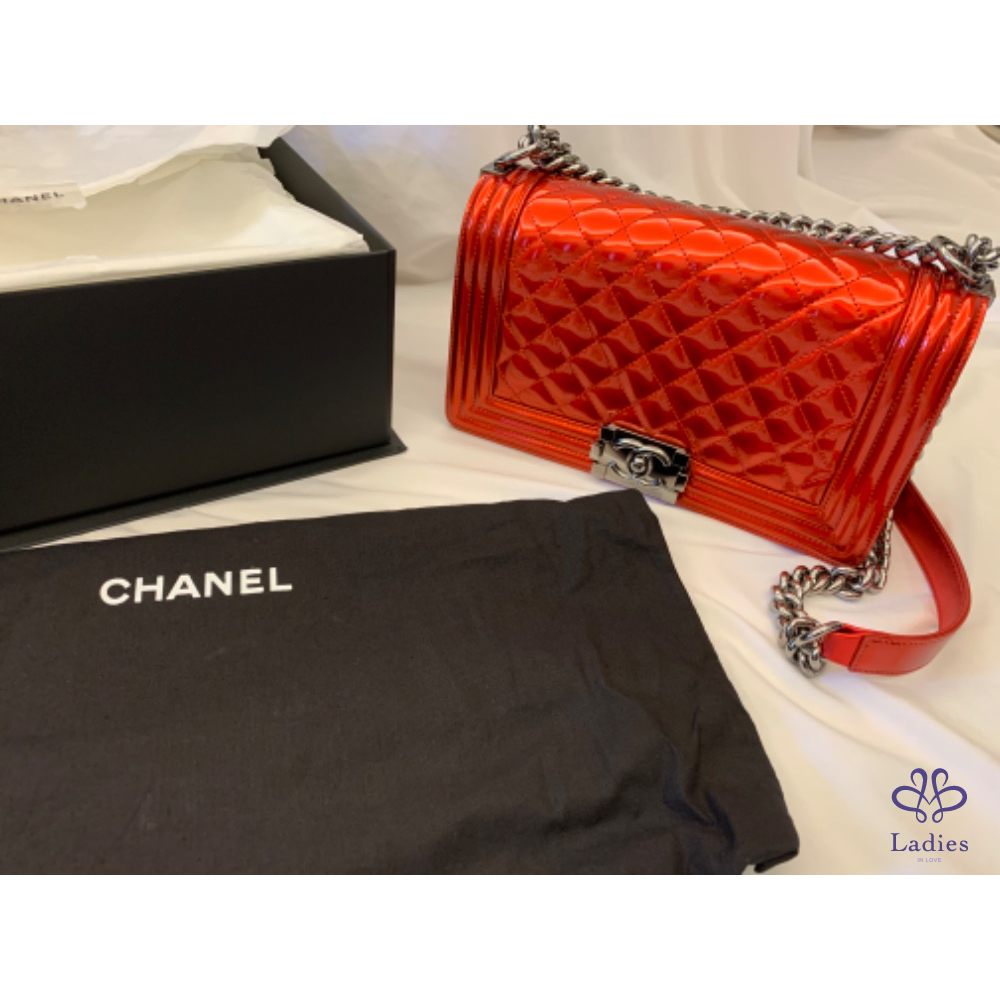 CHANEL 限量金屬亮皮菱格銀鍊BOY 25