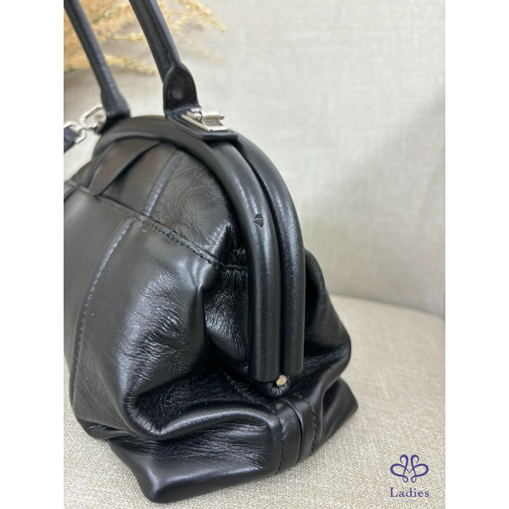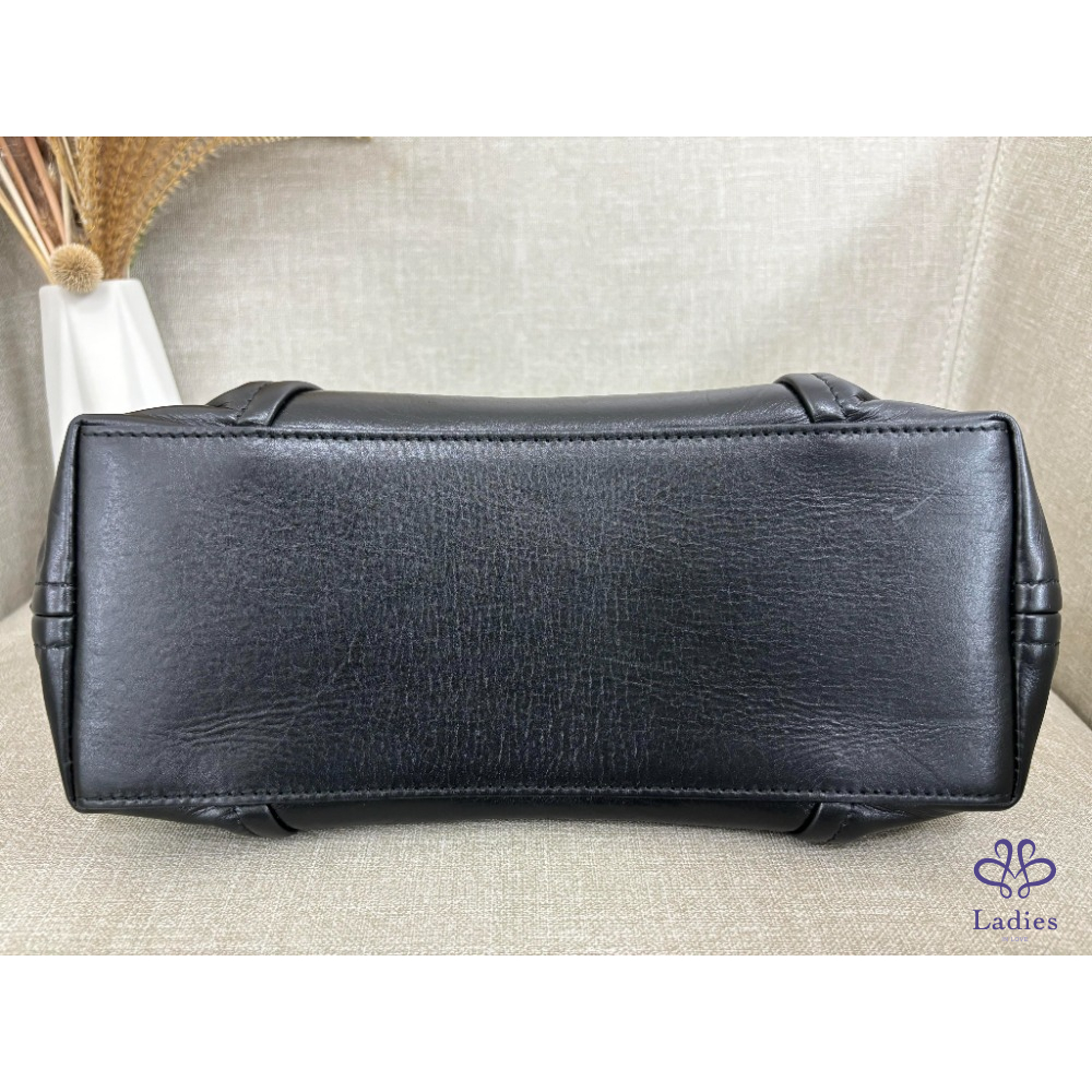 明顯使用過的痕跡、壓痕,包內外及外框皮革處有刮傷,包包正面B字金屬LOGO有氧化,提把有微刮痕