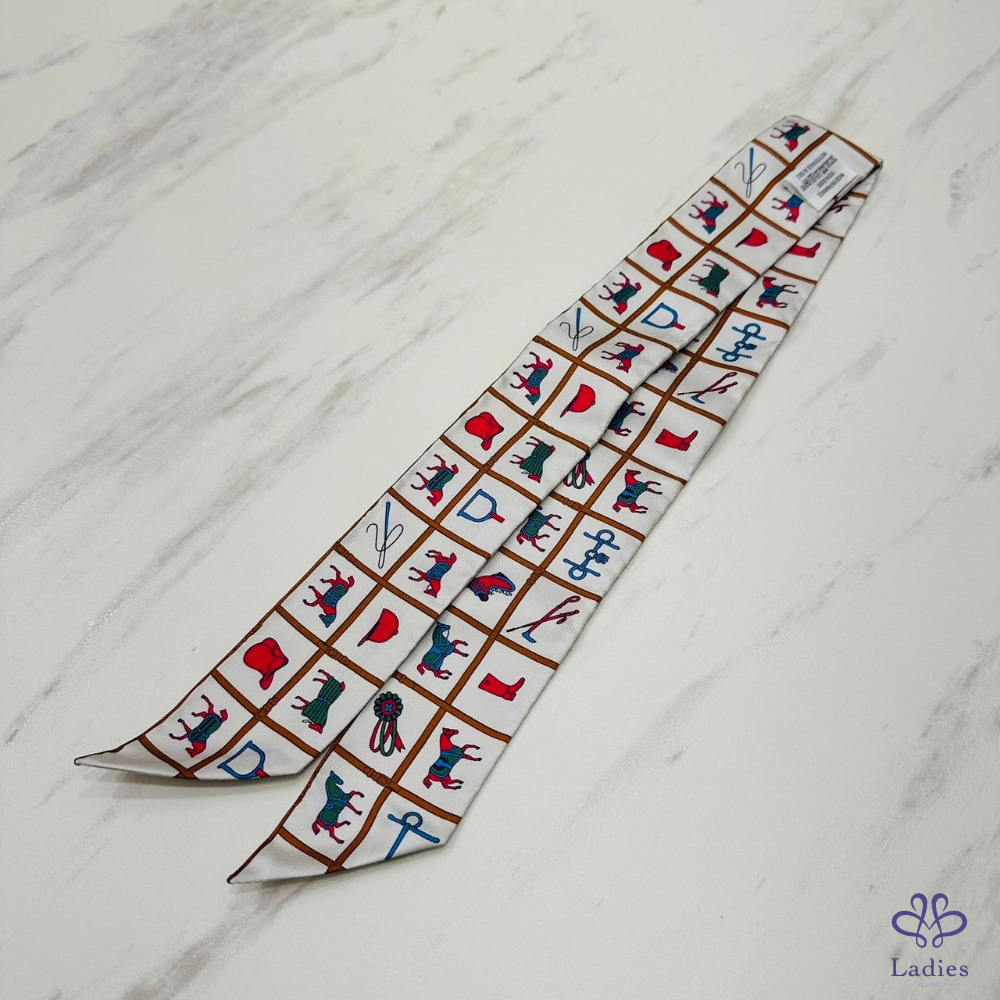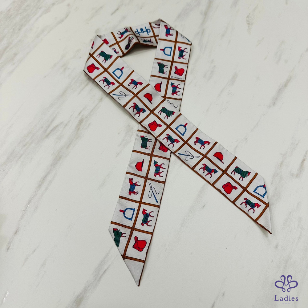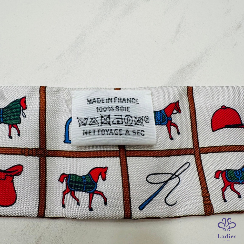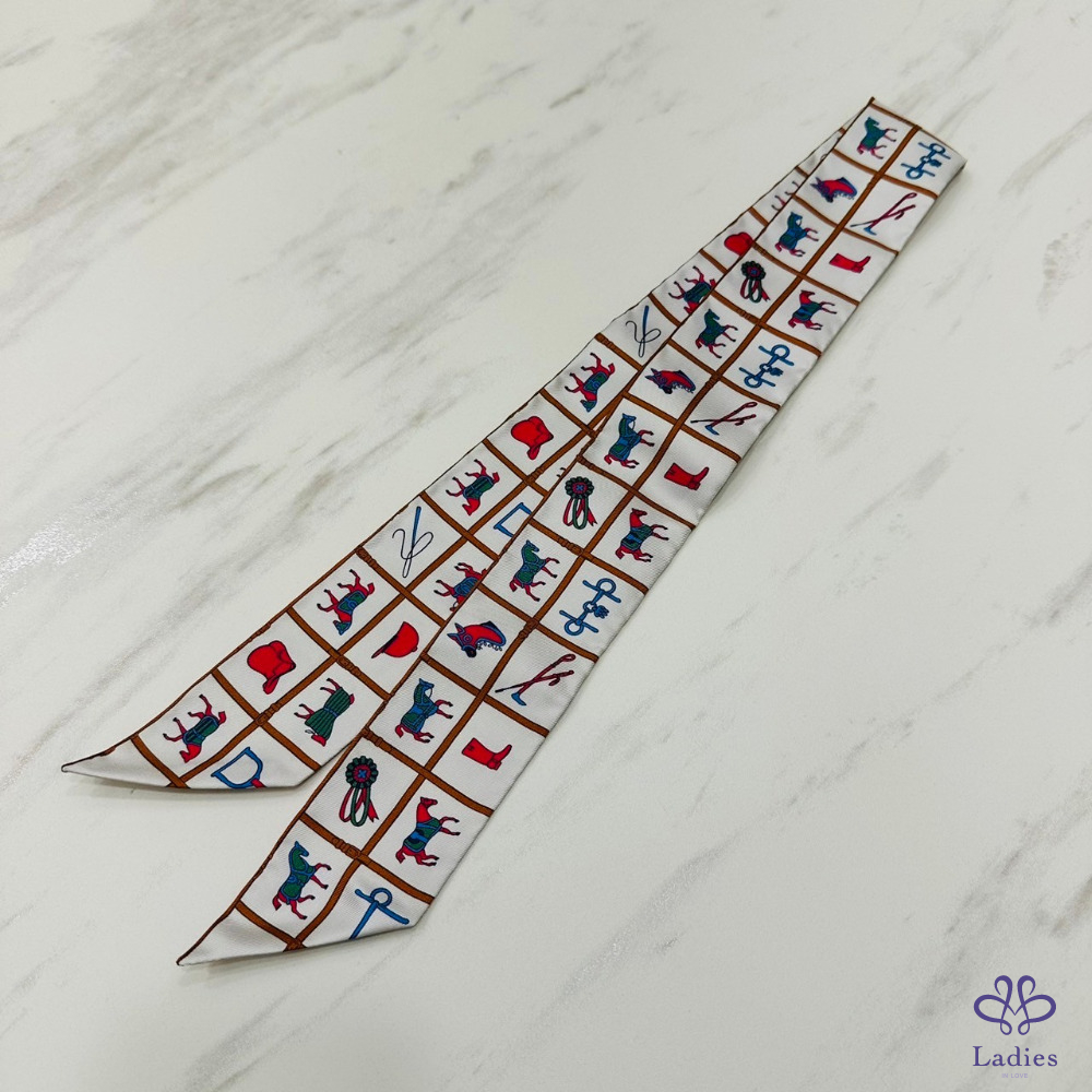 售 Hermes Couvertures et Tenues de Jour Twilly 愛馬仕駿馬的披掛 奶油/棕/玫瑰 綁帶長絲巾