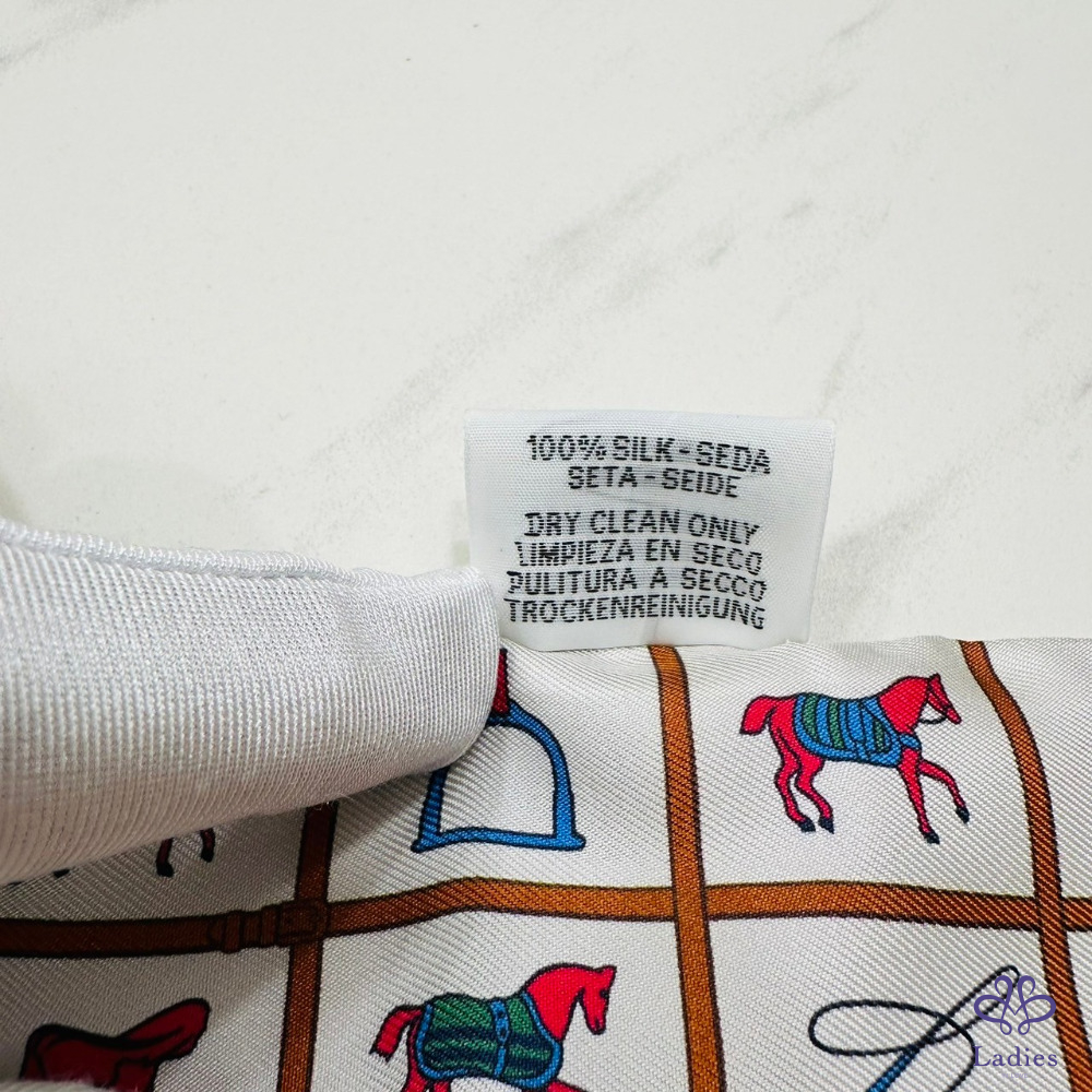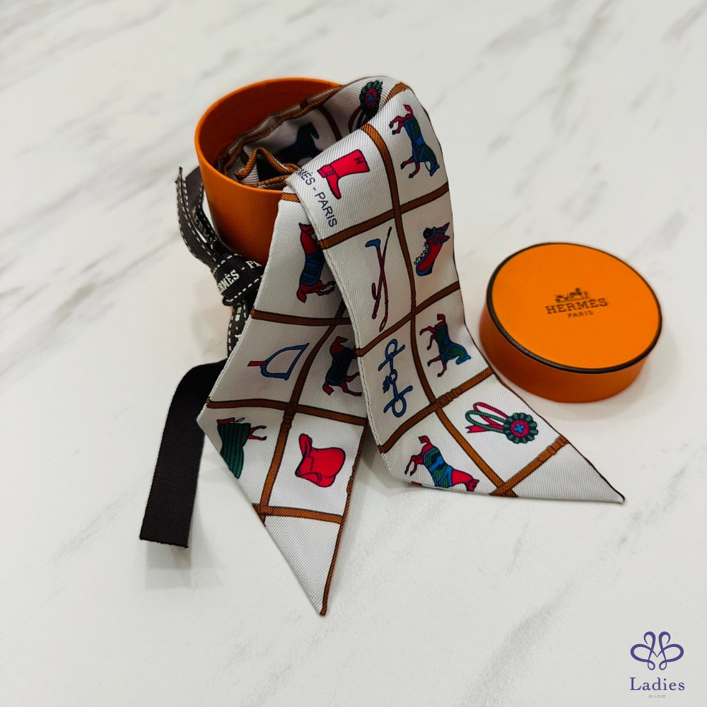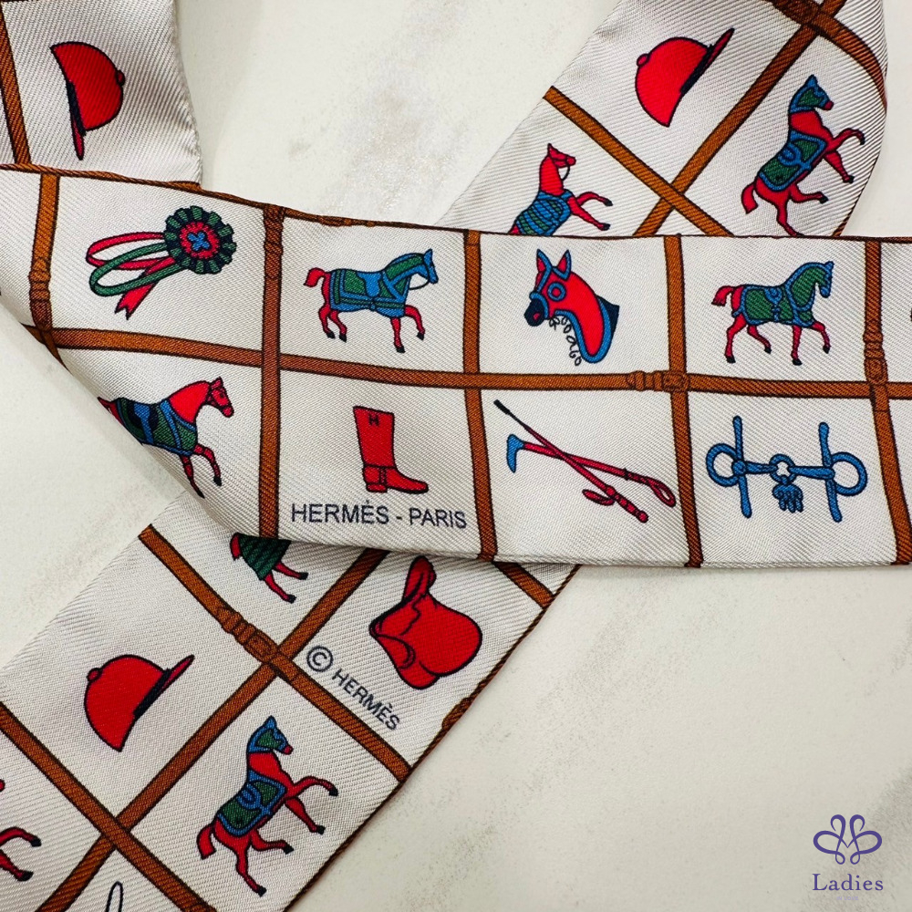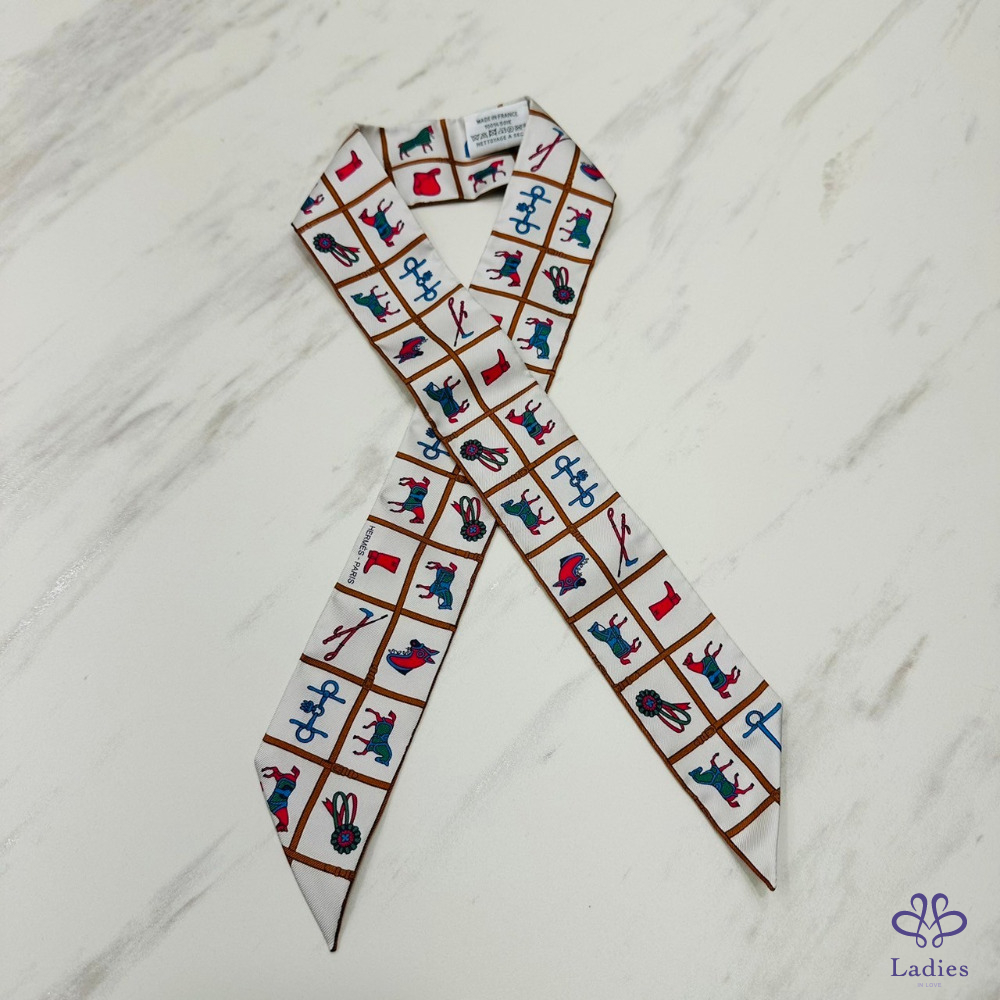 售 Hermes Couvertures et Tenues de Jour Twilly 愛馬仕駿馬的披掛 奶油/棕/玫瑰 綁帶長絲巾