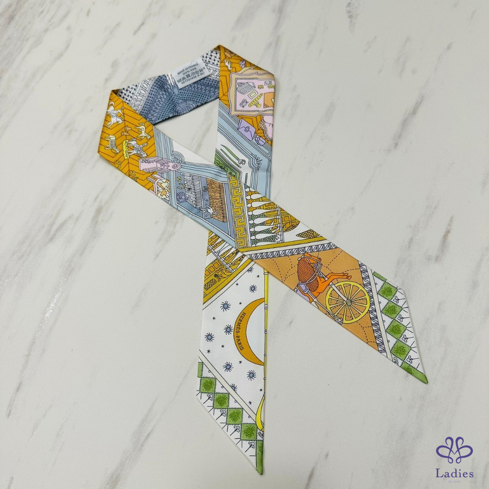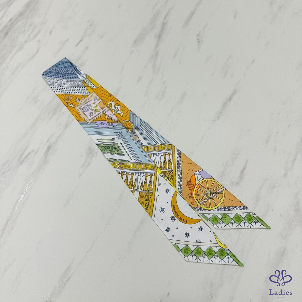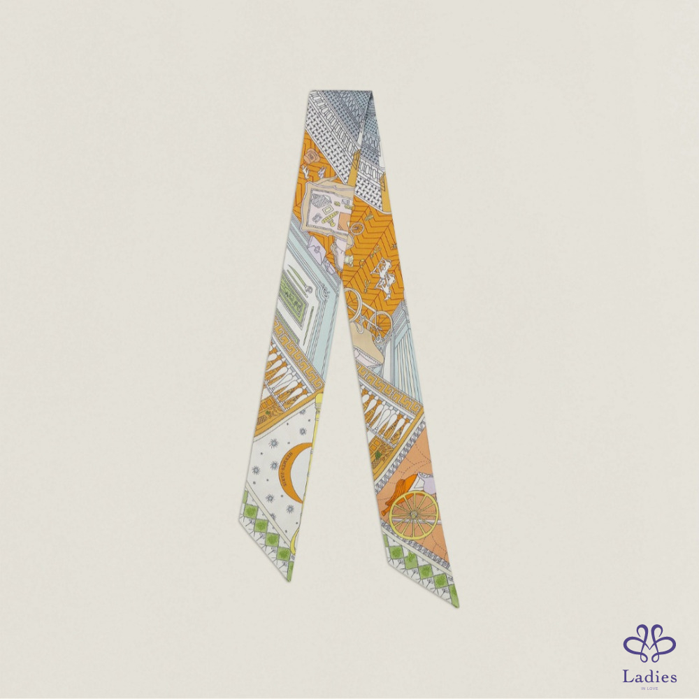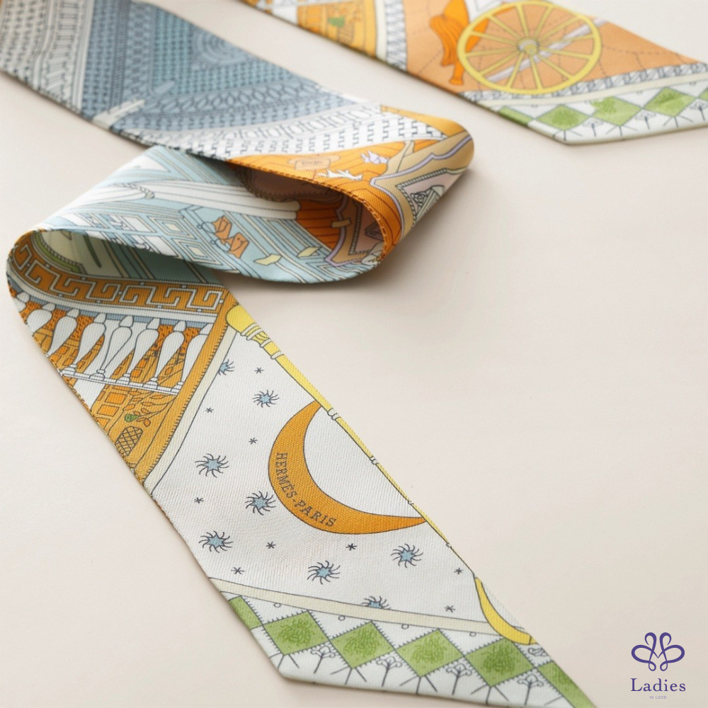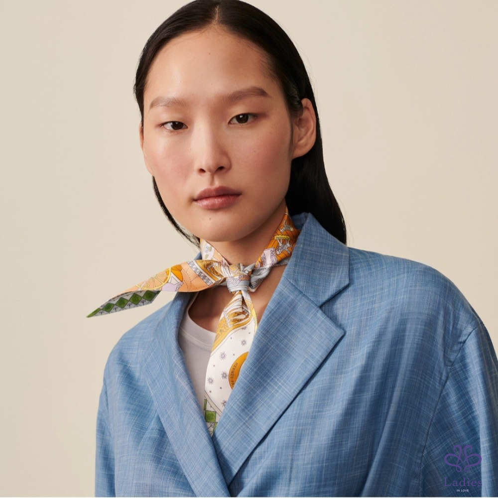 售 Hermes Objets de Curiosite Twilly x gris bleuté/miel/blanc 愛馬仕好奇心(奇珍異寶)藍灰/蜂蜜/白 綁帶長絲巾