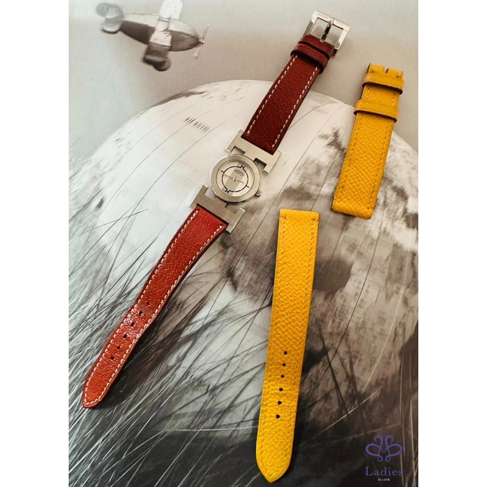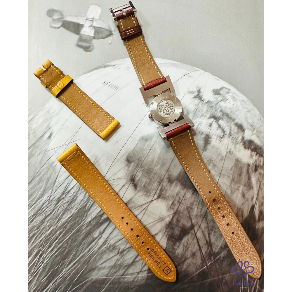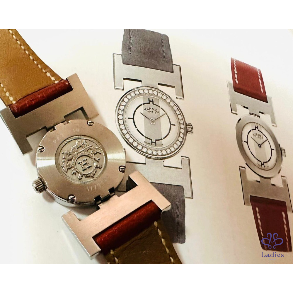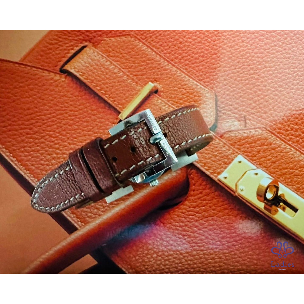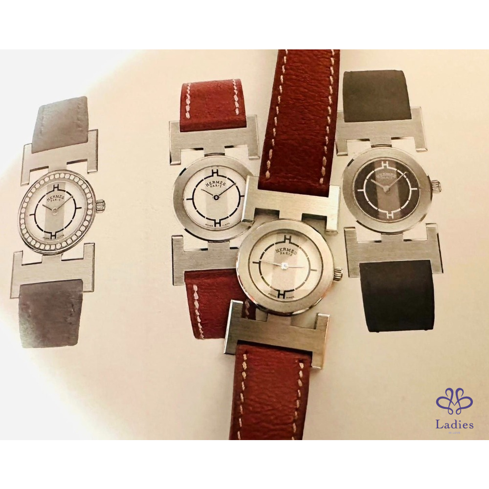 ~HERMES 雙H銀色框配駝紅色錶帶 石英錶