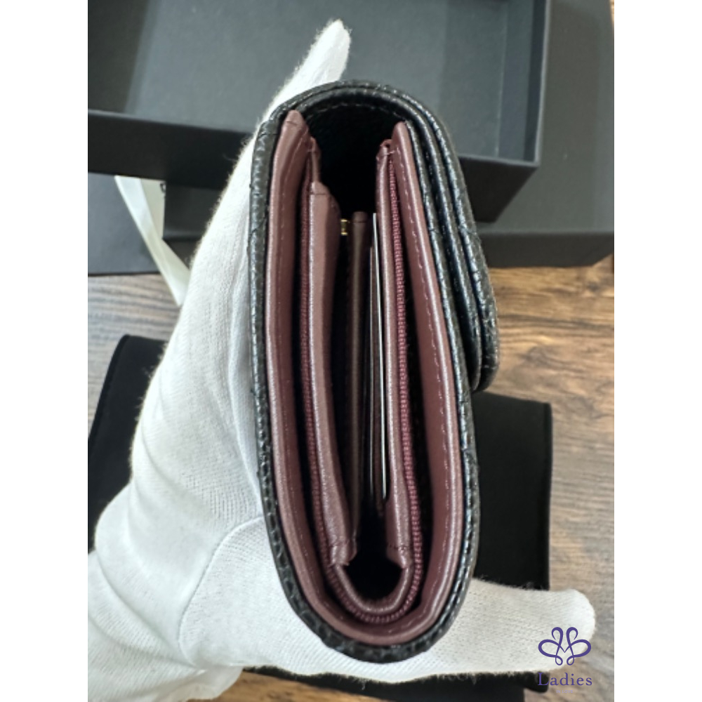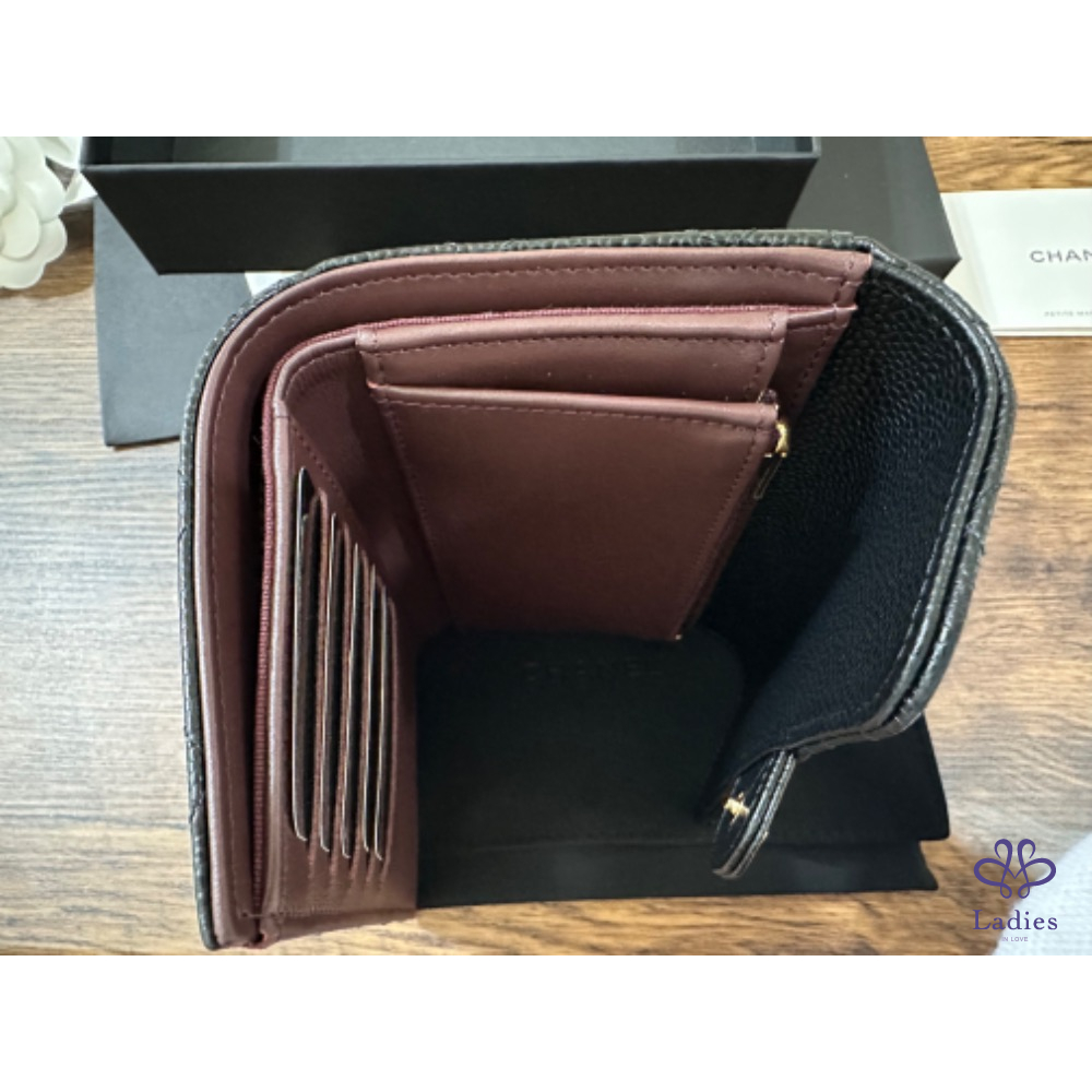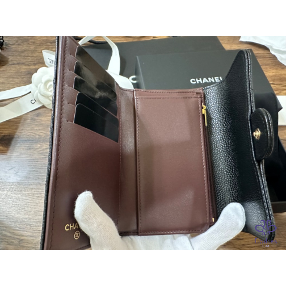 產品信息 Chanel 經典荔枝紋 三折皮夾/中夾 - 全新全配 - 牛皮黑金 經典熱門款式,照片如圖都有實際拍出 新款雷標 附:紙袋、黑盒、防塵袋、緞帶、山茶花、小卡、購證影本去個資 台北桃園新竹台中可面交 可郵寄、店到店、宅配