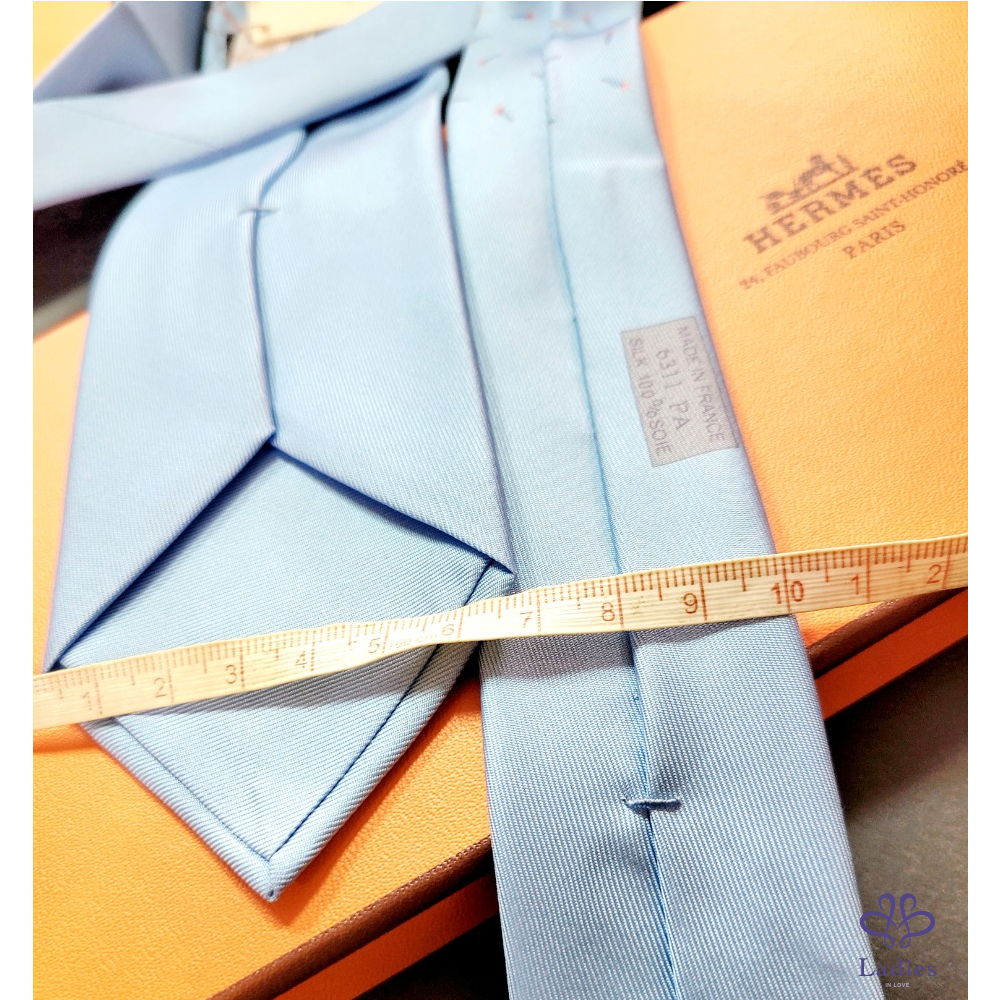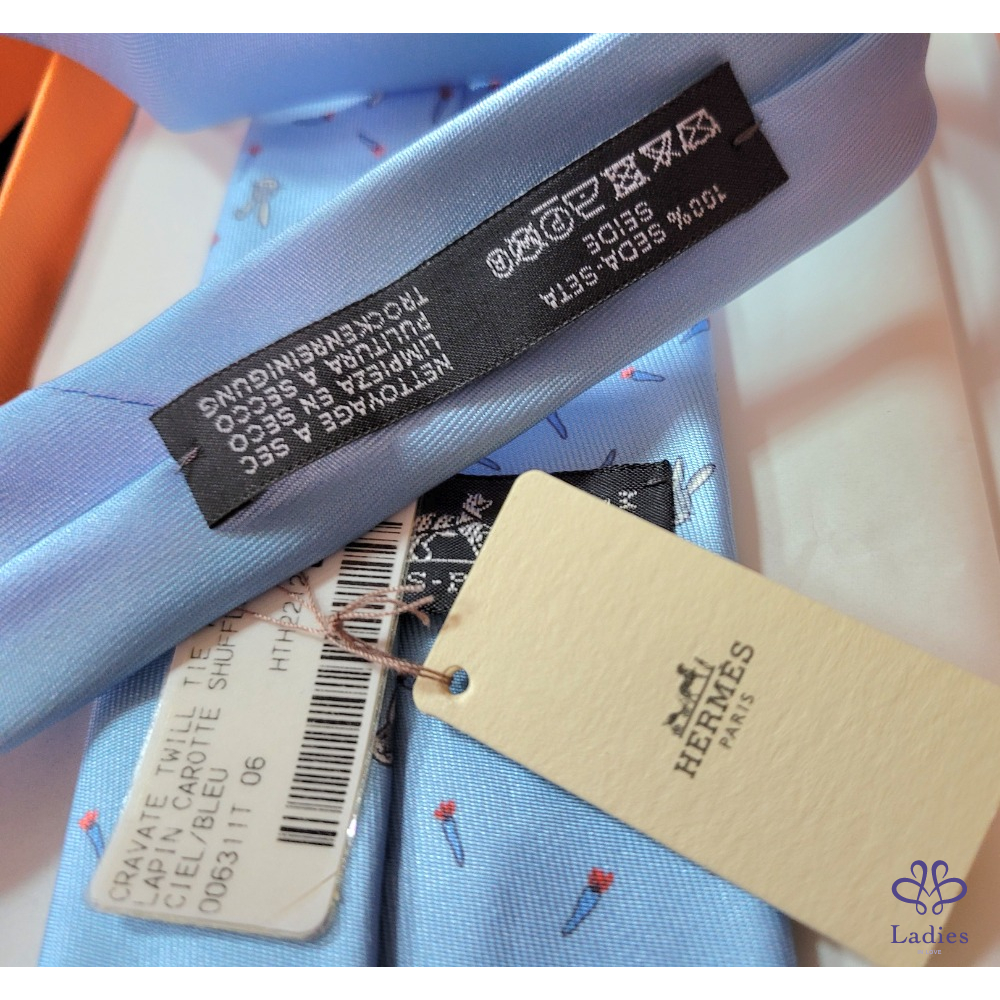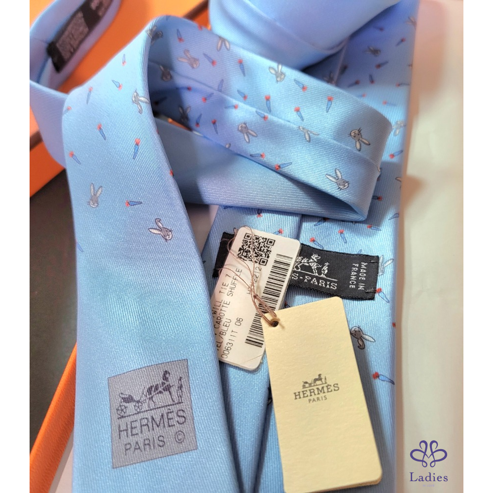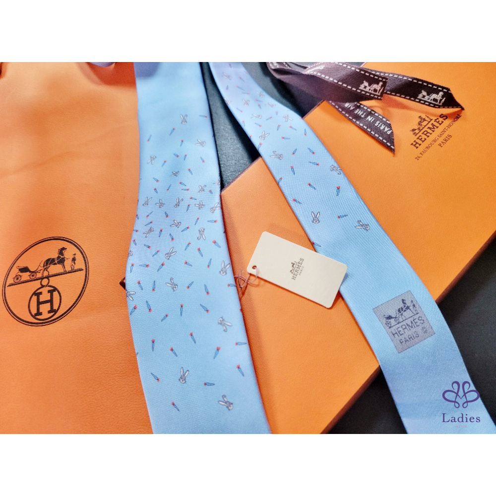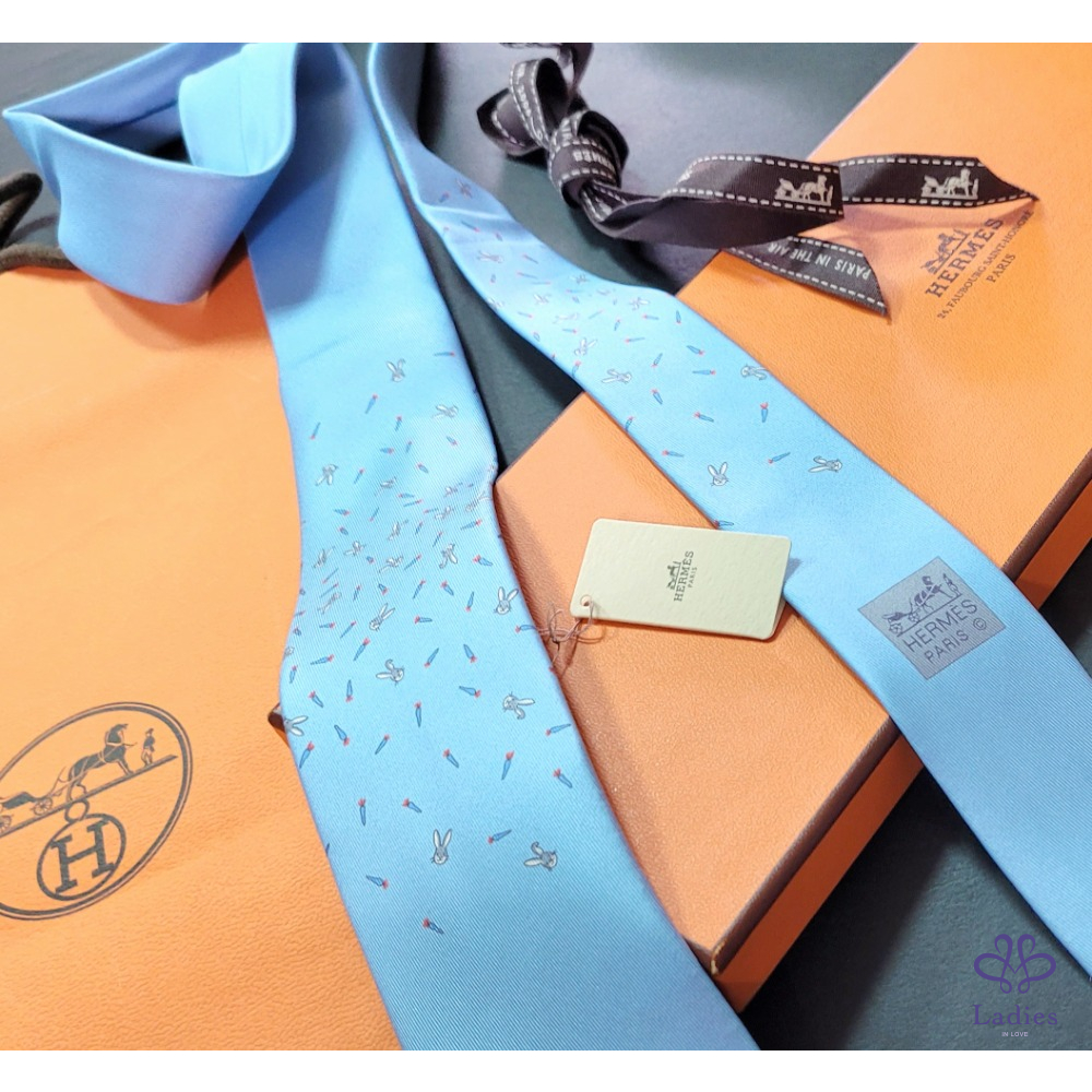 ~HERMES 全新 銀色閃淡天藍色 兔子圖案領帶