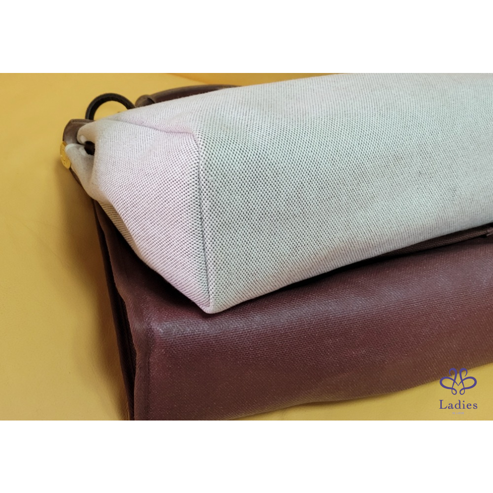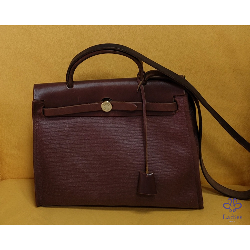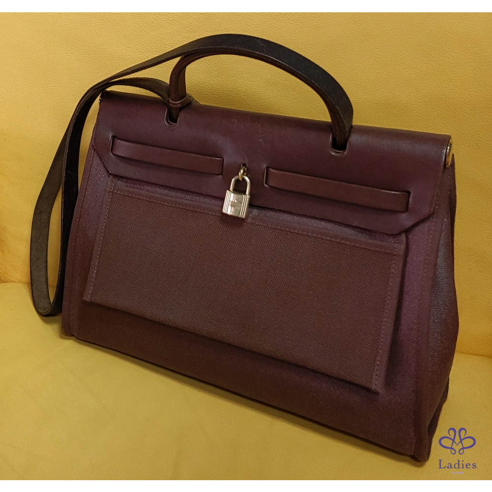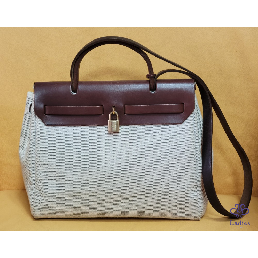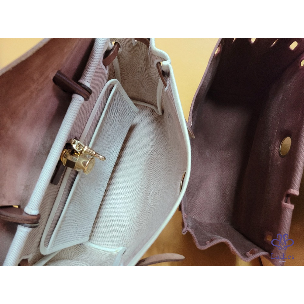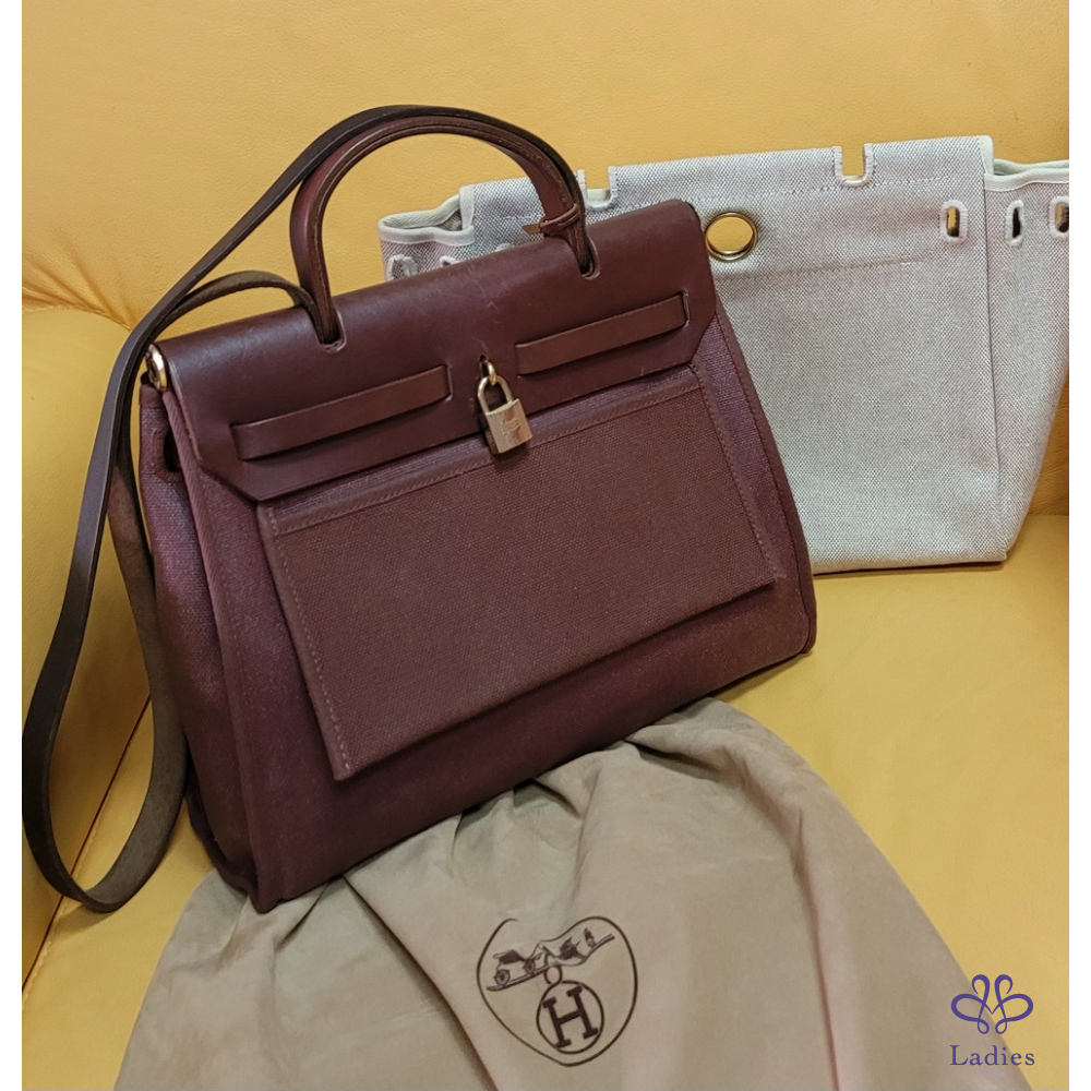 ~HERMES HERBAG 金扣 咖啡皮革 咖啡色+米白色雙包身 手提/肩背包(小號)