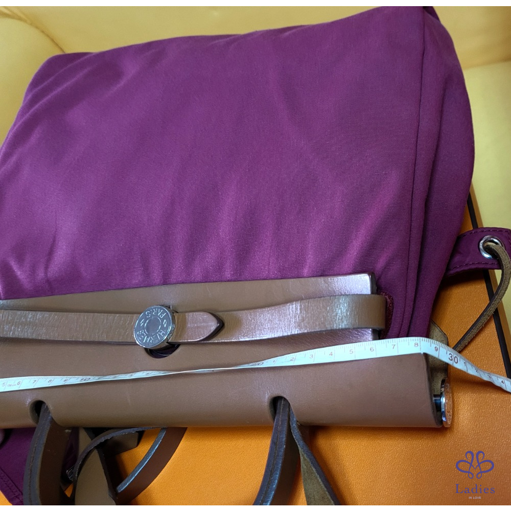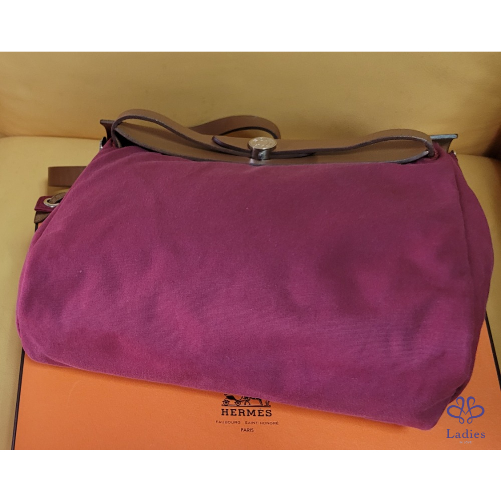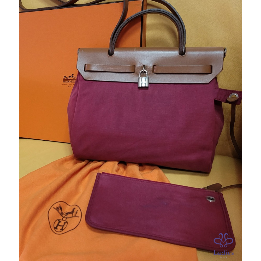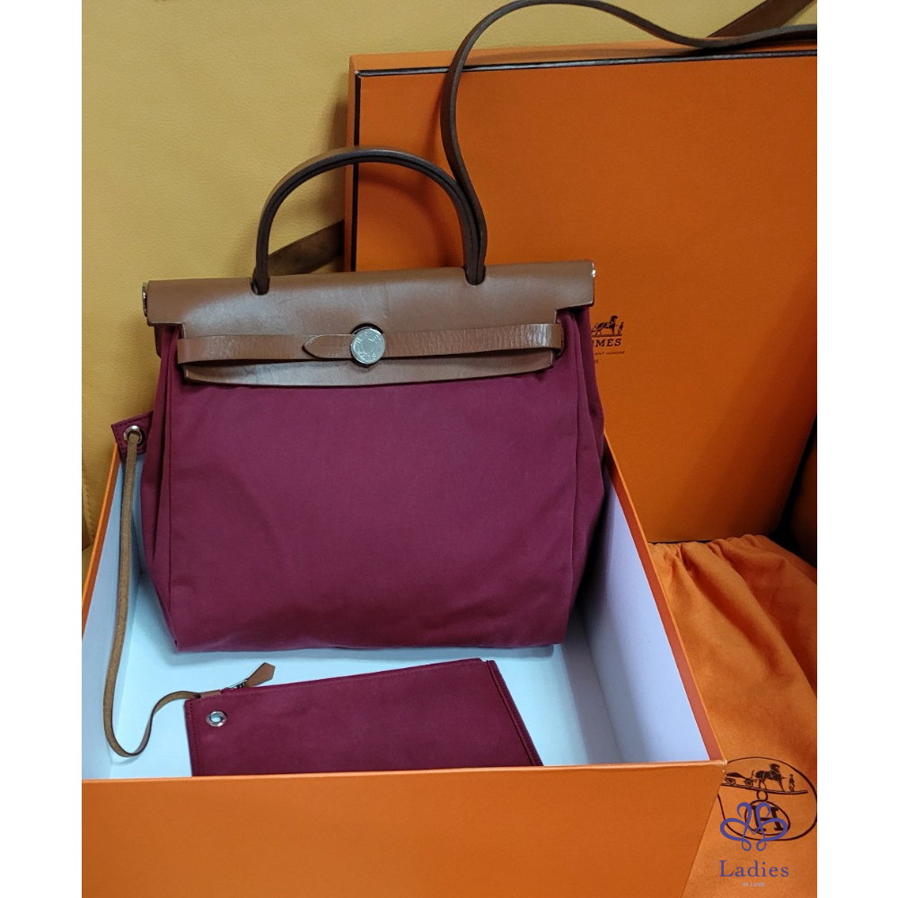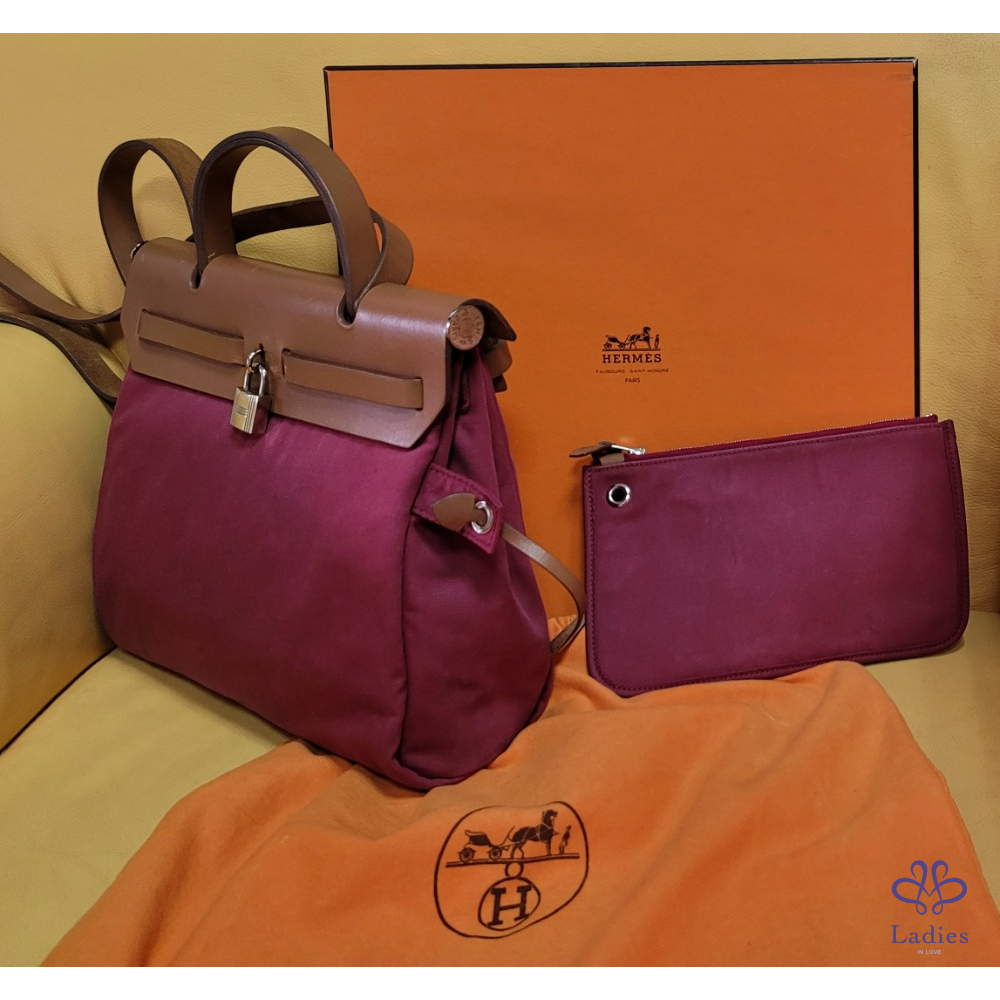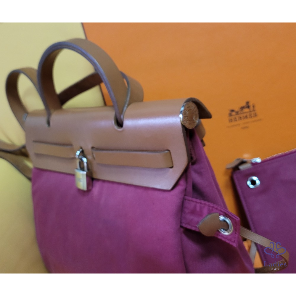 ~HERMES HERBAG 銀扣 駝革+桃紅包身+小長包 手提/肩背包(小號)