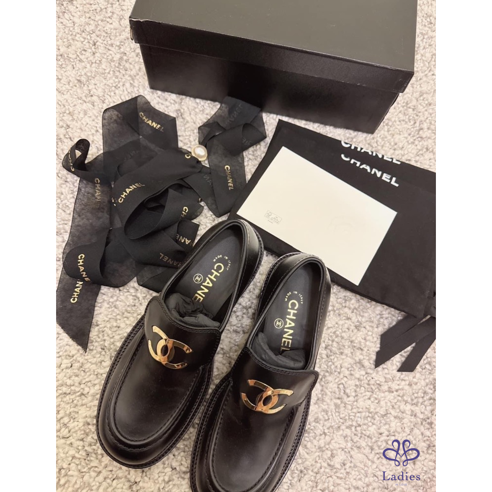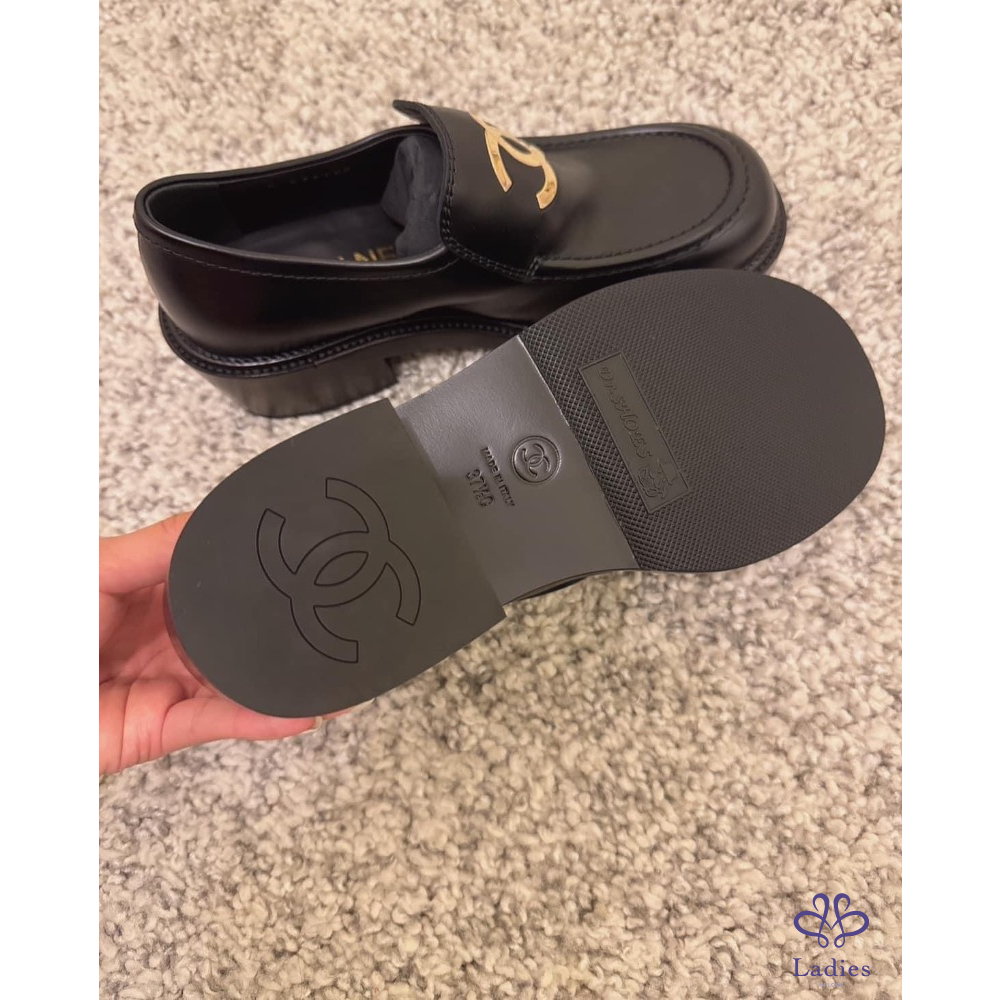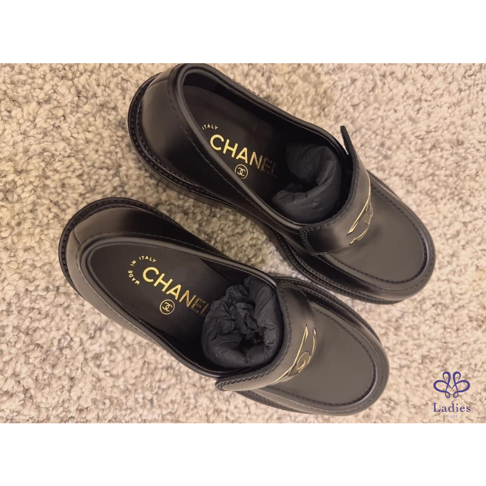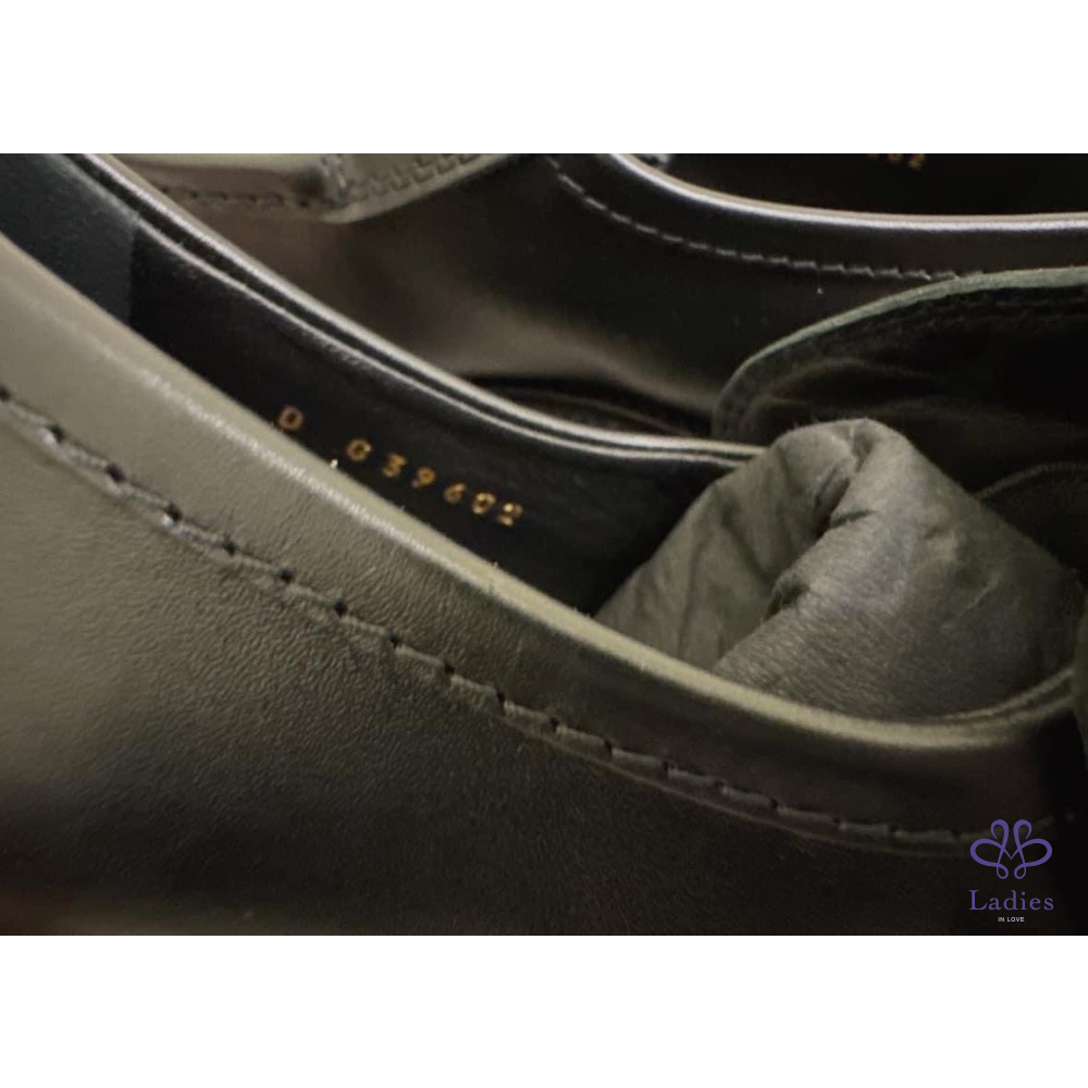 產品信息 (已送老師傅加鞋底 會更好穿) 尺寸參考CHANEL我都穿37號居多 這雙我多拿半號想配襪子 大復古金色的logo鞋面 黑色搭上金色很時髦 增高5.5cm拉長比例 好穿好看 知名代購購入49000 附件:購證影本 鞋盒 防塵袋 紙袋 黑緞帶