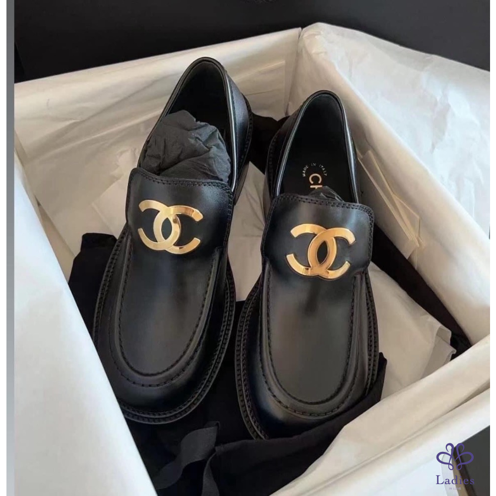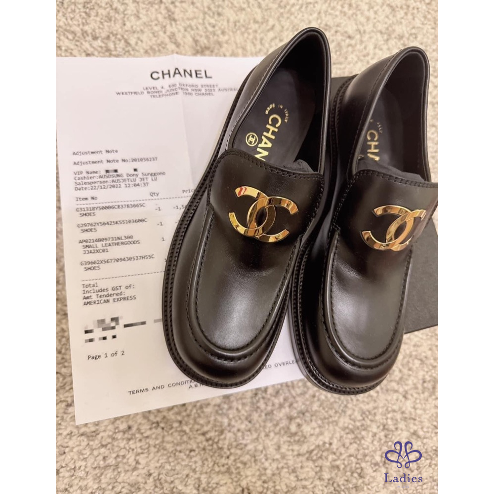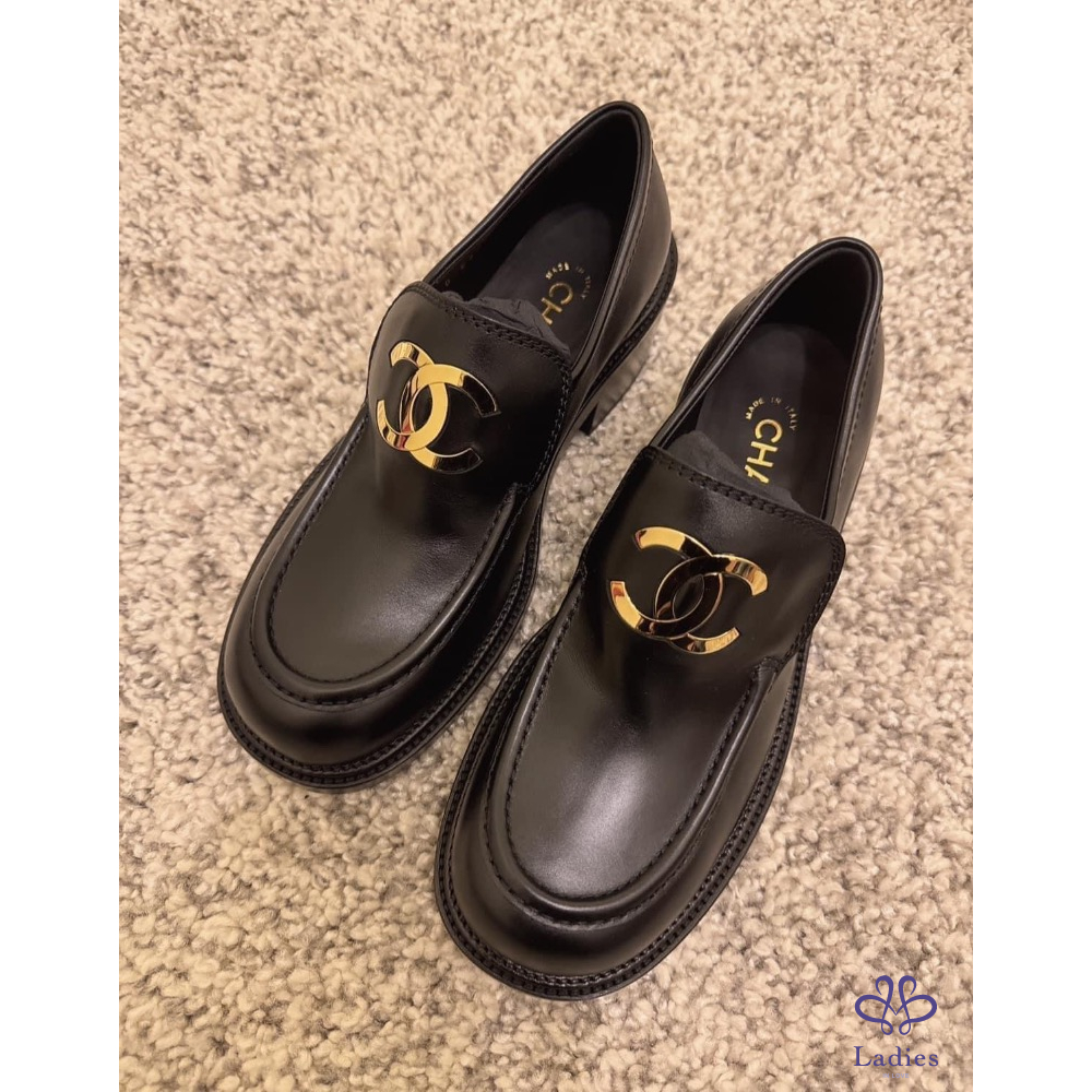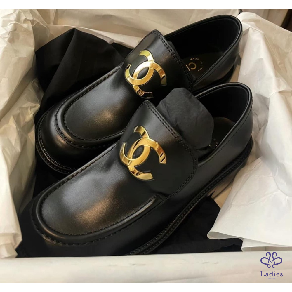 產品信息 (已送老師傅加鞋底 會更好穿) 尺寸參考CHANEL我都穿37號居多 這雙我多拿半號想配襪子 大復古金色的logo鞋面 黑色搭上金色很時髦 增高5.5cm拉長比例 好穿好看 知名代購購入49000 附件:購證影本 鞋盒 防塵袋 紙袋 黑緞帶