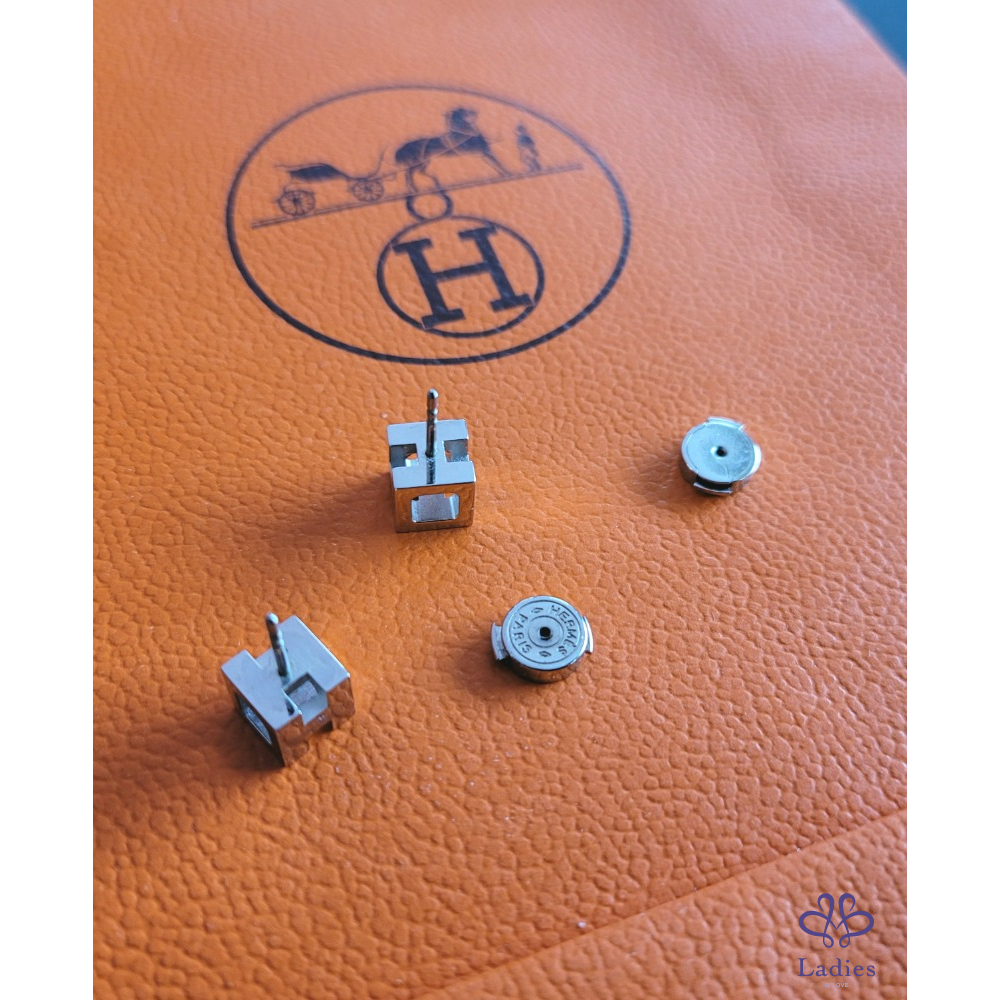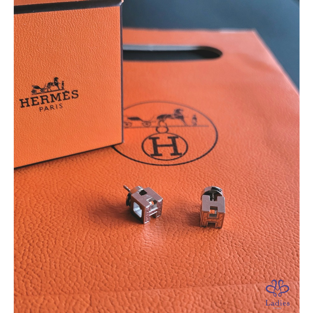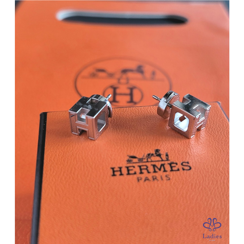~HERMES 原廠盒 極新極美 銀色H立方耳環 耳針式