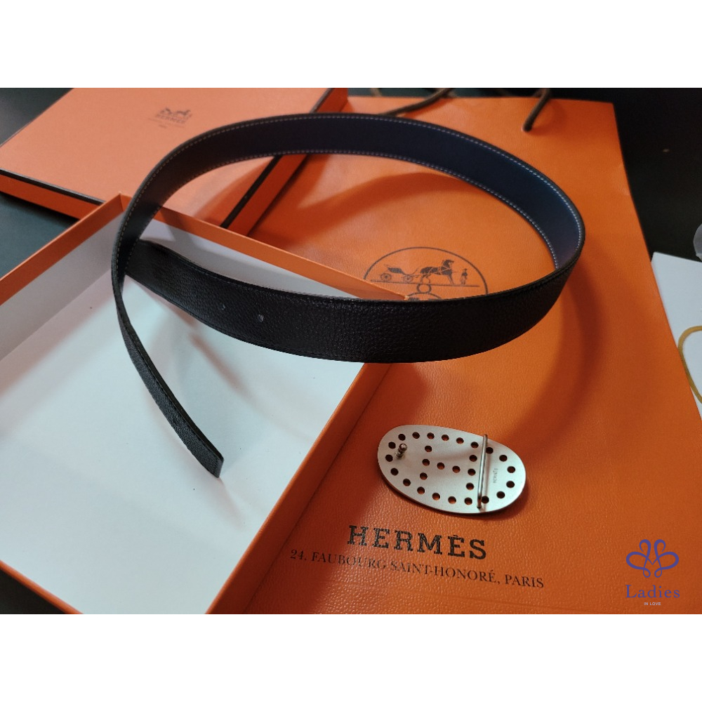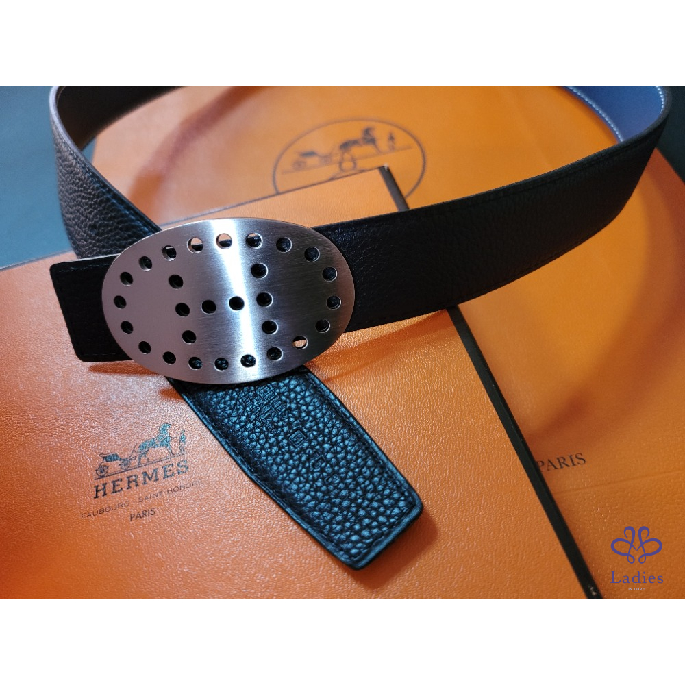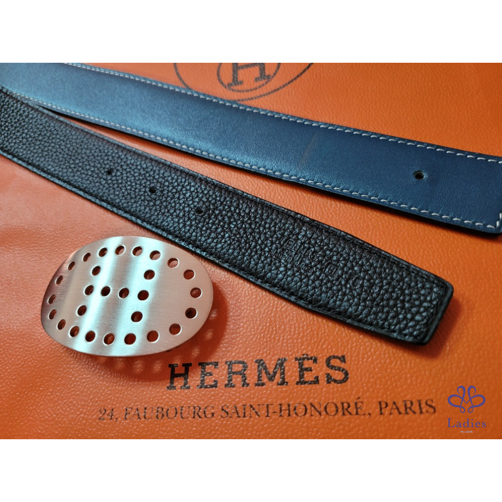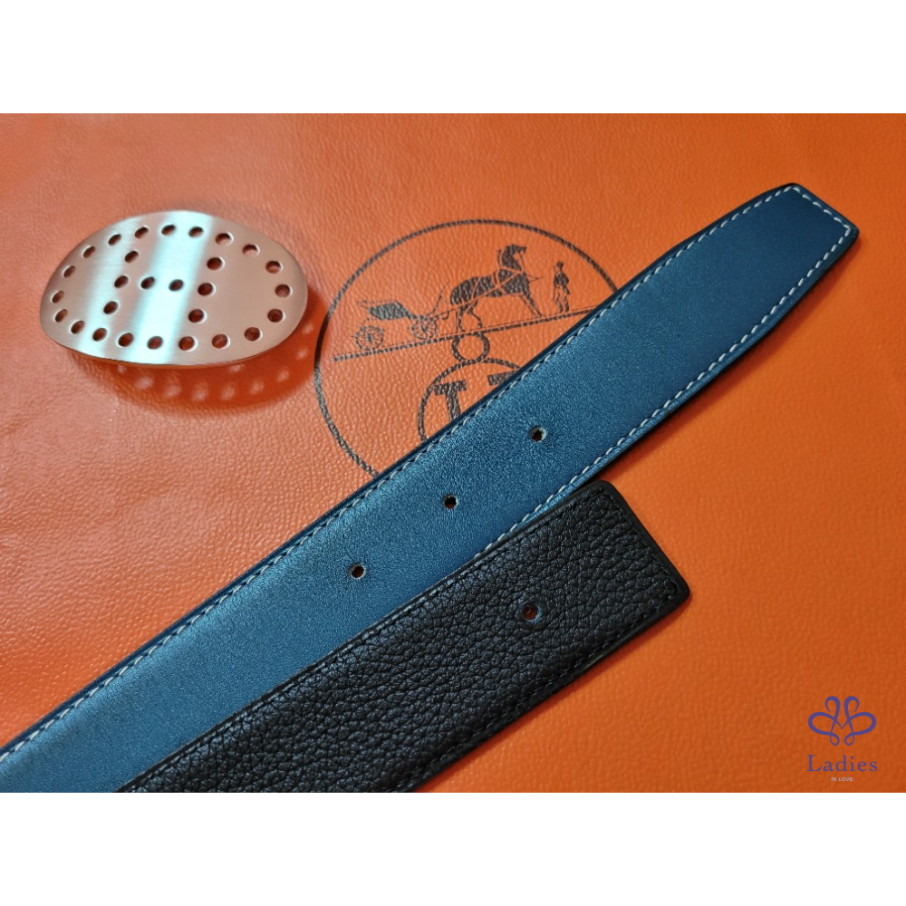 ~HERMES 極新極美 銀橢圓鏤空H扣頭 莫蘭迪色/咖啡色雙面腰帶~75刻印