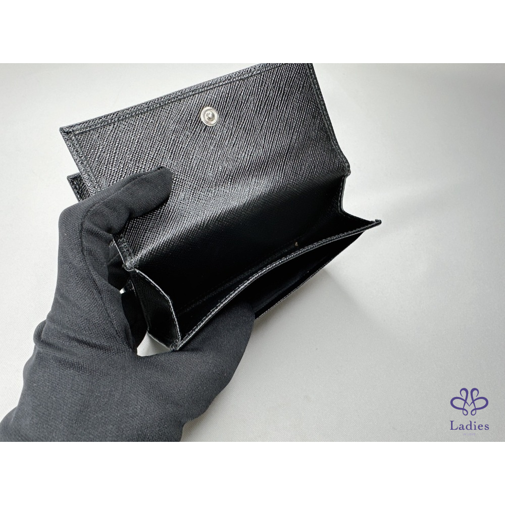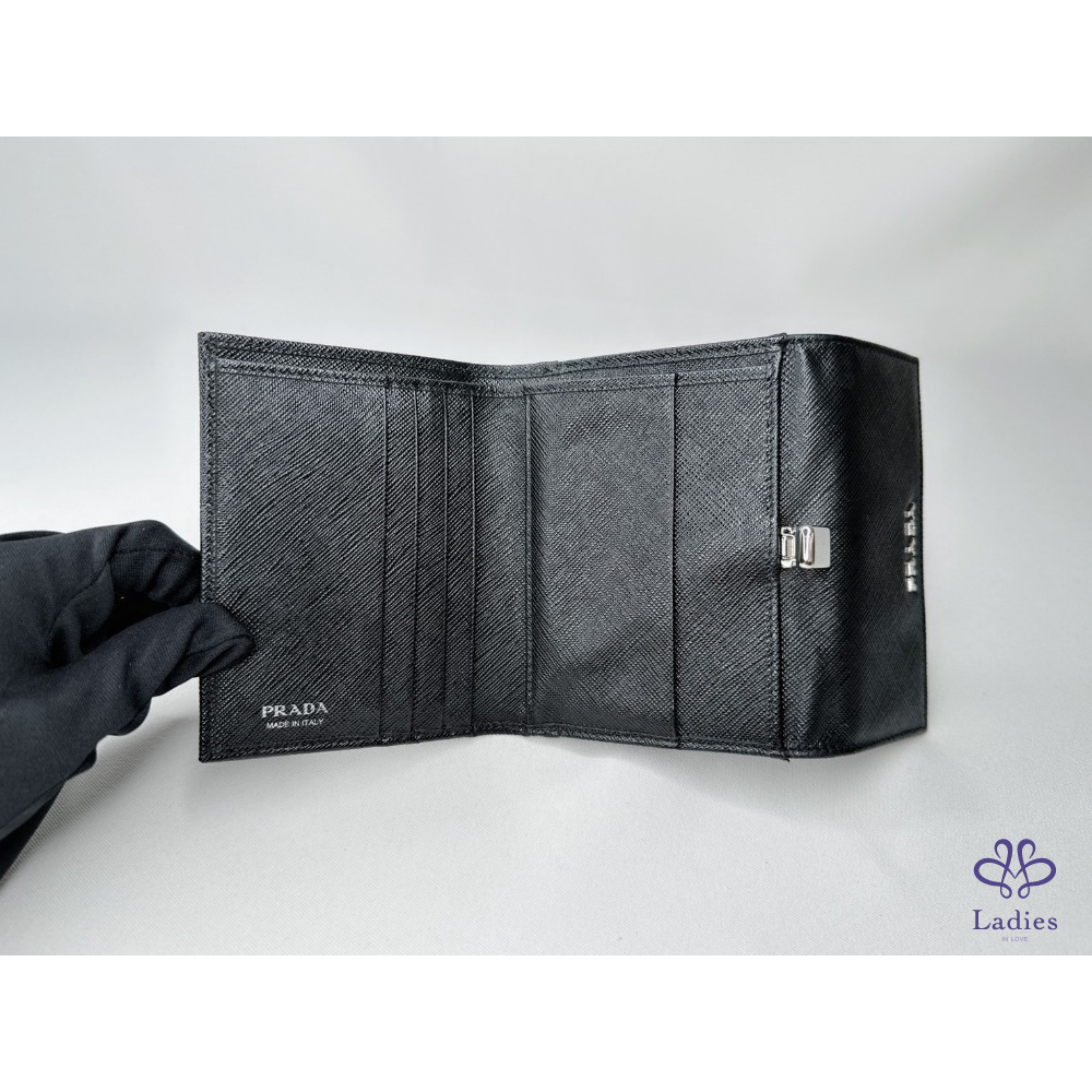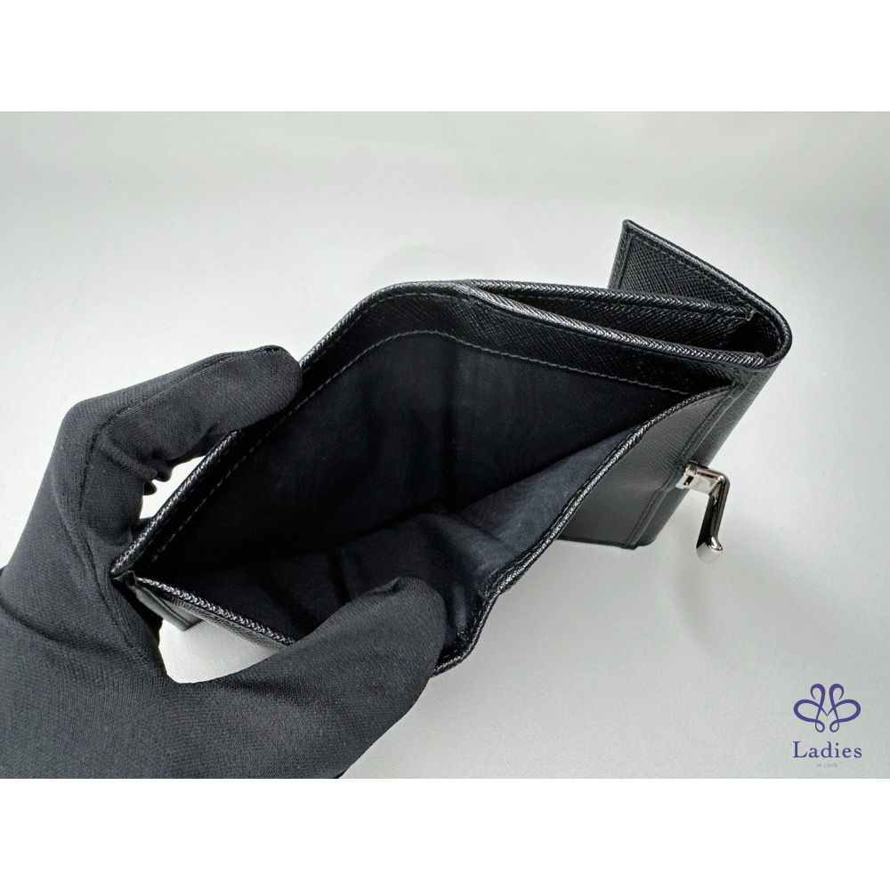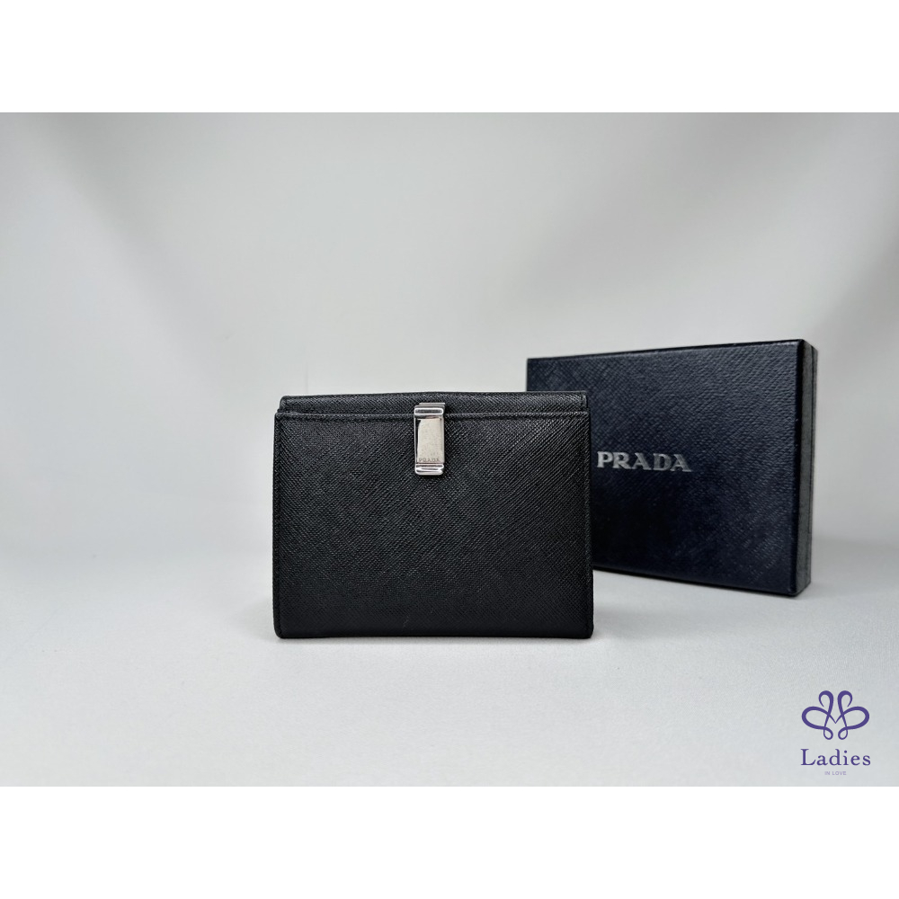 產品信息 【PRADA Saffiano皮革短夾】 錢包的Saffiano皮革十字壓紋設計 與正面的Prada金屬字樣標誌互為經典元素 6個卡夾層 / 1個鈔票層 / 1個扣式零錢袋 整體包況約9成新,二手商品均有正常使用/存放痕跡 型號:1M1002 尺寸:12.5x10cm 附件:原廠盒 #A113033008