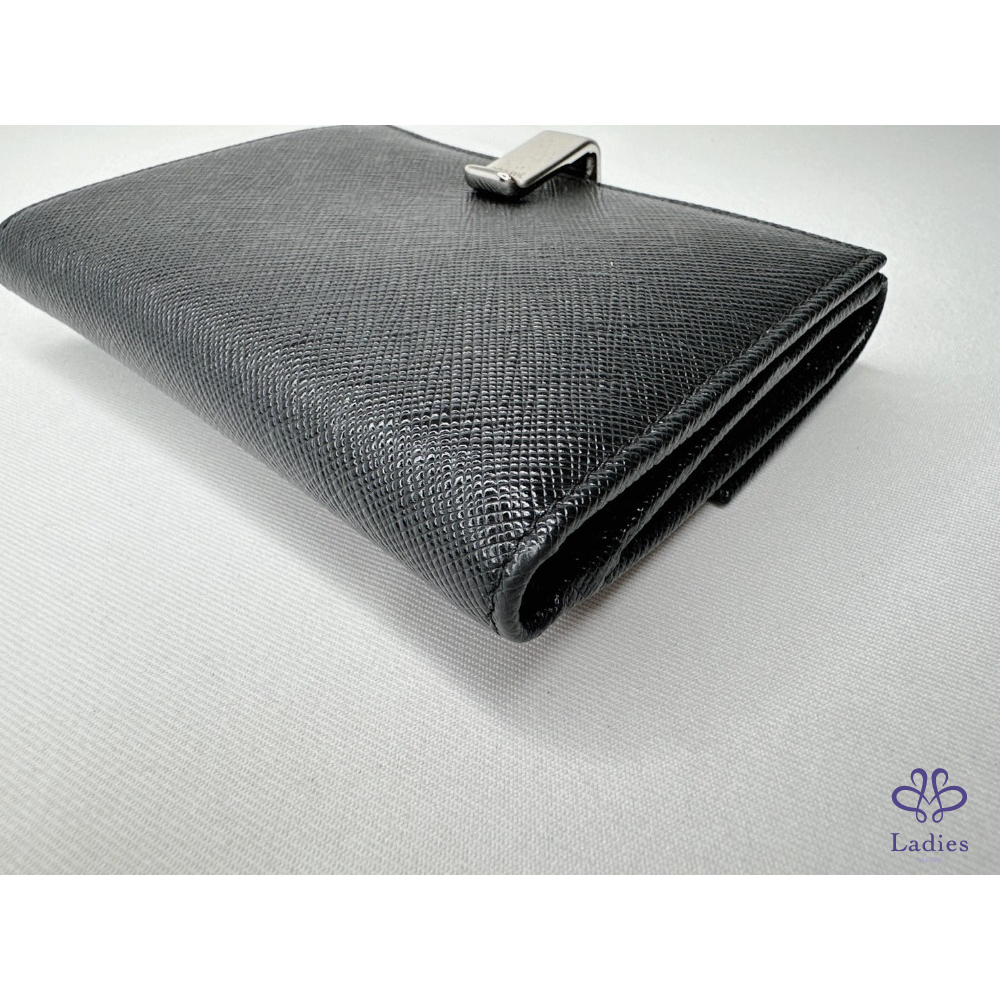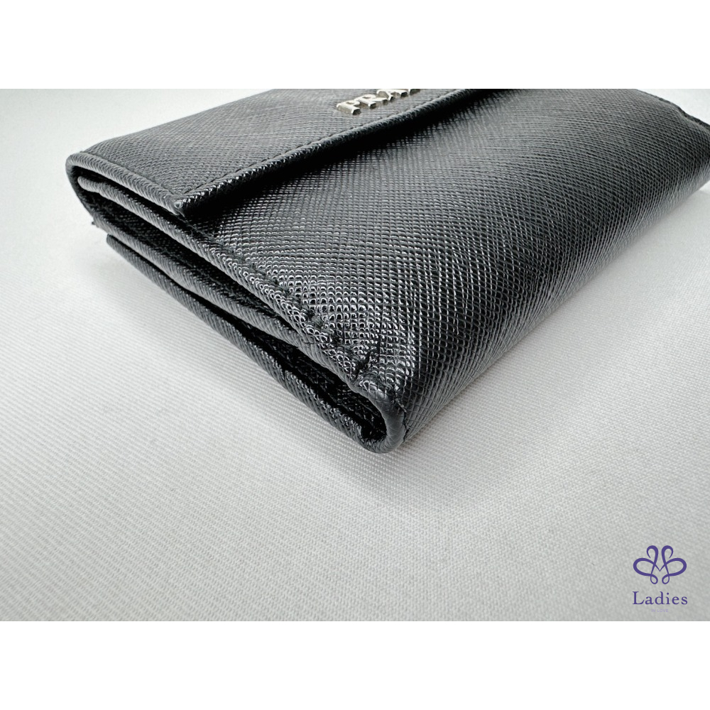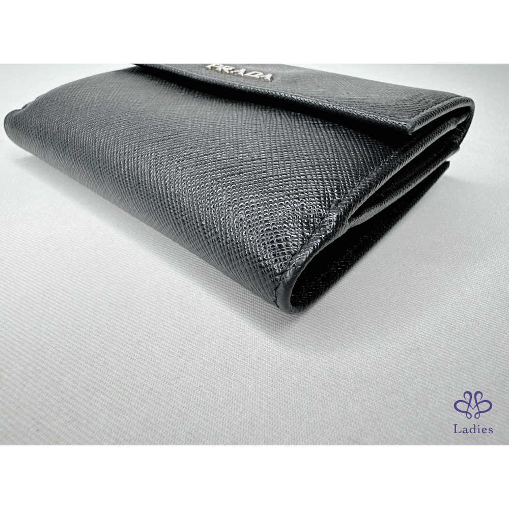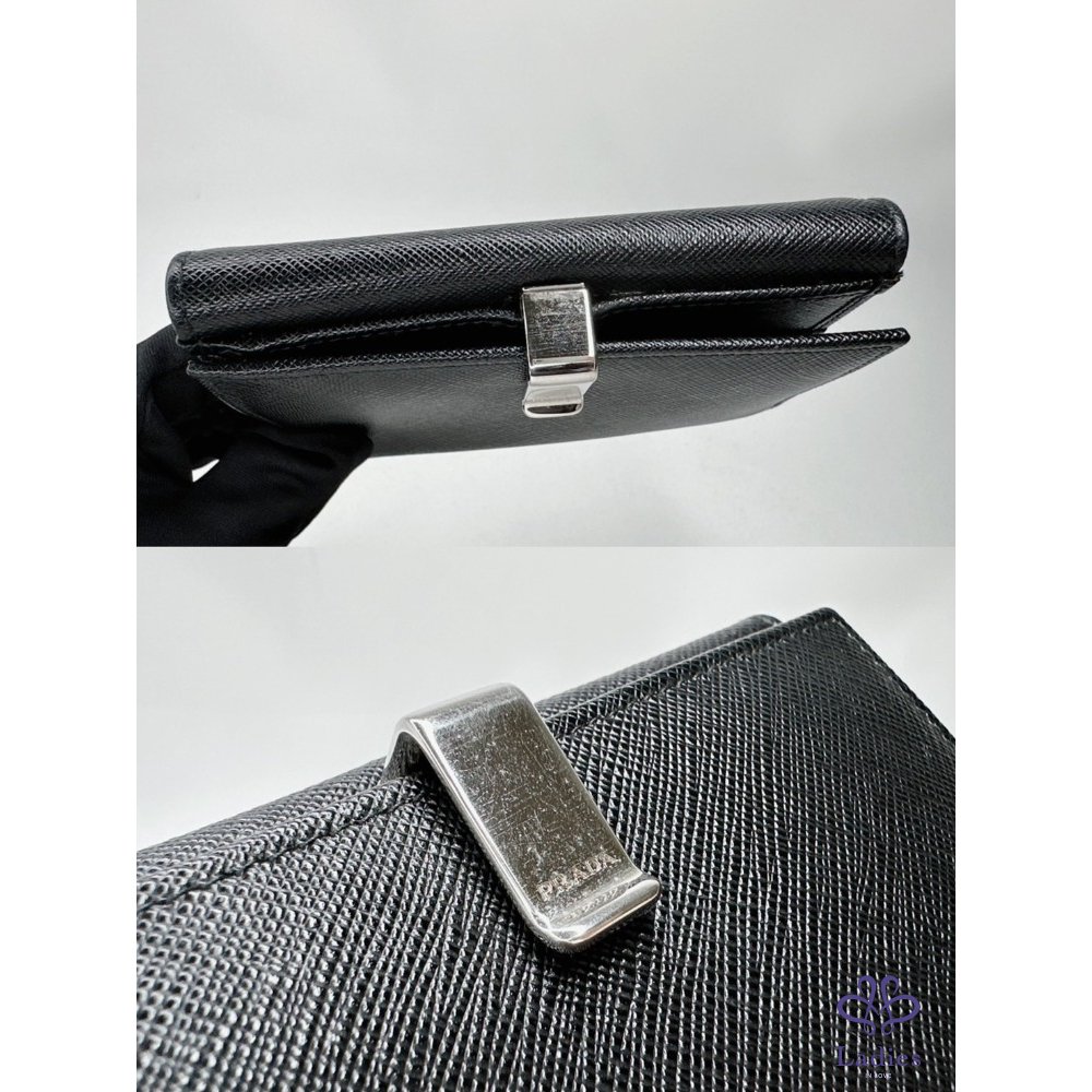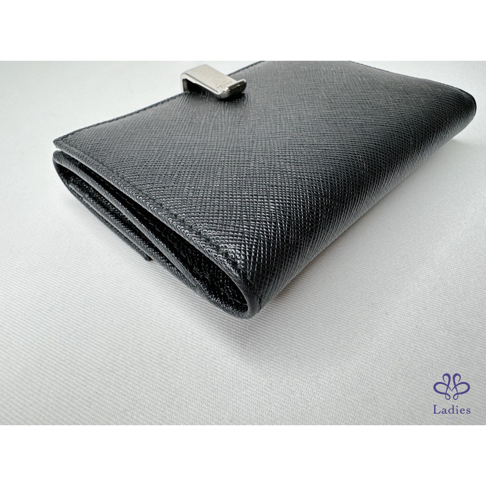 產品信息 【PRADA Saffiano皮革短夾】 錢包的Saffiano皮革十字壓紋設計 與正面的Prada金屬字樣標誌互為經典元素 6個卡夾層 / 1個鈔票層 / 1個扣式零錢袋 整體包況約9成新,二手商品均有正常使用/存放痕跡 型號:1M1002 尺寸:12.5x10cm 附件:原廠盒 #A113033008
