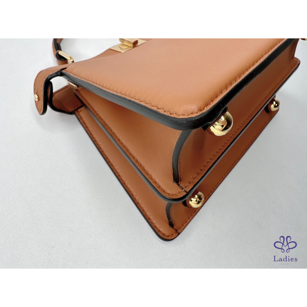 由鋪墊的柔軟棕色納帕皮革製成,兩側飾以經典牛角鎖