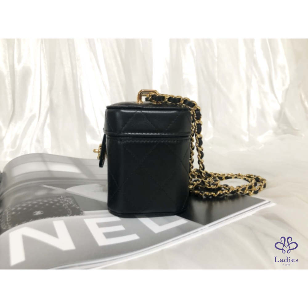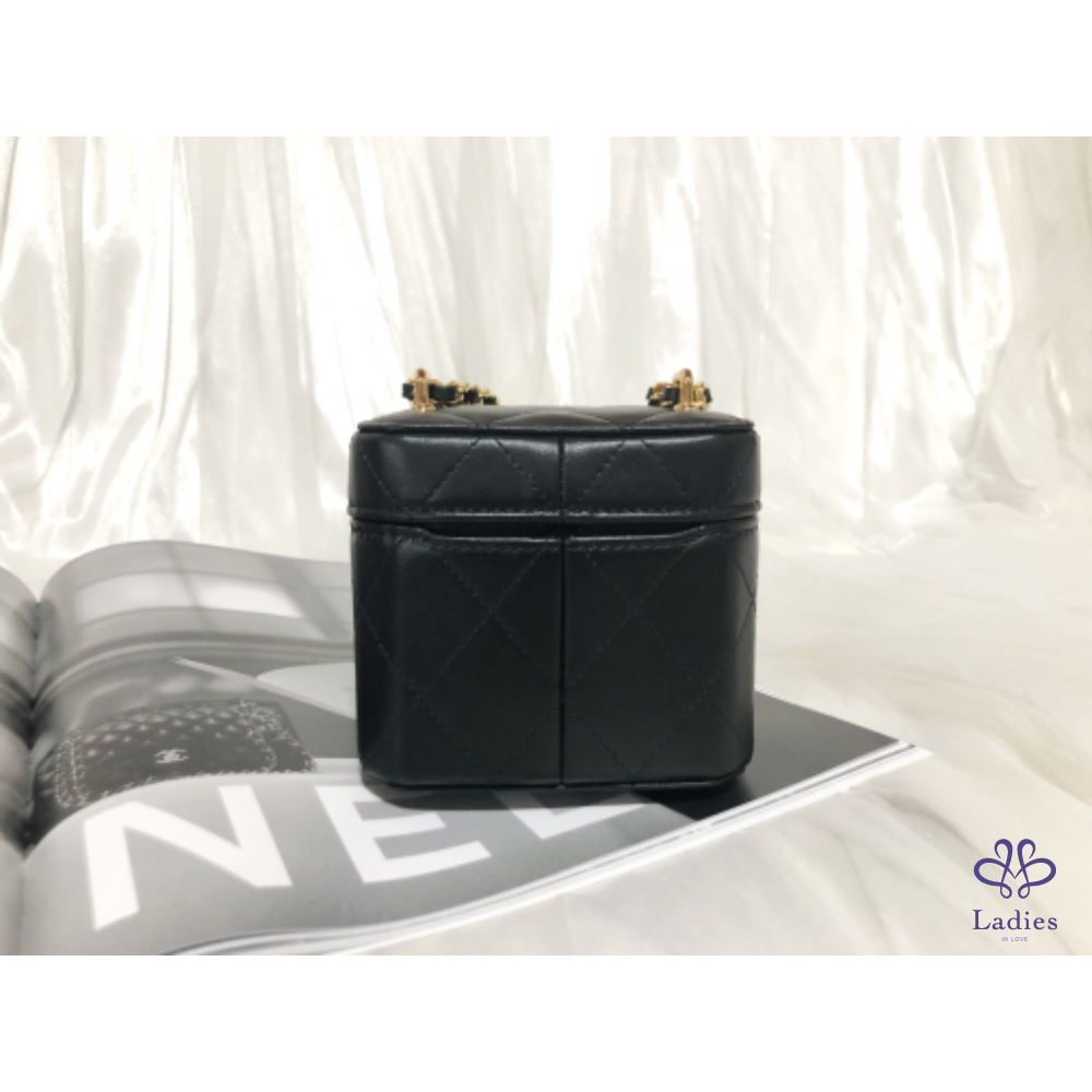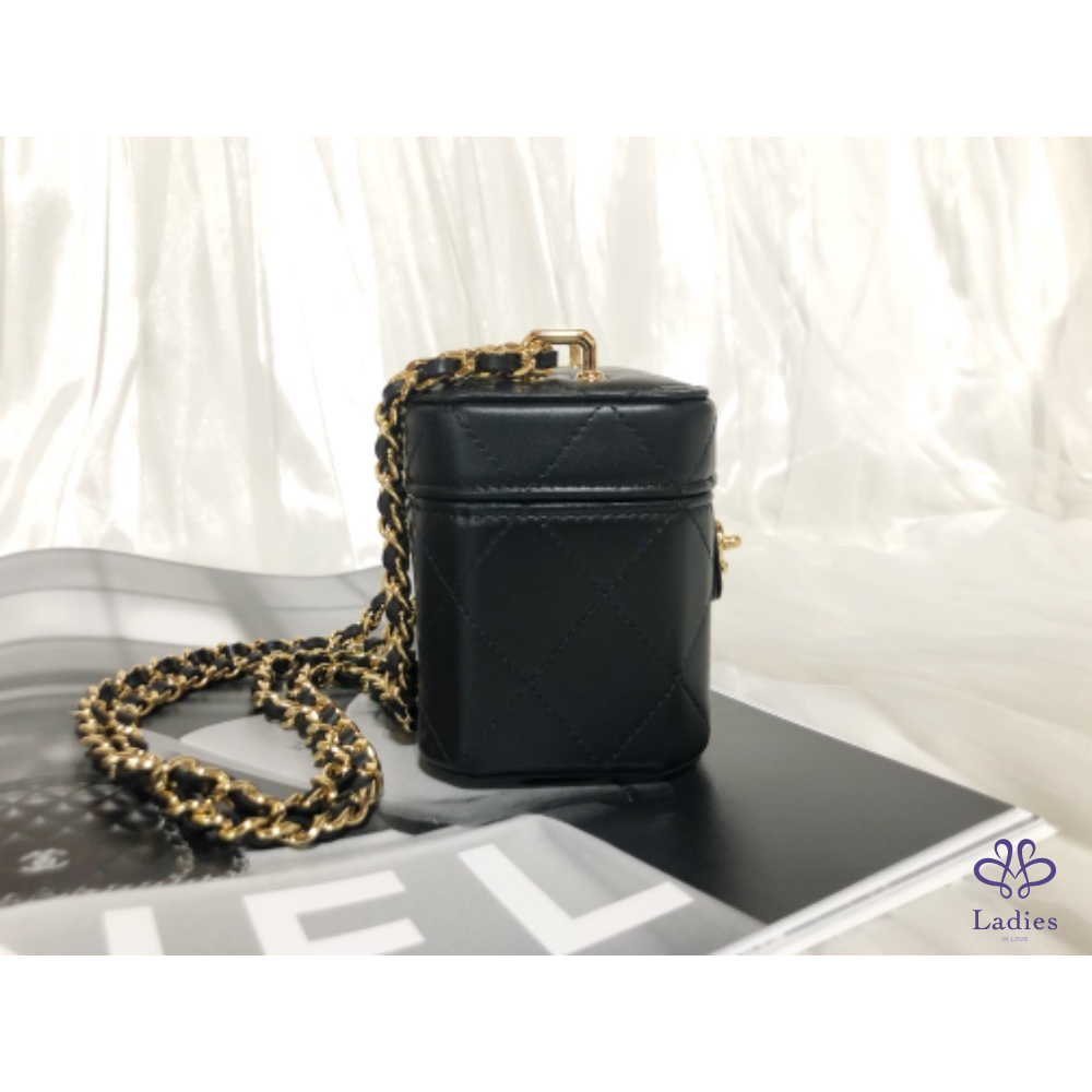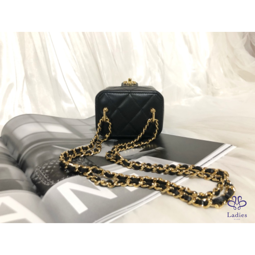 產品信息 復古珠寶盒設計,轉扣logo鎖設計,裡面有鏡子方便補妝,還有放口紅的設計,可手提.肩背.斜背超級精緻可愛,芯片雷標! 尺寸:10.5x9.5x7cm 附:盒子.防塵袋.說明書.緞帶.山茶花.購證.紙袋