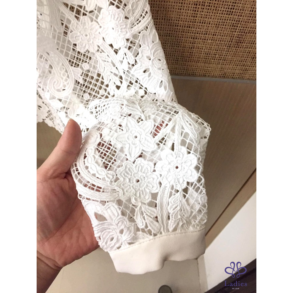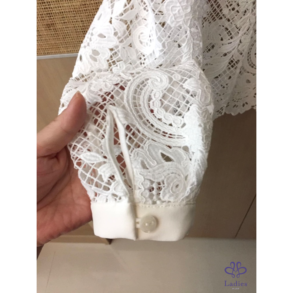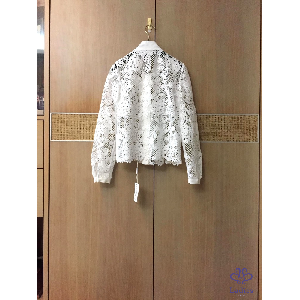 超美的滿版蕾絲鏤空雕花襯衫白色尤其清爽高雅立領絲帶蝴蝶結綁帶隨美女喜歡調整裏面搭配小可愛或洋裝或是當成外套罩衫都很優雅蕾絲是屬於比較硬挺的會有空氣感喔 出清價$5280含運售出不退感謝辛苦管理員謝謝美女們推喔她團